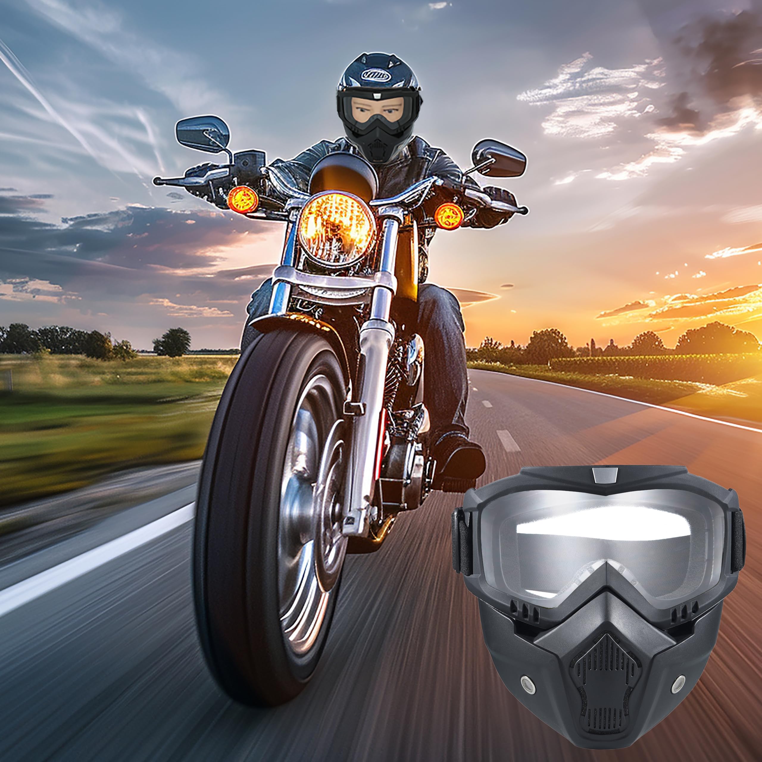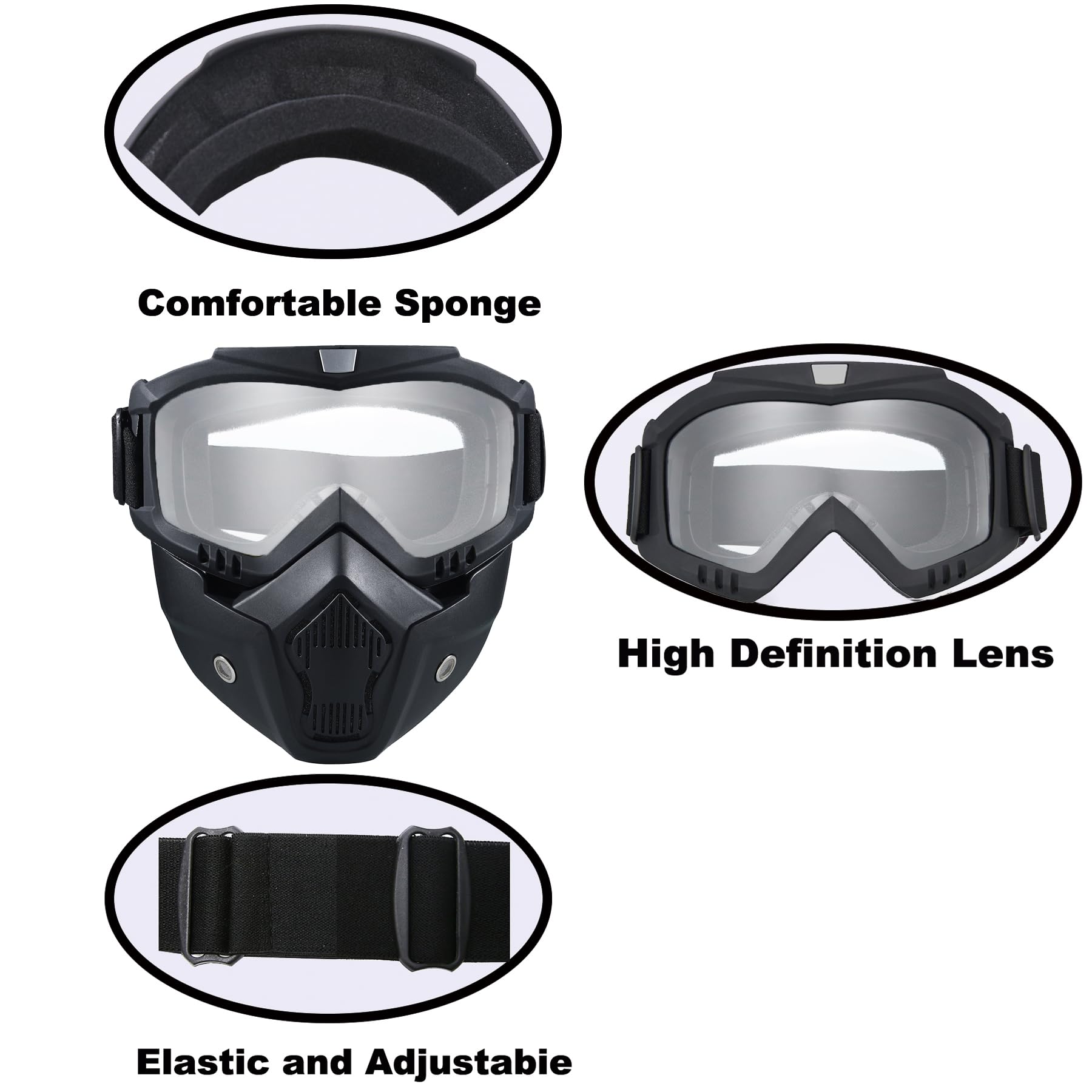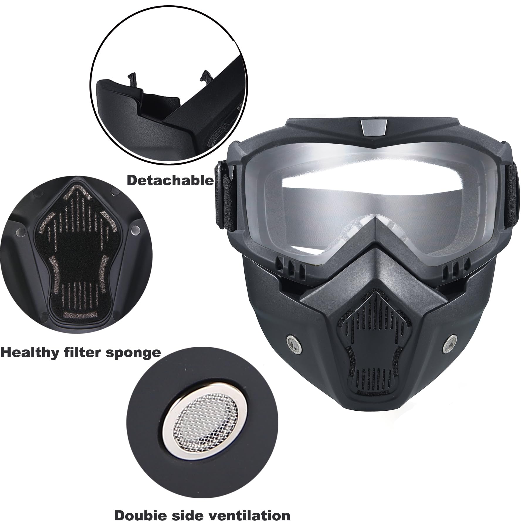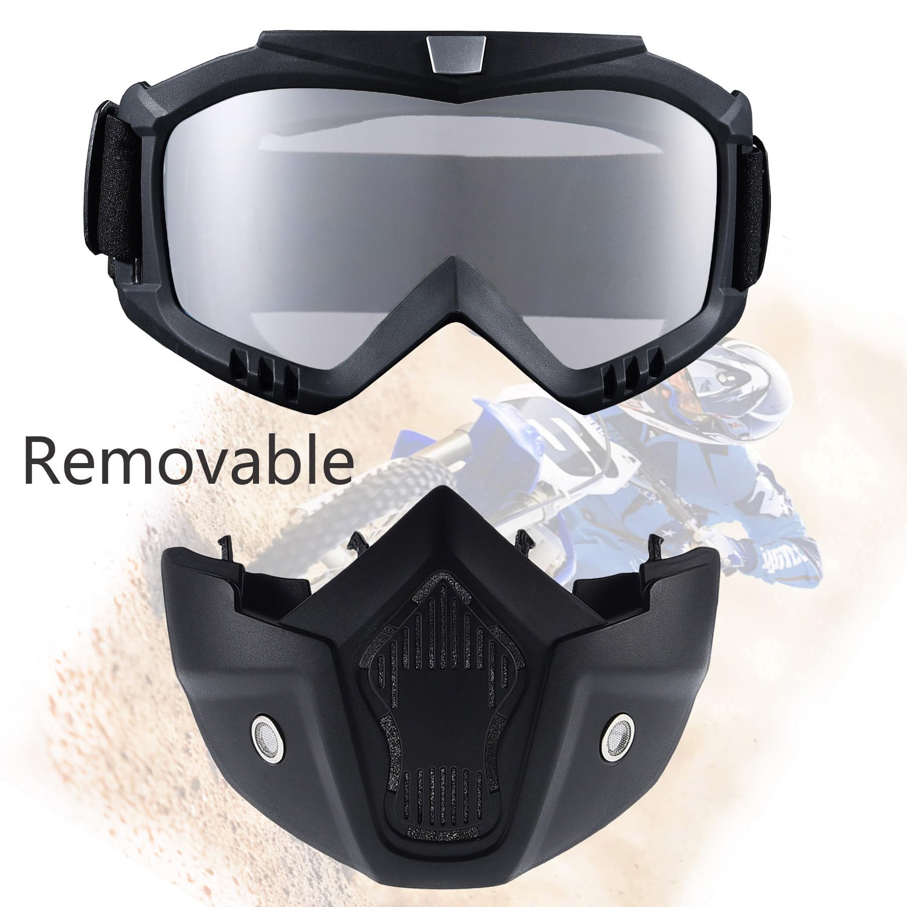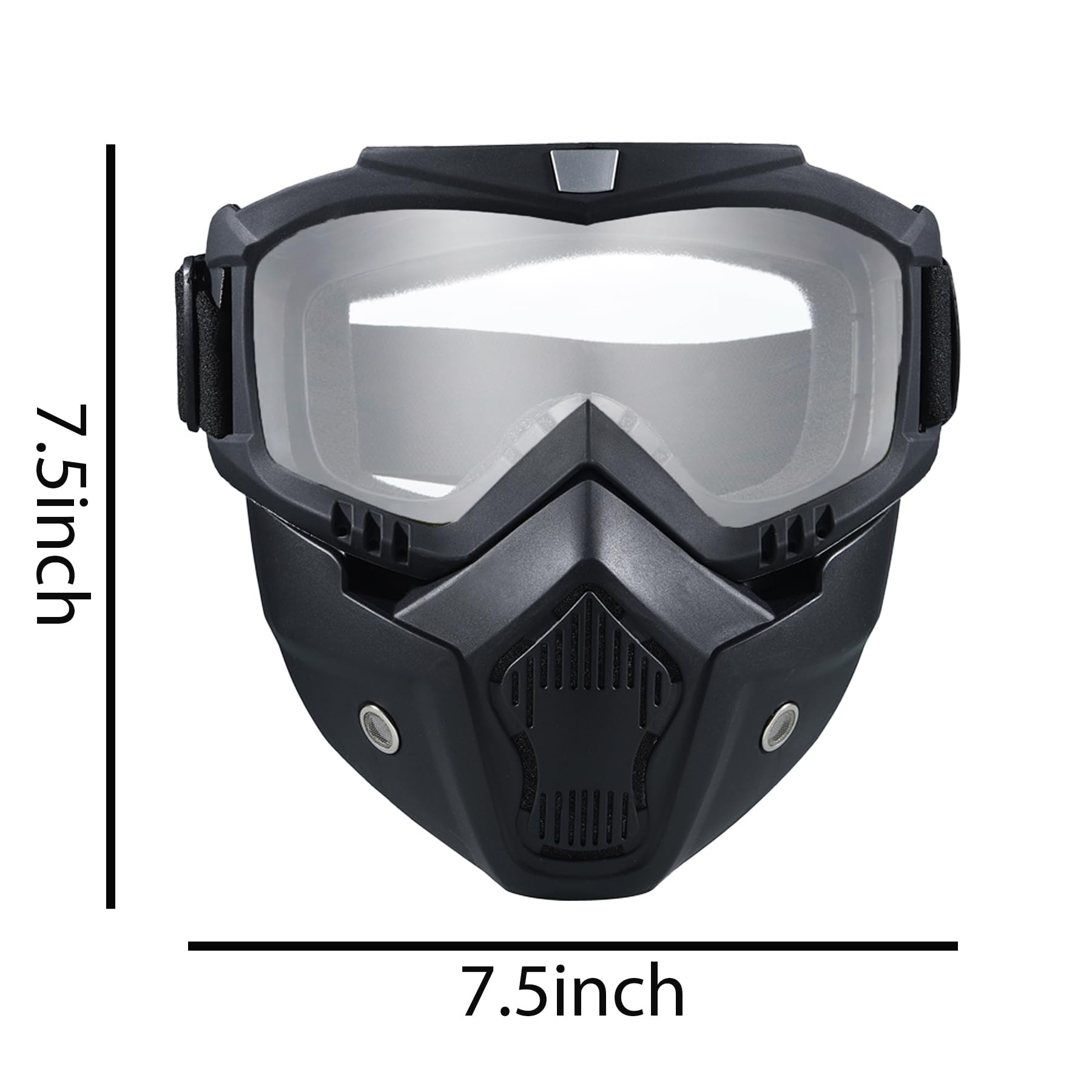 Package Contents:2x Face Mask withDetachable Goggles Size: One size fits most Frame Width: About 7.48 inch Frame Height: About 7.08 inch Material: TPU (Frame), PC (lens) Features:Multifunctional Goggles Windproofand Dustproof,anti- UV , anti-dazzle,better protect your eyes。 You can use it for Climbing,motorcycling,riding, snowmobile, skiing, Airsoft,Paintball, Jungle CF game and so on.