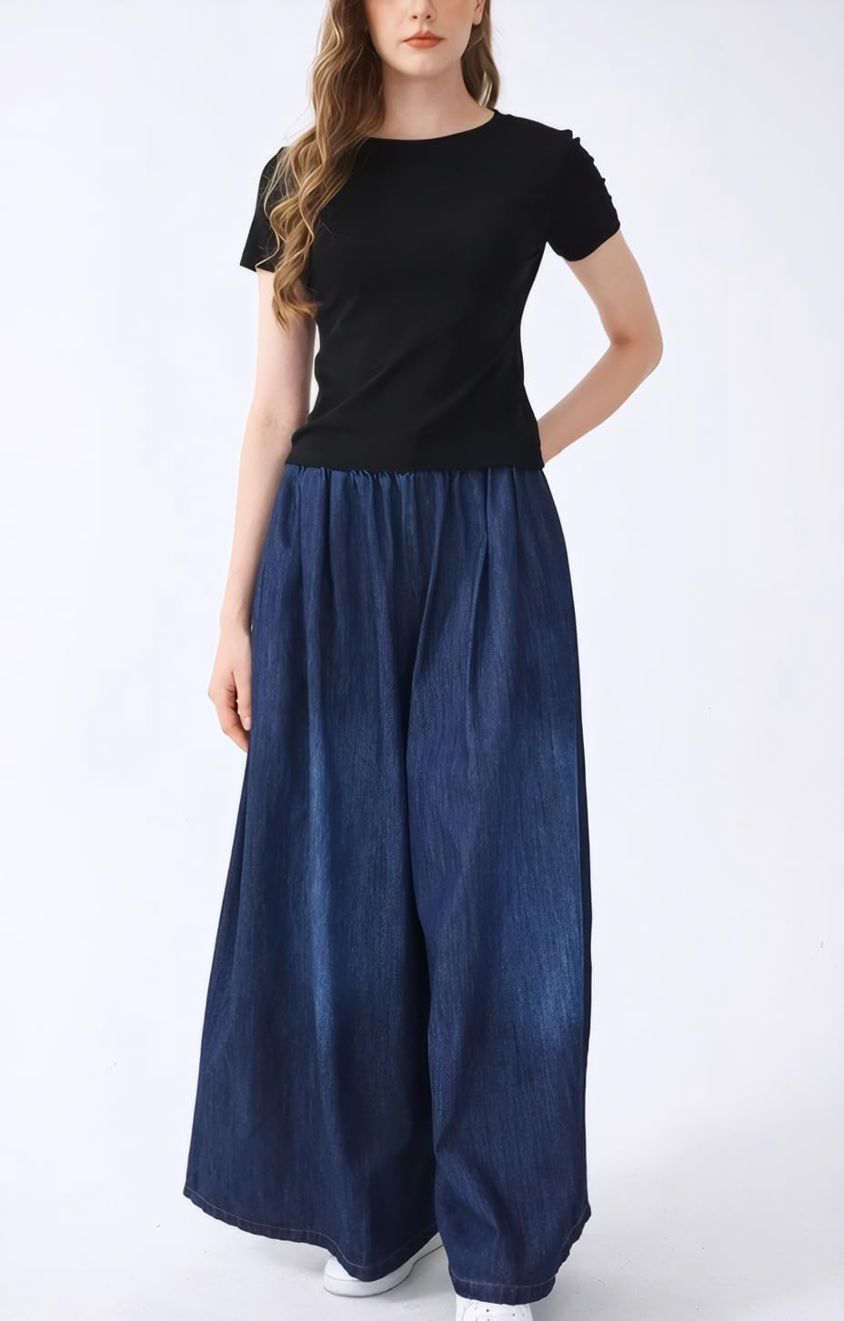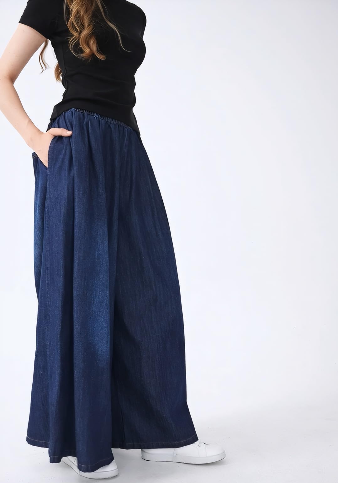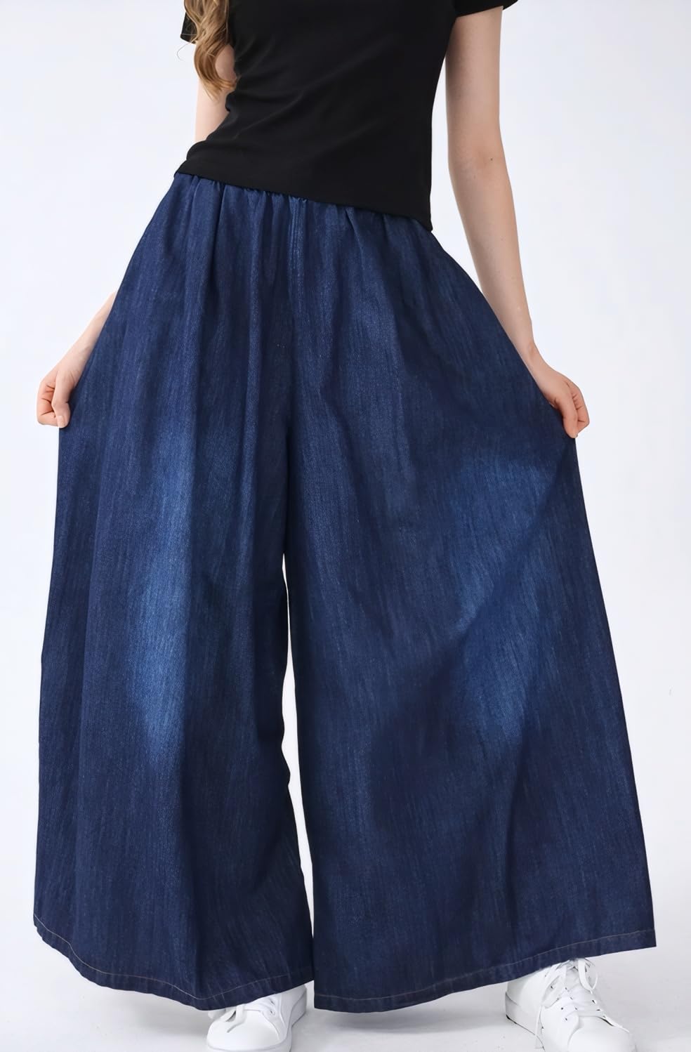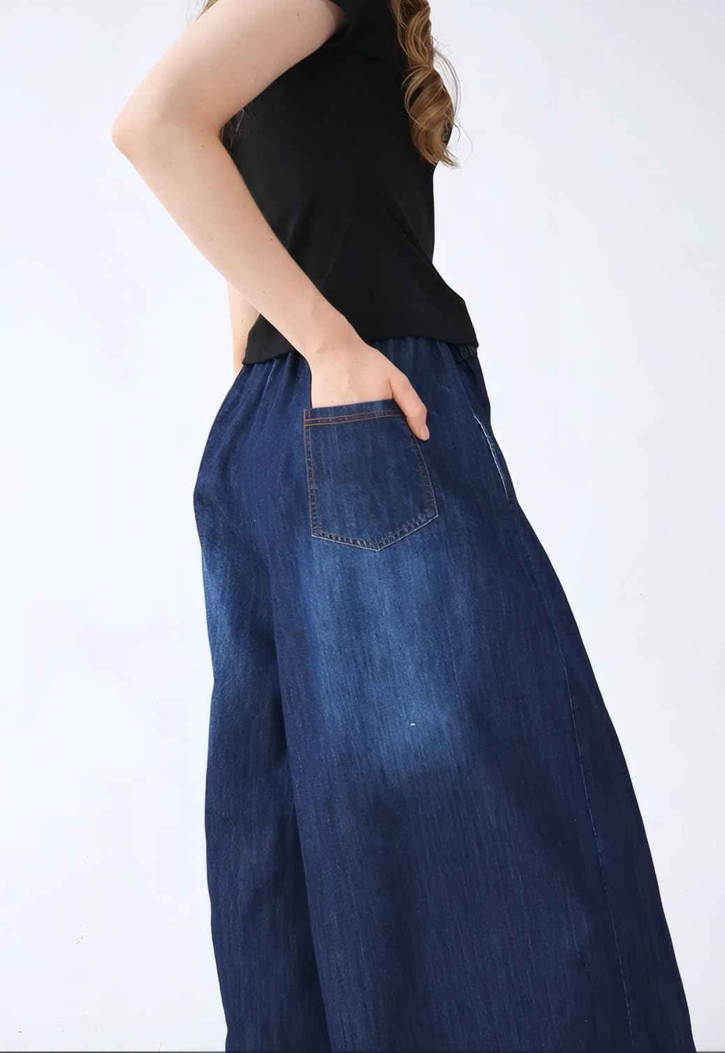 Features: Fashion jeans; Two side pockets and one rear pocket; Wide Leg; Elastic Waist; Casual; Loose