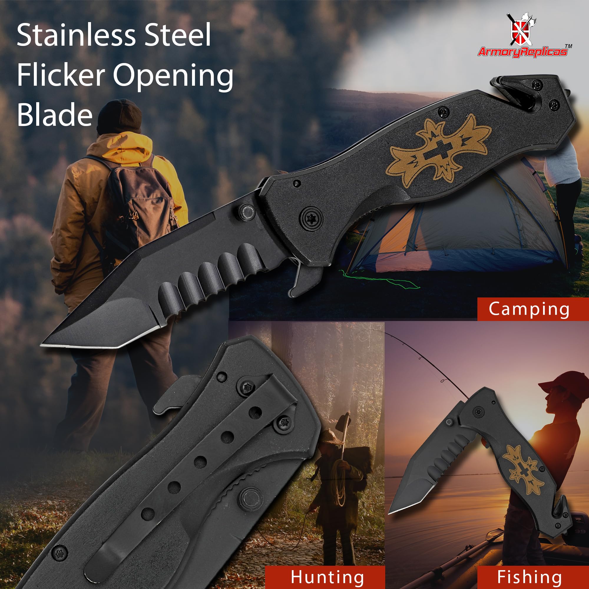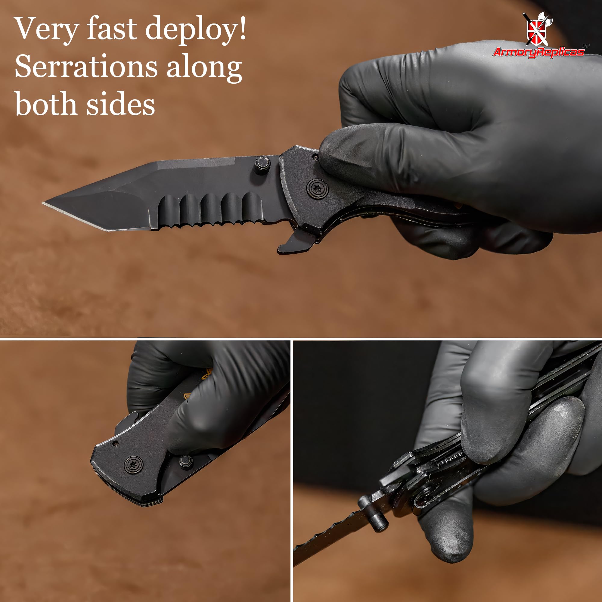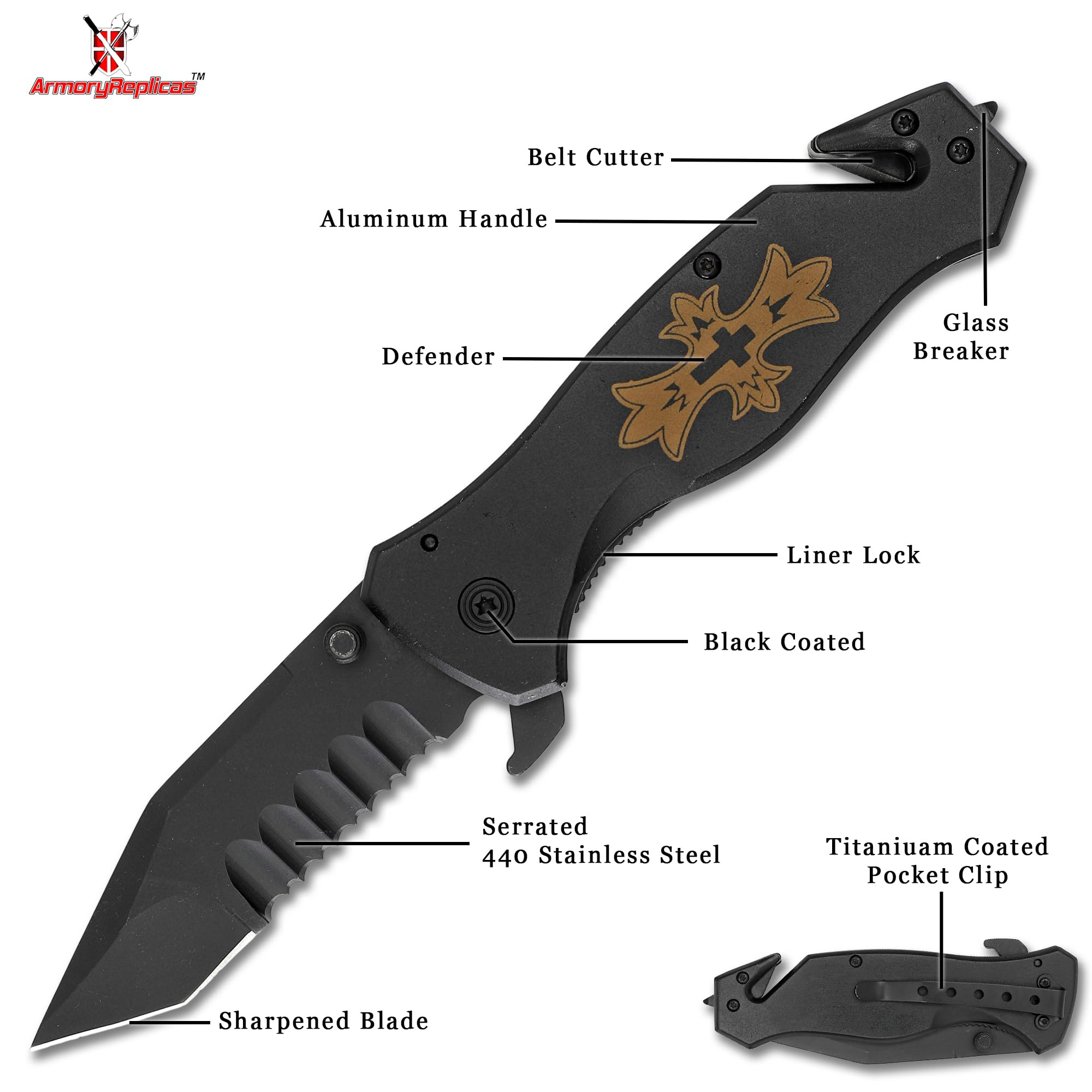 Serrated Drop Point Blade: 440 stainless steel with black anodized finish and spine detailing for strength and style