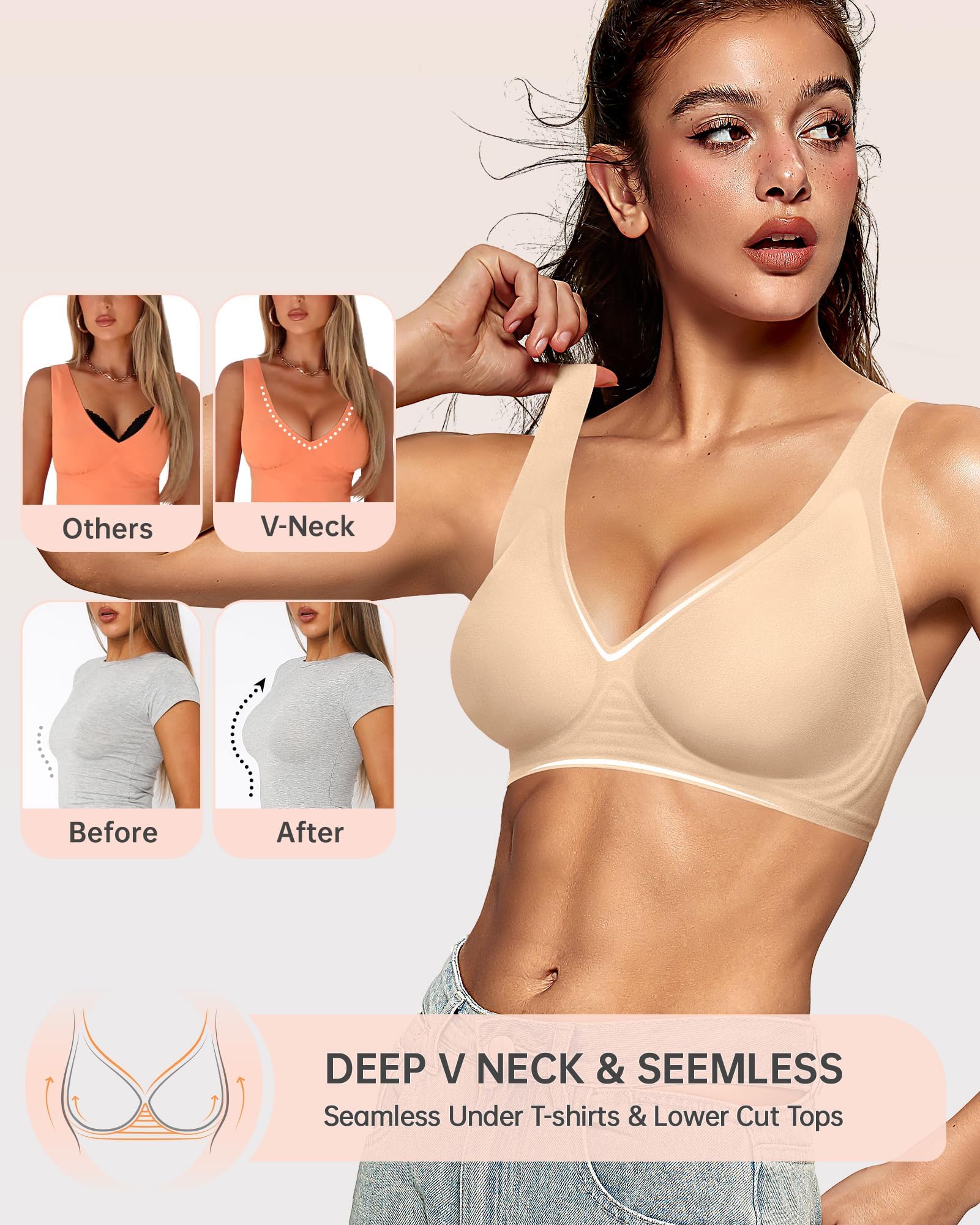 Ultra Soft and Comfortable Bras - These deep V bras with semi-fixed pads are made from high-quality fabric with a delicate texture, super breathable and gentle on the skin, providing a feather-light feeling with zero pressure. The highly stretchy design fits perfectly under your chest curve, effectively preventing the bra from slipping when lift your hands. Each semi-fixed pad has over 200 breathable holes, keeping you cool and comfortable for 24 hours.