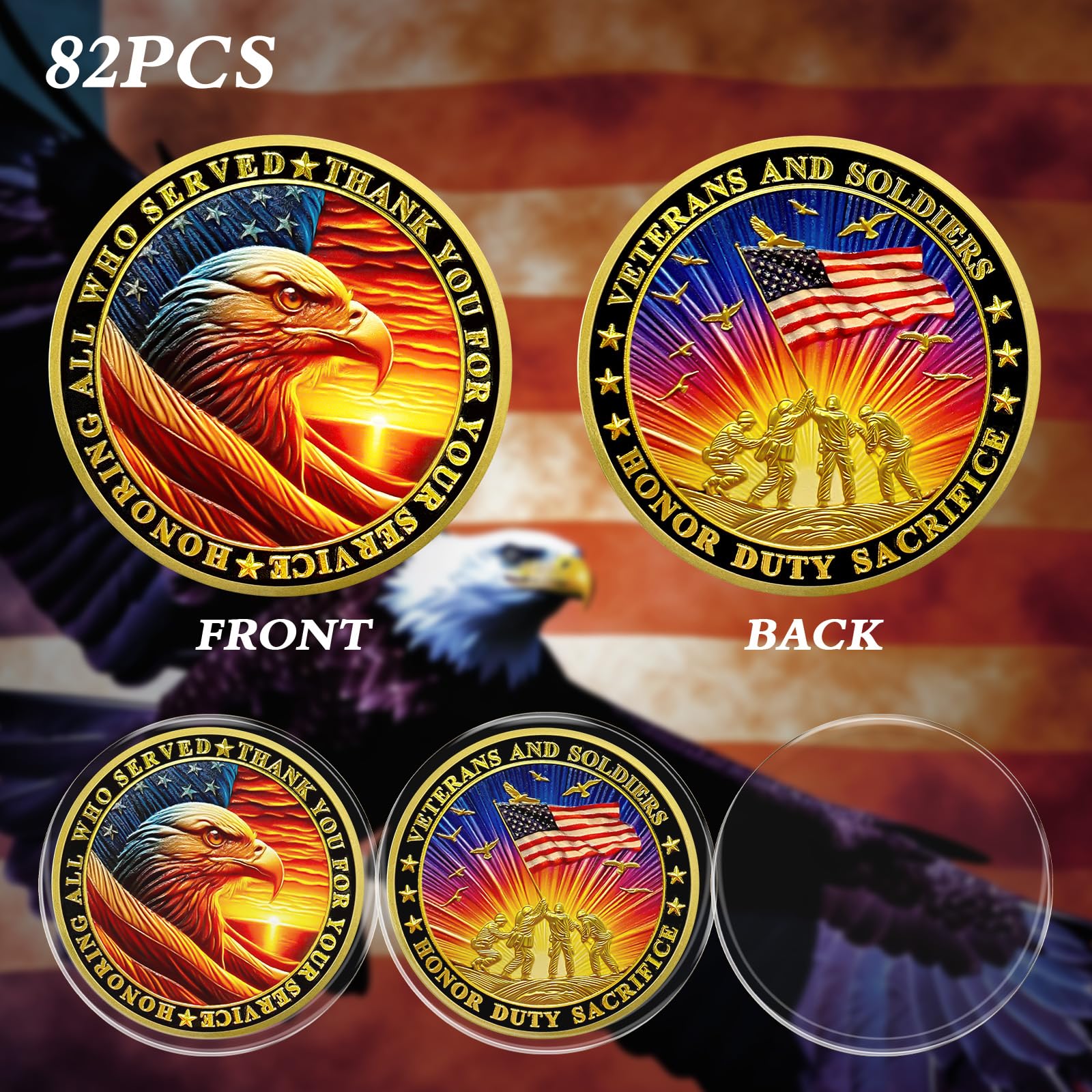 【Large Quantity for Your Use】Our military gift set includes 82 military challenge coins. These coins are not only exquisitely detailed but also practical and durable. They are more than symbols; they are cherished gifts, a tangible expression of honor and gratitude. Each coin is inscribed with "HONORING ALL WHO SERVED, THANK YOU FOR YOUR SERVICE," conveying deep respect and appreciation to all past and present servicemen and veterans