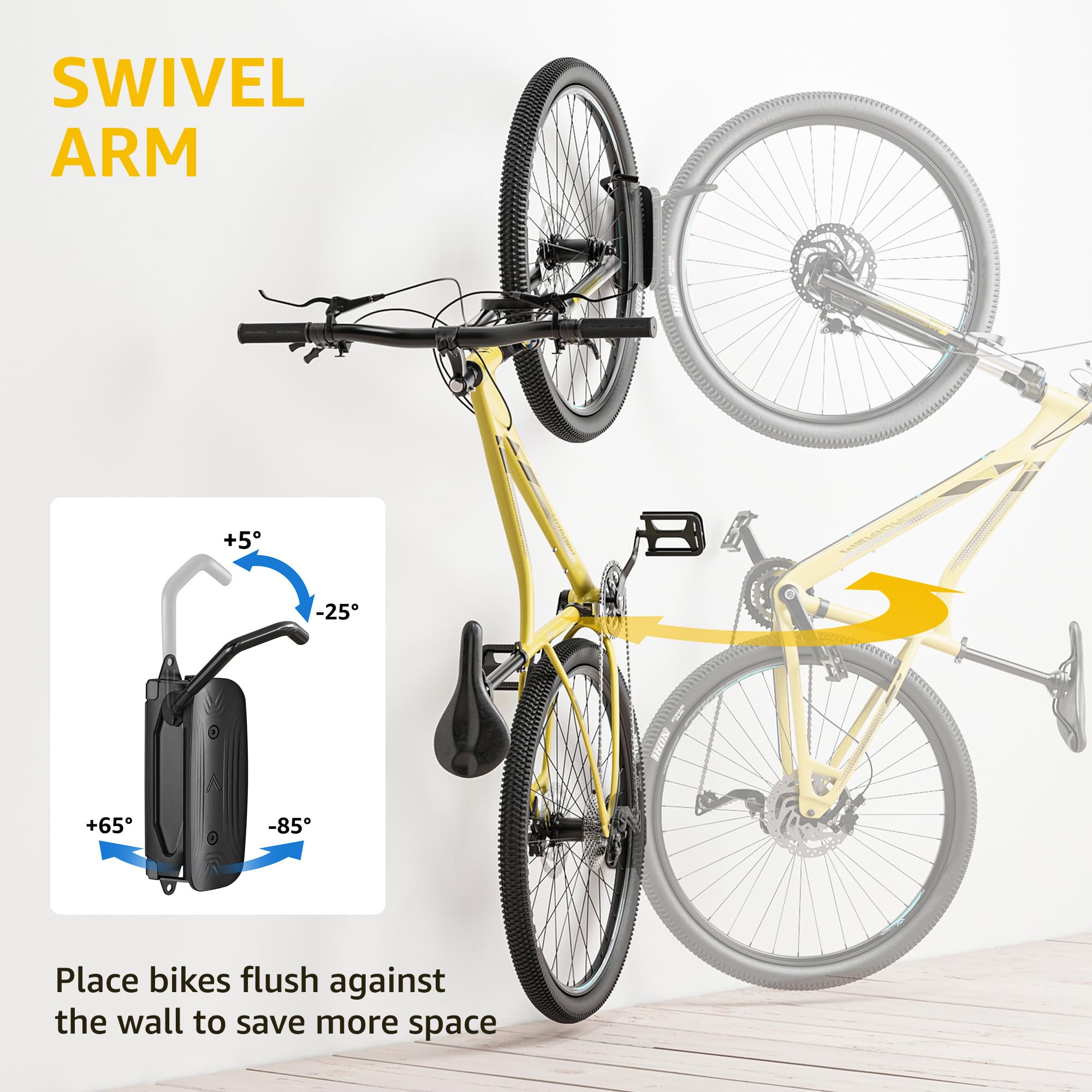【Upgraded 150° Swivel Design】 Swivel design with bearing system, swivel bike rack wall mount conveniently stores bikes in center, left or right-angled position, making it a convenient storage solution around parked cars and inside apartments. The swivel system allows you to store bike flush against the wall. Just hook the front wheel in place, rest the back wheel on the stabilizer, and then rotate the bike wall hanger to the desired angle.