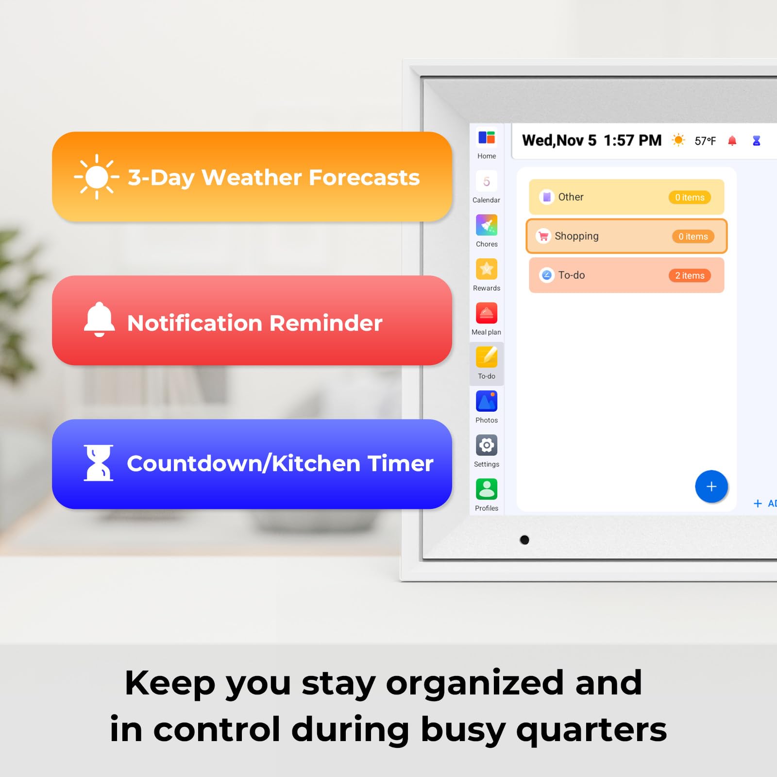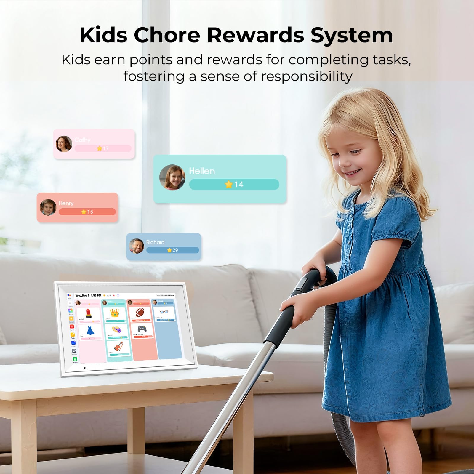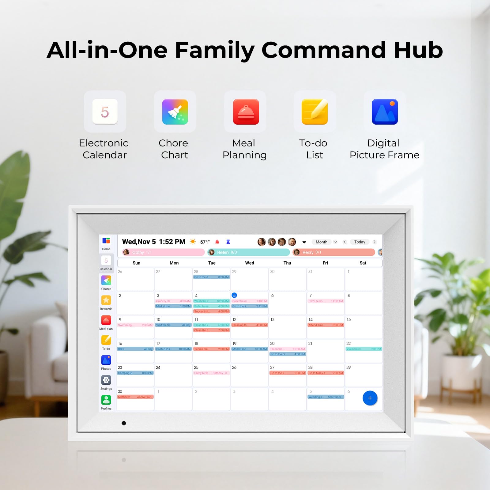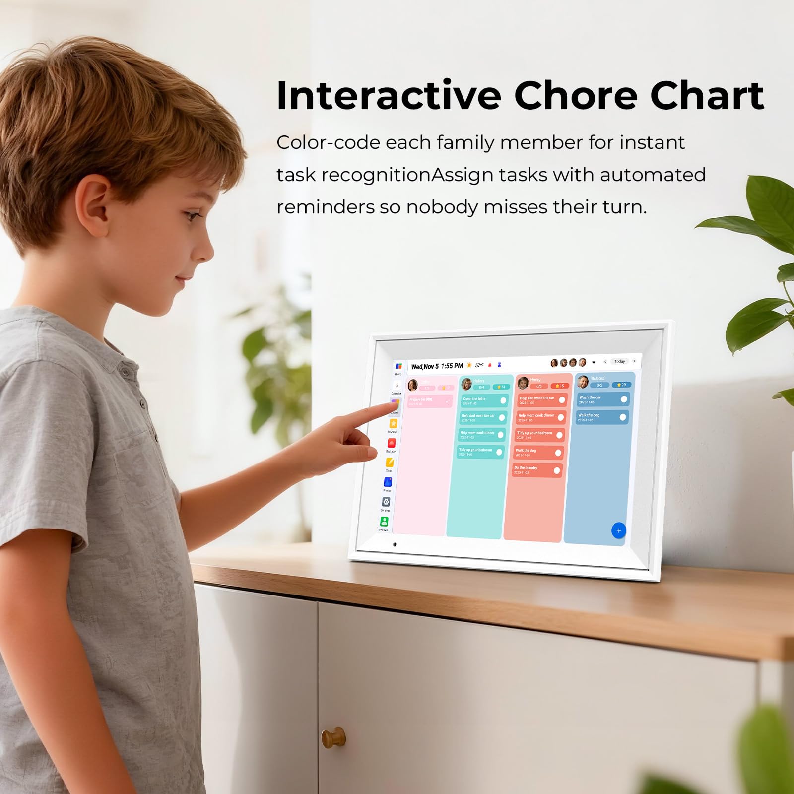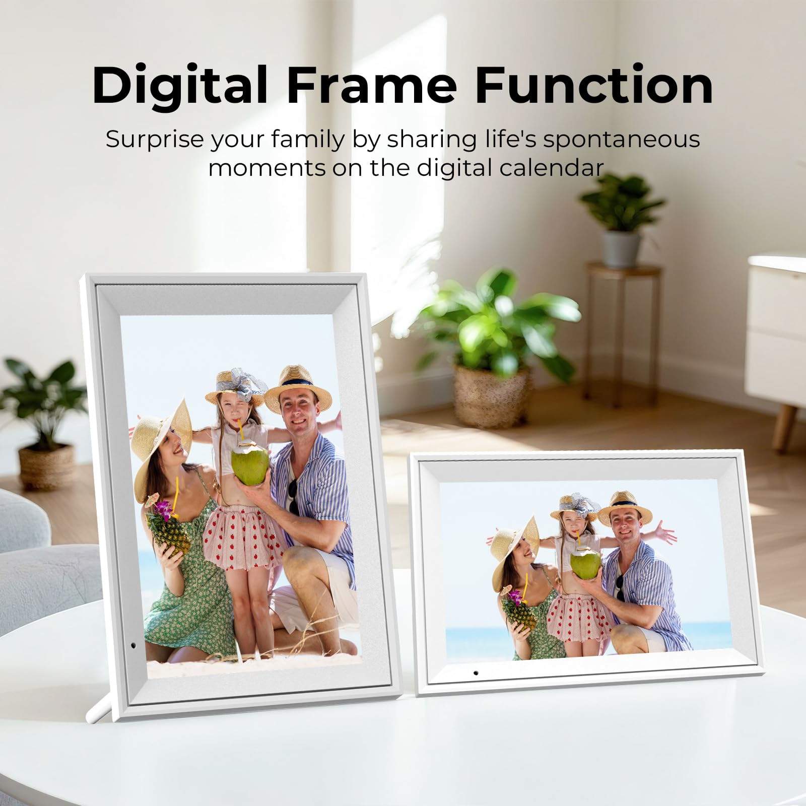 10.1'' IPS HD Touchscreen & Pitcure Frame: Experience stunning clarity on the 10.1'' digital calendar's HD IPS touchscreen (1280x800 resolution), delivering vibrant visuals from every angle in your kitchen or living room. When idle, the smart calendar transforms into a digital photo frame showcasing your family memories— using the AiMOR app to upload photos and videos, so everyone relives vacations, birthdays, and everyday magic while walking by.