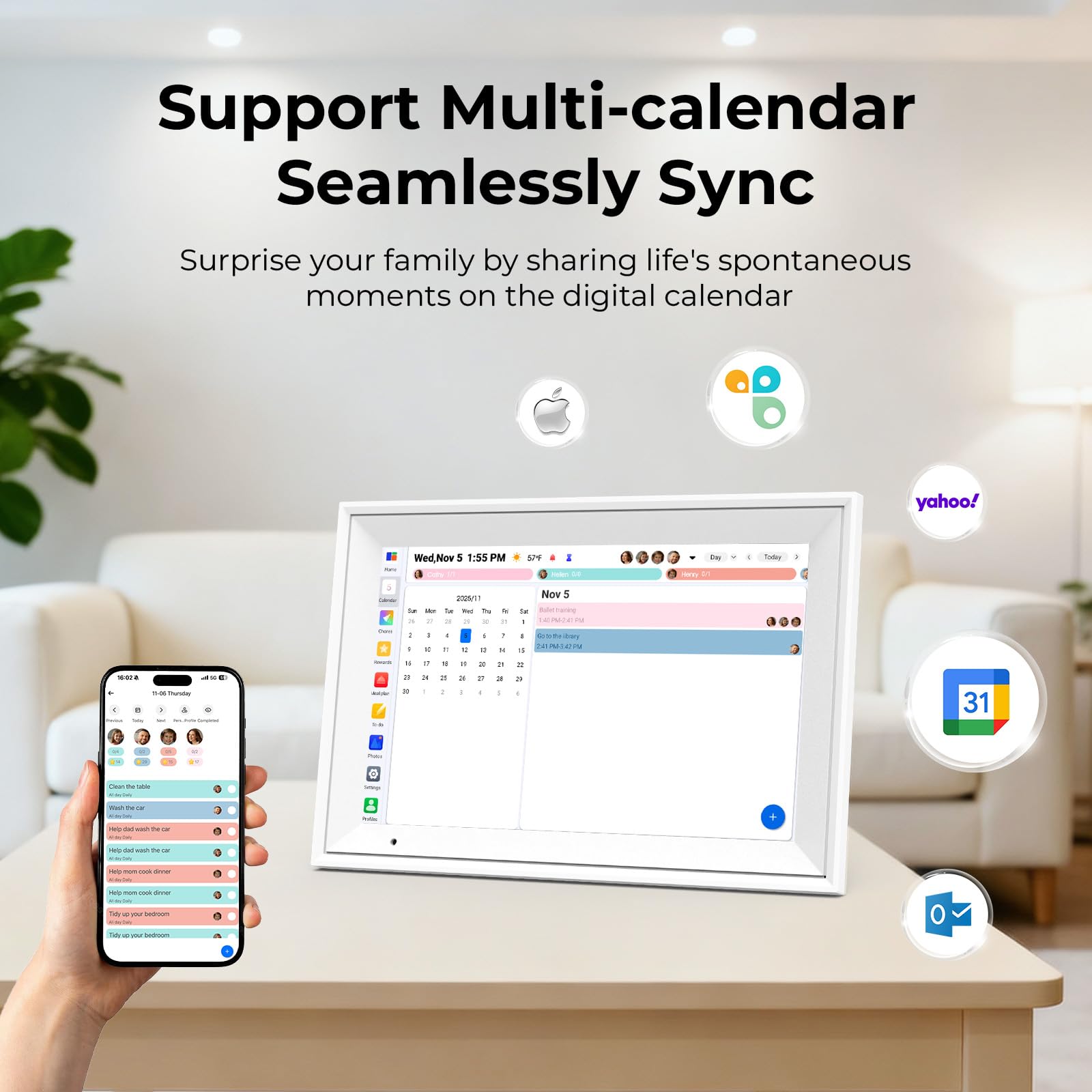 Easy Setup and Multi-calendar Sync: Power on your digital calendar and connect to WiFi (supports 2.4 GHz and 5 GHz bands) to sync with your favorite calendar apps. Enjoy seamless two-way synchronization with Google Calendar. Users of calendar applications such as iCloud, Outlook, Cozi, and Yahoo can sync their schedules via a URL link.