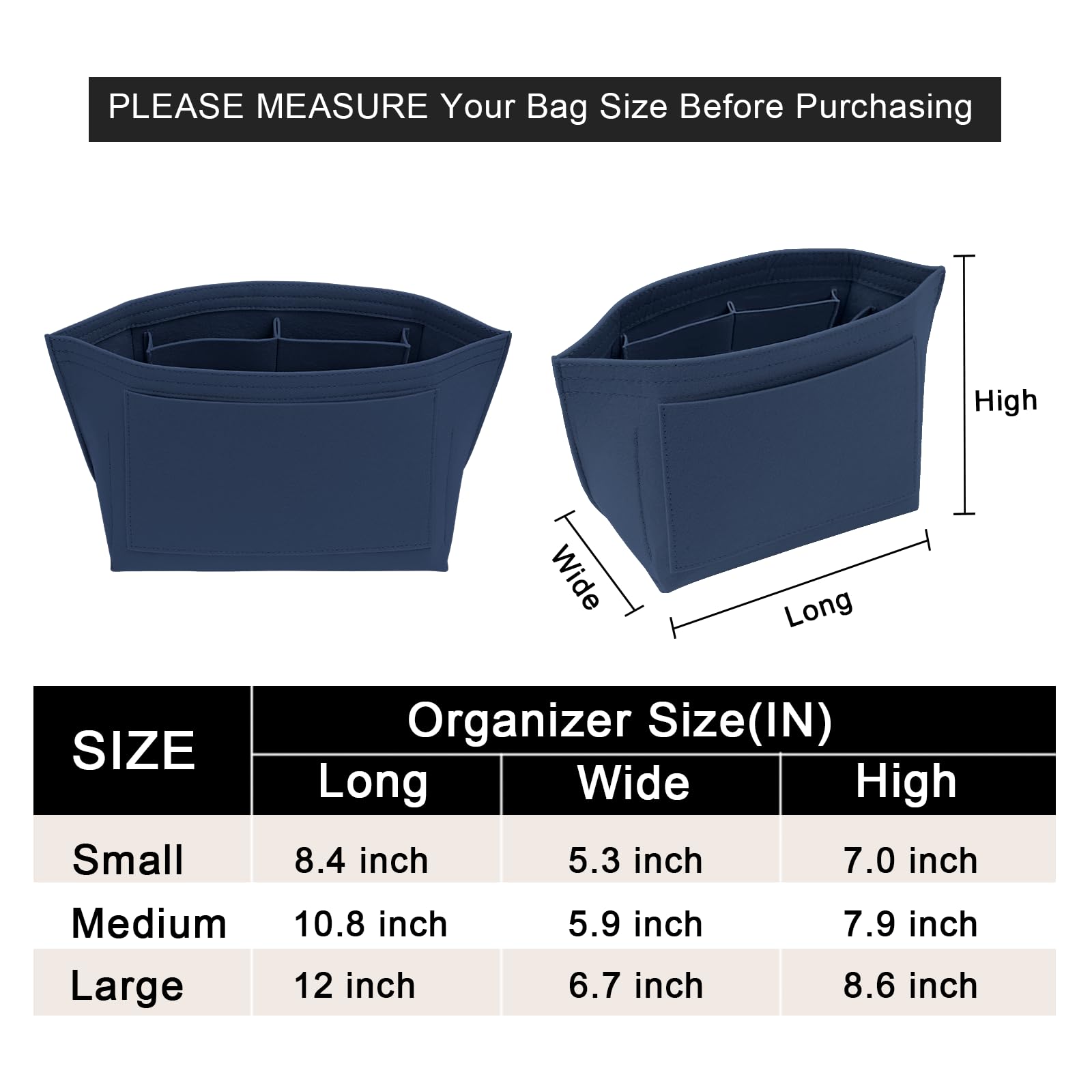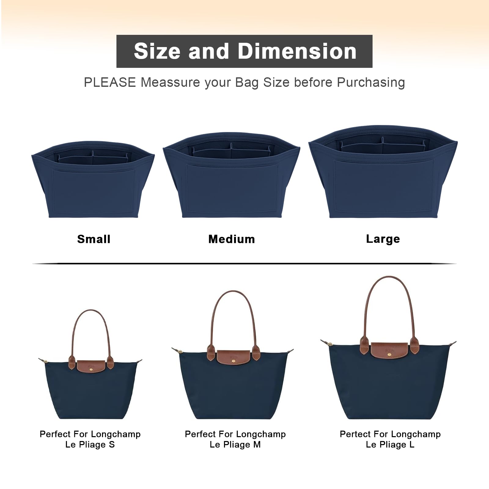 SIZE OF THE FELT PURSE ORGANINZER INSERT - Medium: 10.8" (L)*5.9" (W)*7.9" (H) , suitable for Large Size of long handle of Le pliage handbag, or similar size Tote Handbag,It will be more suitable if it is LESS than 0.5-1 inches to ensure a perfect fit,Please comfirm your bag size before purchasing again, thanks.