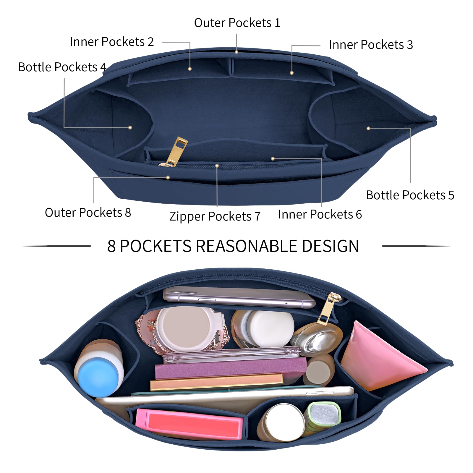 NEW design: There are 8 compartments, two of which are external pockets for large items, and the remaining 5 pockets, two double side pockets (for mugs and various small items, solving the problem of insufficient pockets) and one zipper pocket (with high-quality metal zipper head for durability), allow you to store your cell phone, wallet, cosmetics, glasses, and other personal belongings in the wallet organizer, making it easy to change bags throughout the day without rearranging. and no need to reorganize.