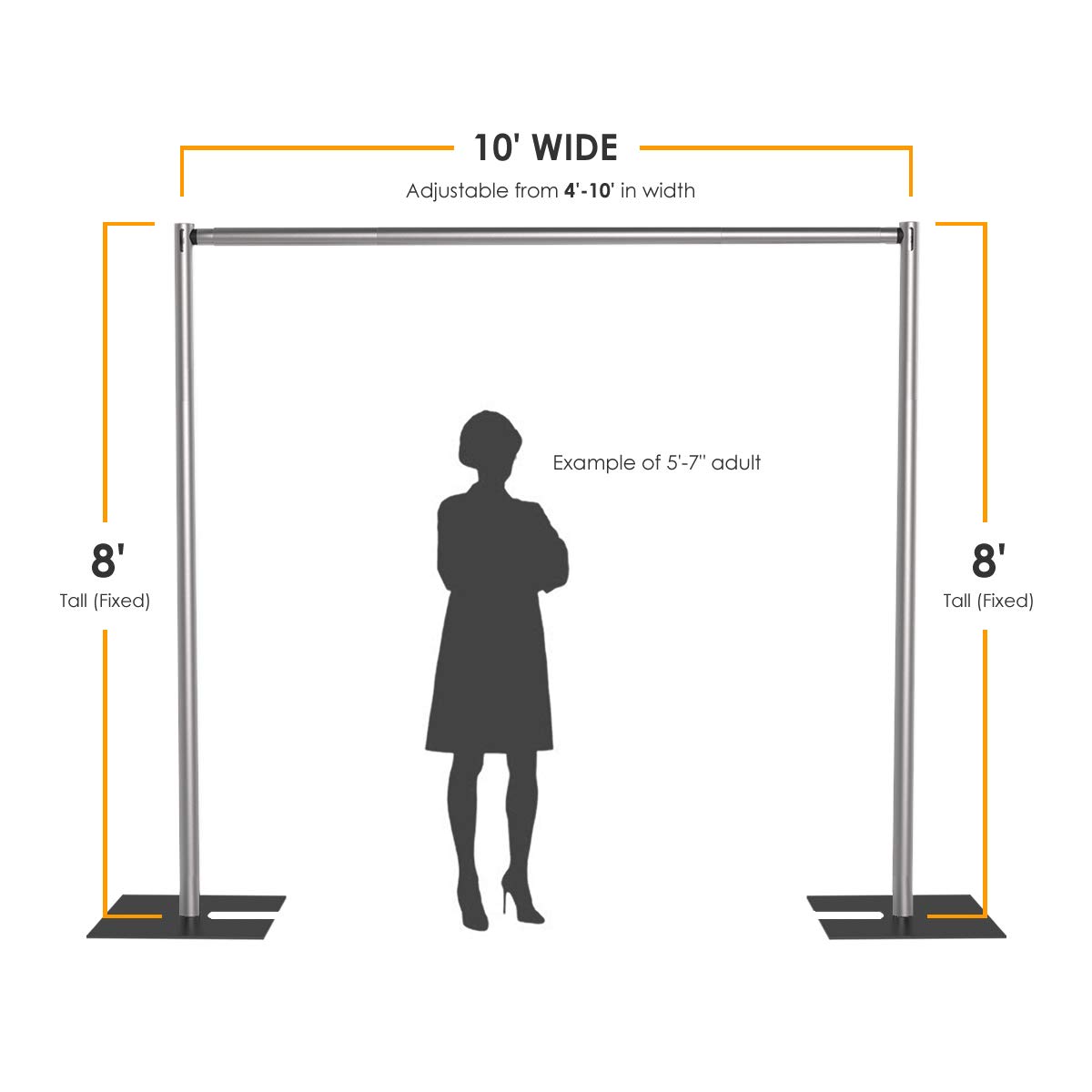 KIT INCLUDES: (2) Uprights 8' Fixed (break-apart) + Crossbar 6' to 10' Adjustable + 14"x16" (12lbs) Bases & Pins ★ (Drapes Not Included, Sold Separately) ★