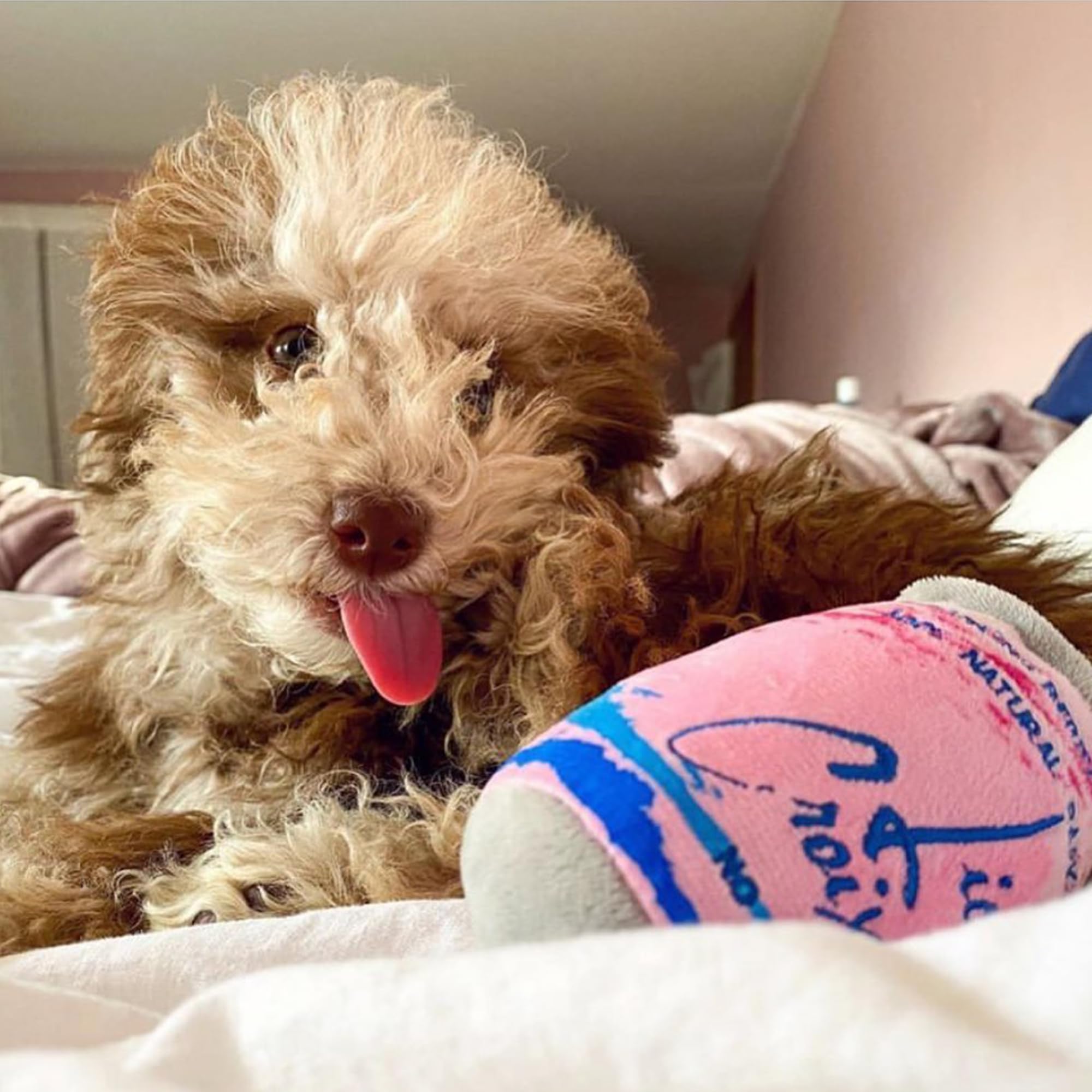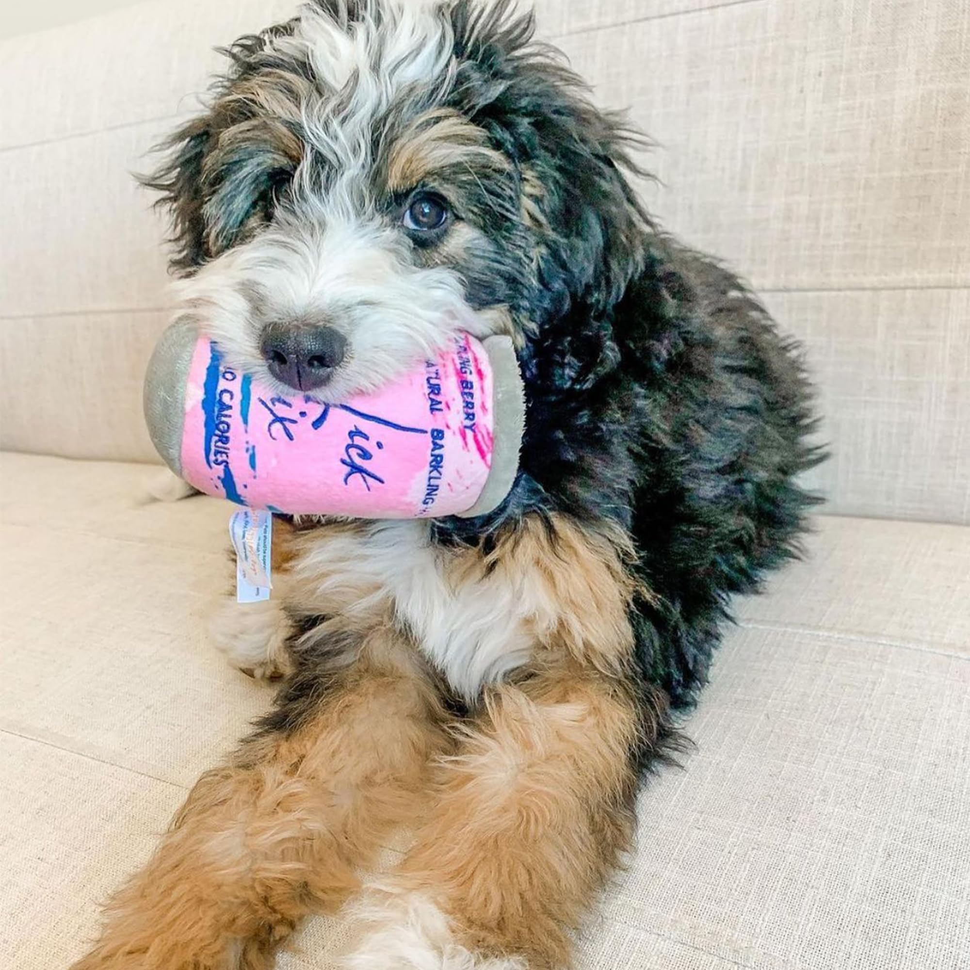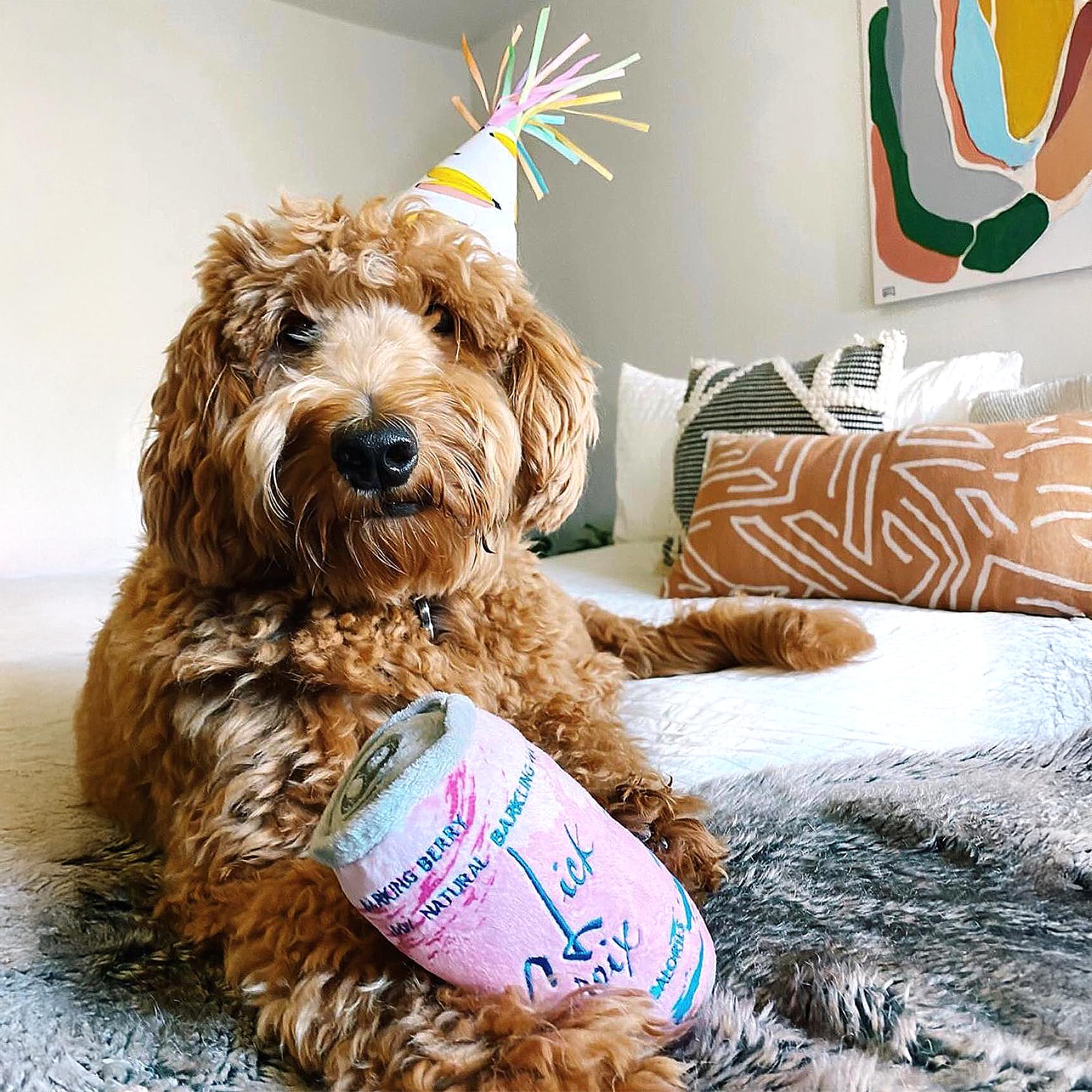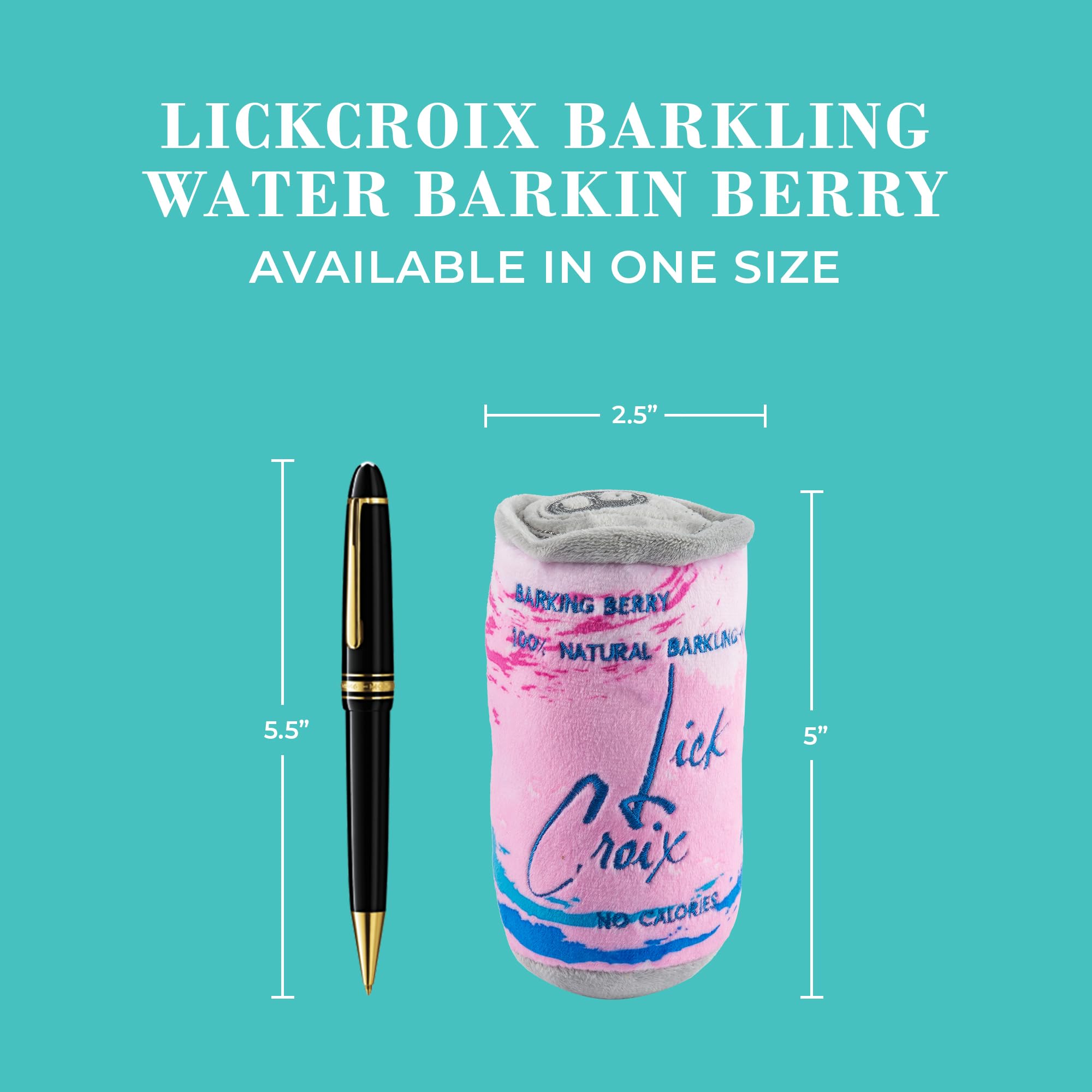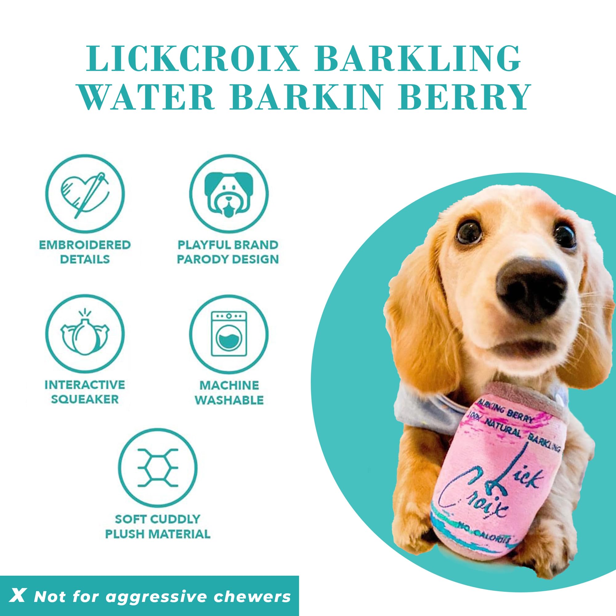 Funny Parody Plush Dog Toy: Let your pup bubble up with excitement and keep them hydrated with our LickCroix Barkling Water Barkin Berry dog toy. This dog toy features a pink and blue plush exterior with a built-in squeaker hidden inside. It’s a fun, cute interactive dog to quench your furry friend's thirst during playtime! One Size 5”x4"x2.5".