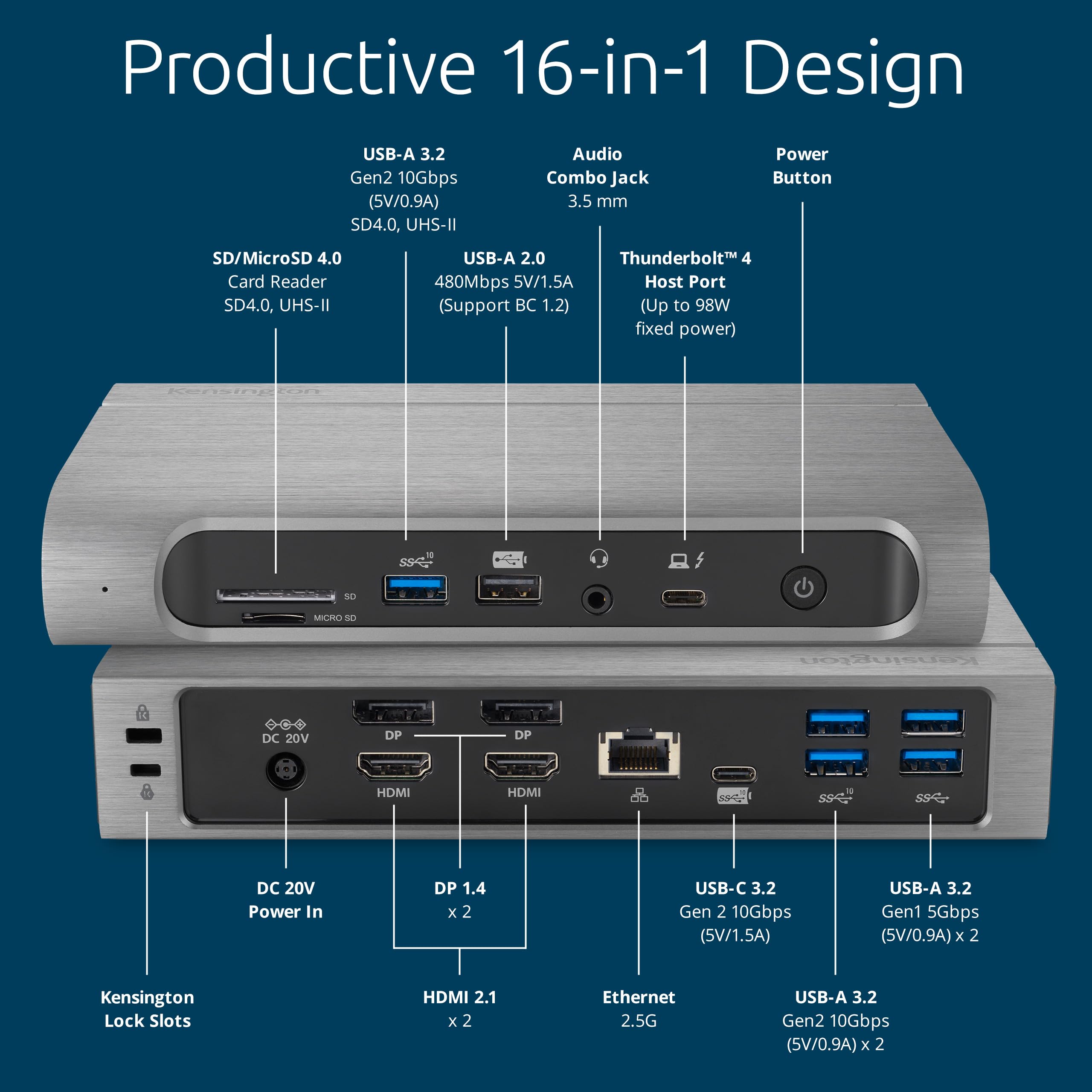 Productive 16-in-1 Design - Ports include 2 x HDMI, 2 x DP, 1 x Thunderbolt host, 1 x USB-C 3.2 Gen2 10Gbps, 3 x USB-A 3.2 Gen2 10Gbps, 2 x USB-A 3.2 Gen1 5Gbps, 1 x USB-A 2.0 480Mbps, 1 x combo audio jack, 2 x SD or Micro Card readers, and 1 x 2.5Gbps Ethernet