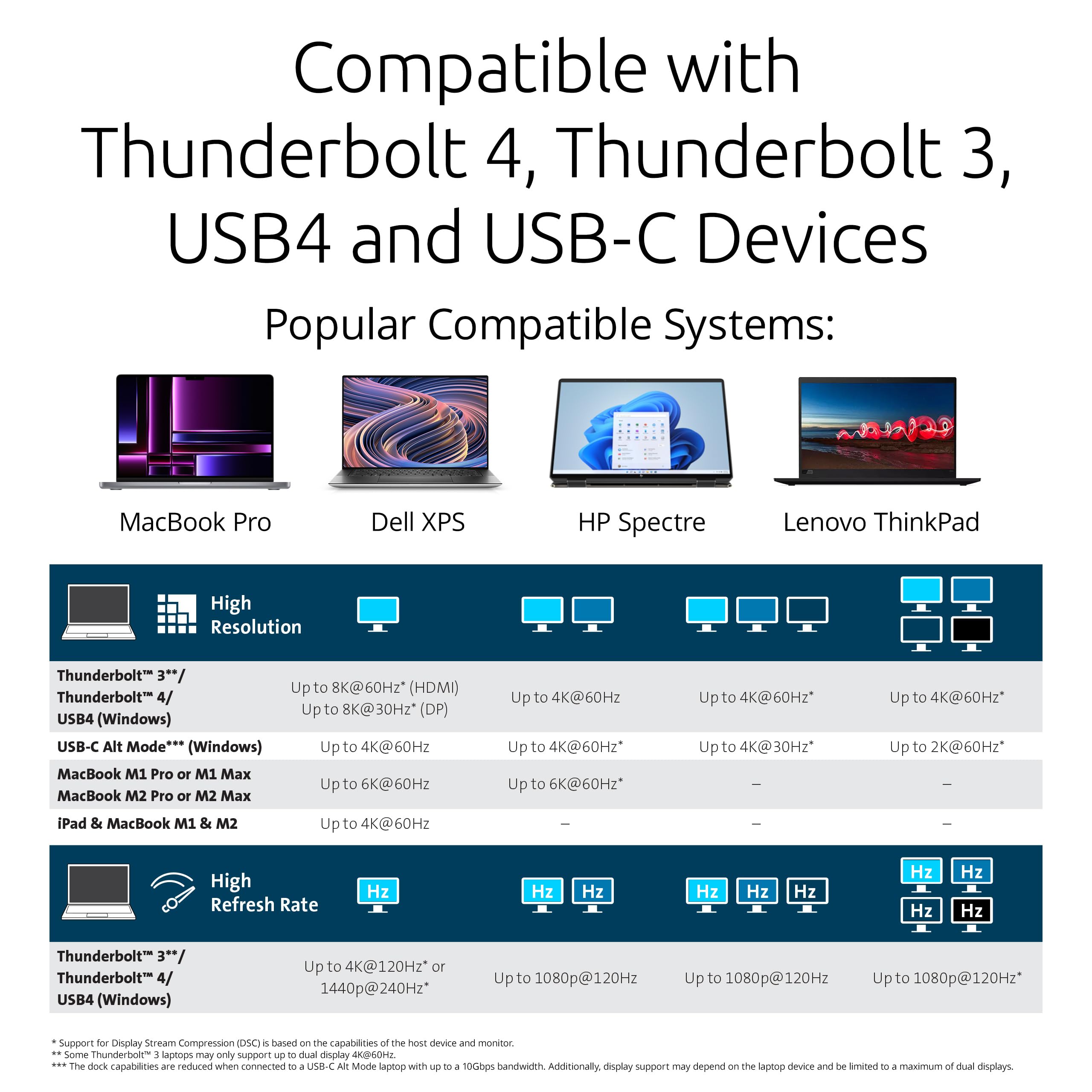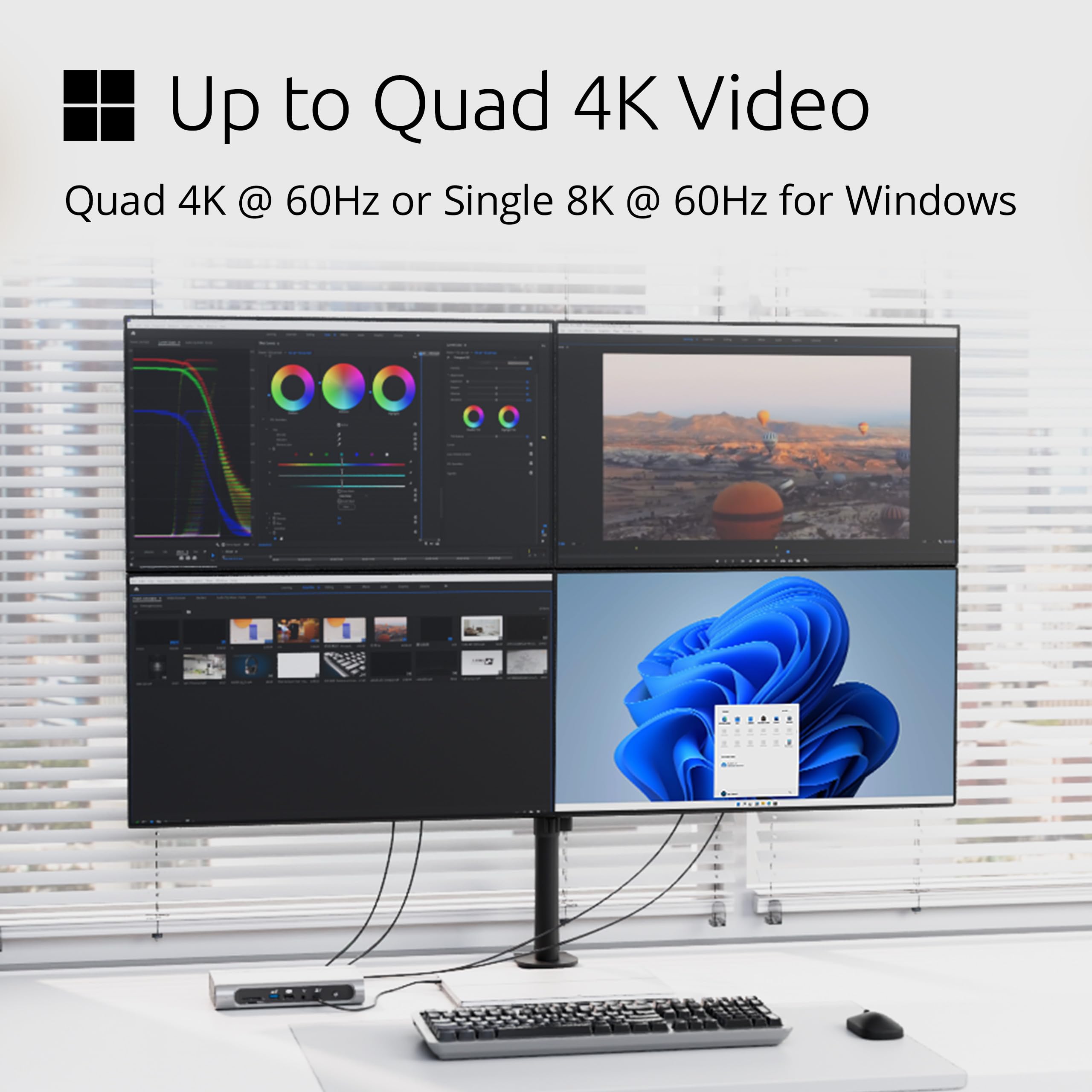 Quad 4K or Single 8K Support - Supports up to Quad 4K @ 60Hz or Single 8K @ 60Hz for Windows via an HDMI port or via two HDMI ports and two DP ports. Supports Dual 6K @ 60Hz for MacBook models with M1/M2/M3 Pro and M1/M2/M3 Max chipsets, and Single 4K @ 60Hz for MacBook models with M1/M2/M3 base chipsets