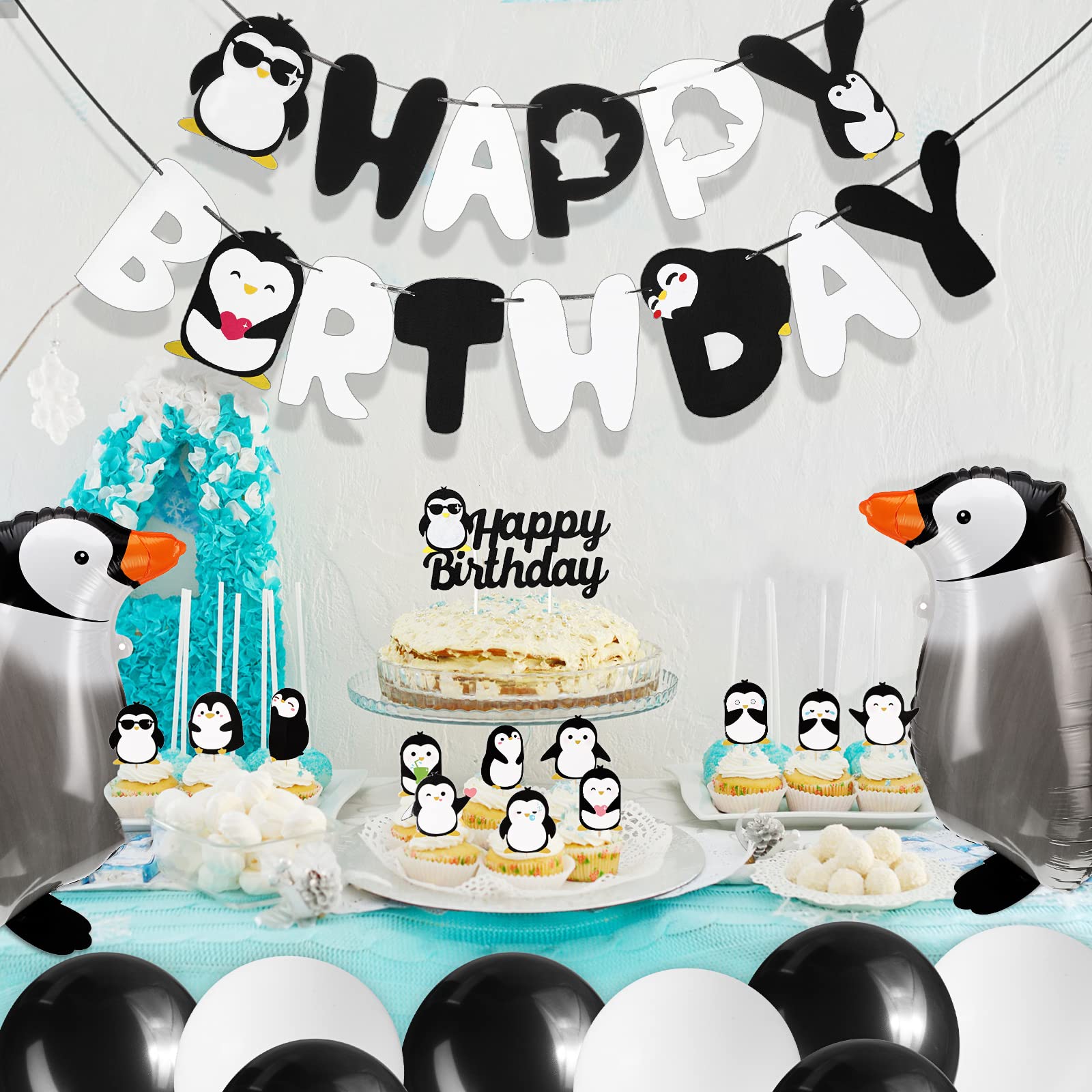 Penguin birthday party decoration: the package comes with 1 penguin birthday banner, 1 big penguin birthday cake topper, 24 small penguin cake toppers, 2 large walking penguin balloons, 10 black latex balloons, 10 white latex balloons, a total of 48 pieces, rich quantity and diverse styles allow you to DIY party according to your preferences