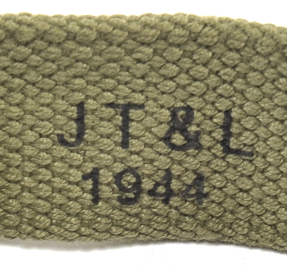 Officially Licensed World War Supply Cotton Webbing M1 Garand Sling. Correct WW2 Flat Buckle Hardware. 1.25" wide. Marked JT&L 1944. Thick Cotton Webbing Construction. 1.25" wide. Expertly Handcrafted Replica.