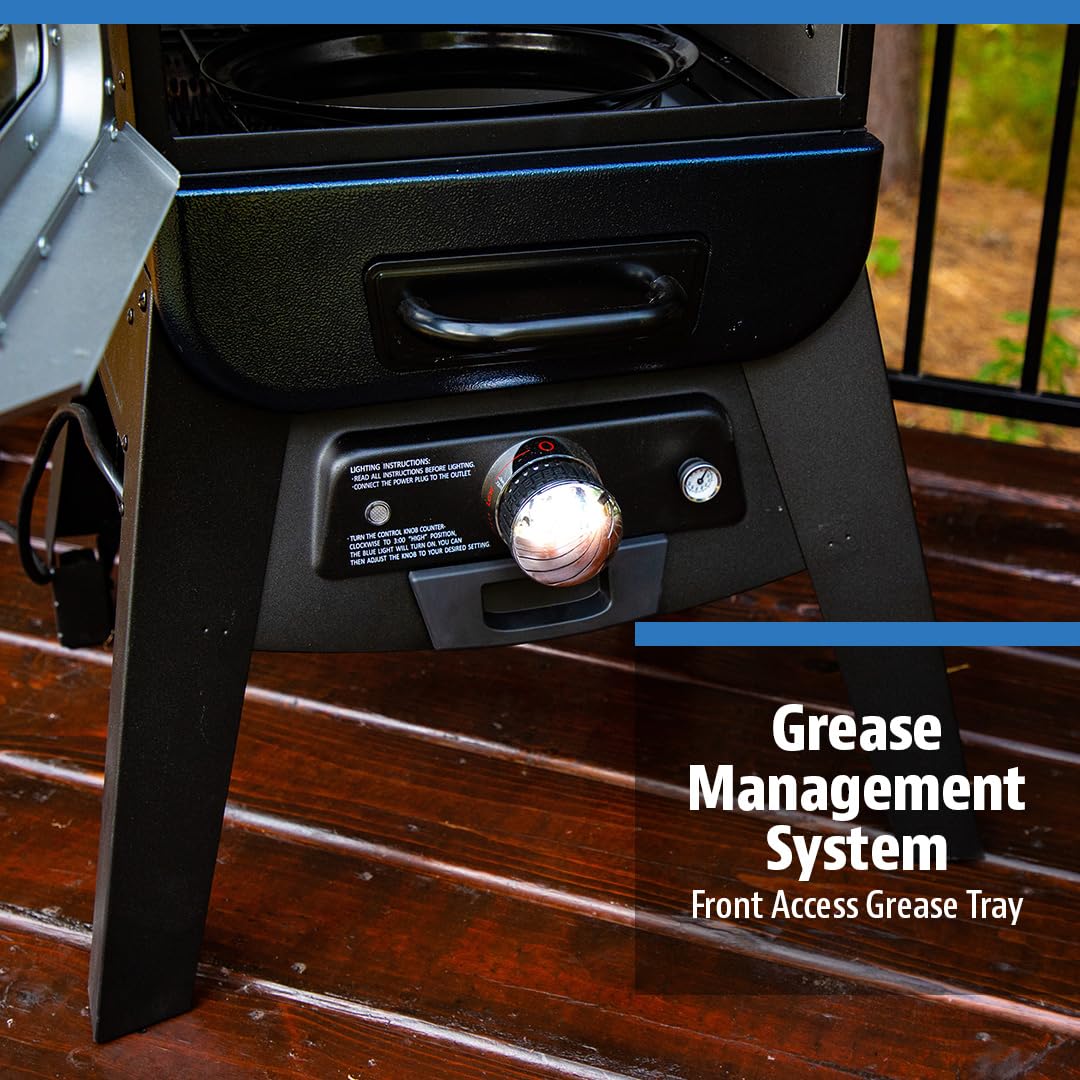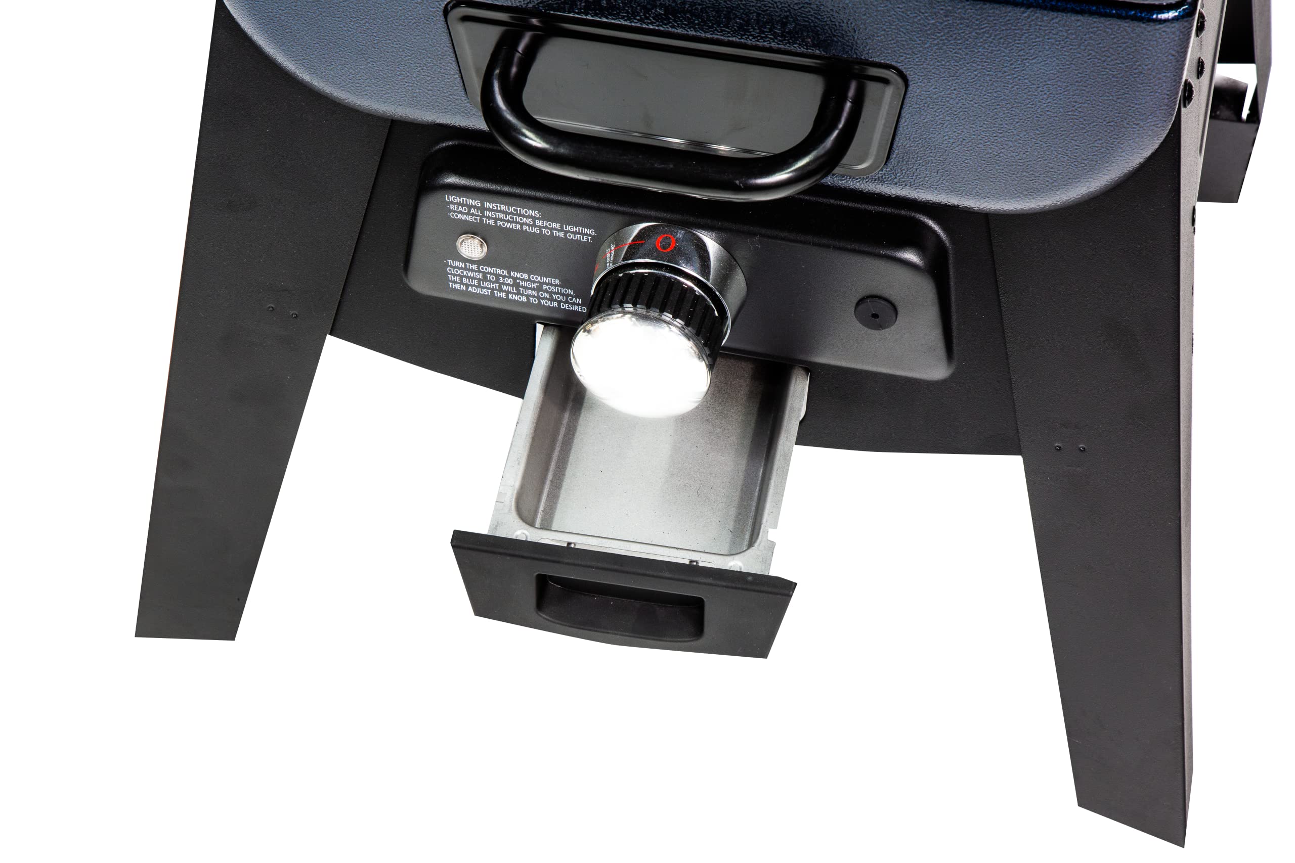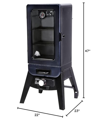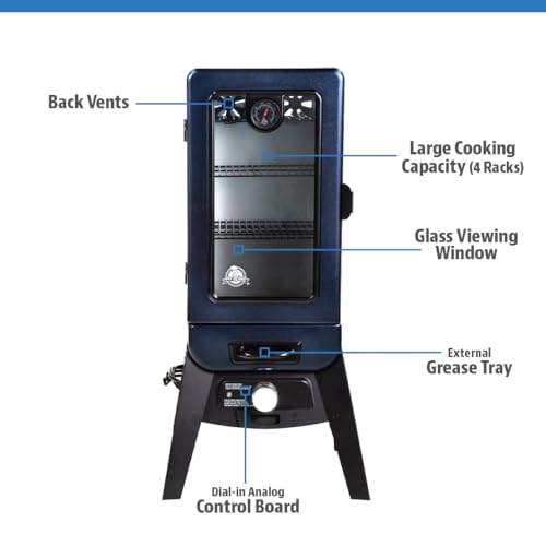 At Pit Boss Grills, we have engineered a smoker that smokes out the competition. With the Pit Boss Analog Electric Smoker, you can reach temperatures as low as 100°F and as high as 325°F thanks to the double walled cabinet and 1650 watts of power. With built in controls that are simple to use, you’ll have your unit up and smoking in no time. The ability to infuse flavor into your smoker is easy with the oversized front load wood chip tray, offering up to two hours of cooking time per load. The large viewing window eliminates the need for peek-a-boo cooking and its elevated frame makes transferring your meal from the smoker to the table a breeze. The Pit Boss 3 Series Analog Electric Smoker features 684 square inches of cooking space, 4 porcelain coated cooking racks, an analog meat probe, and an external heat indicator. The rear wheels and handle increase mobility, and a stylish navy blue semi-gloss finish is sure to “wow” the crowd. Whether you’re new to smoking or an expert, experience how Pit Boss is redefining the smoker industry in your own backyard today!