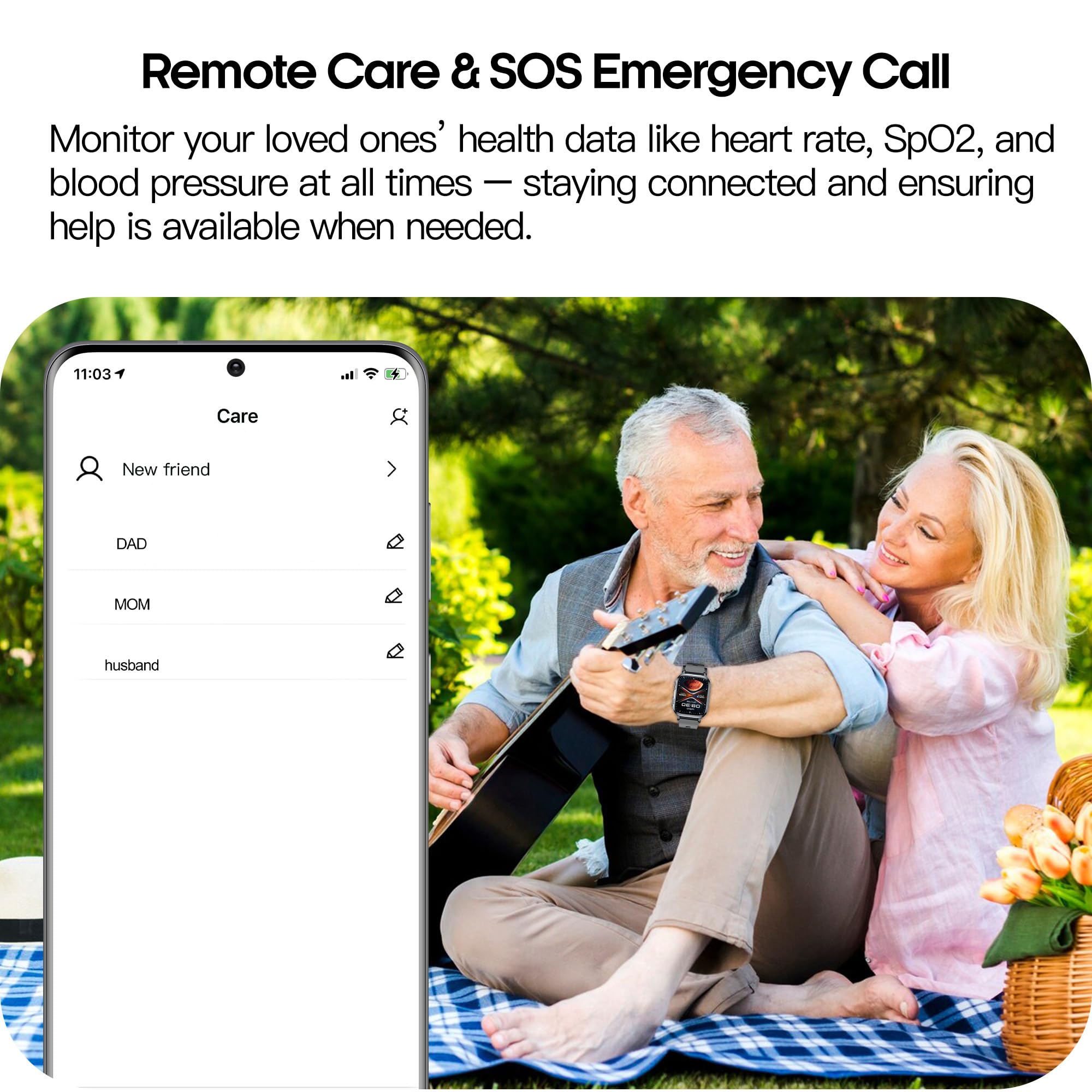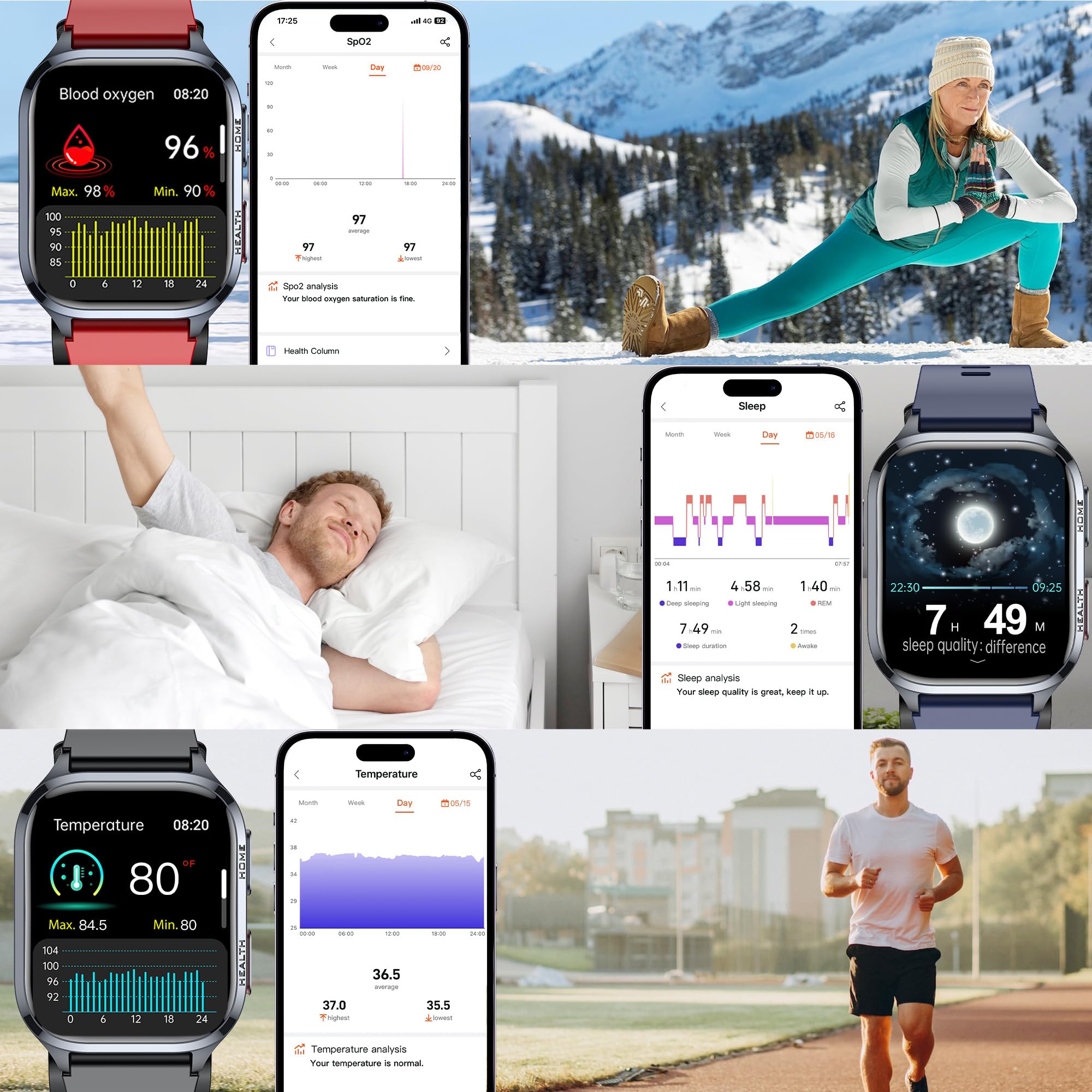 【24/7 health monitoring and remote care】This wrist health monitoring watch continuously tracks heart rate, blood oxygen, body temperature, and respiratory rate in real time. It also monitors sleep quality, analyzing nighttime sleep patterns—including deep sleep, light sleep, sleep duration, and awake time—to help improve sleep habits. Through the APP’s family data-sharing feature, you can remotely check your loved ones’ health status anytime, ensuring peace of mind even when you're away from home.