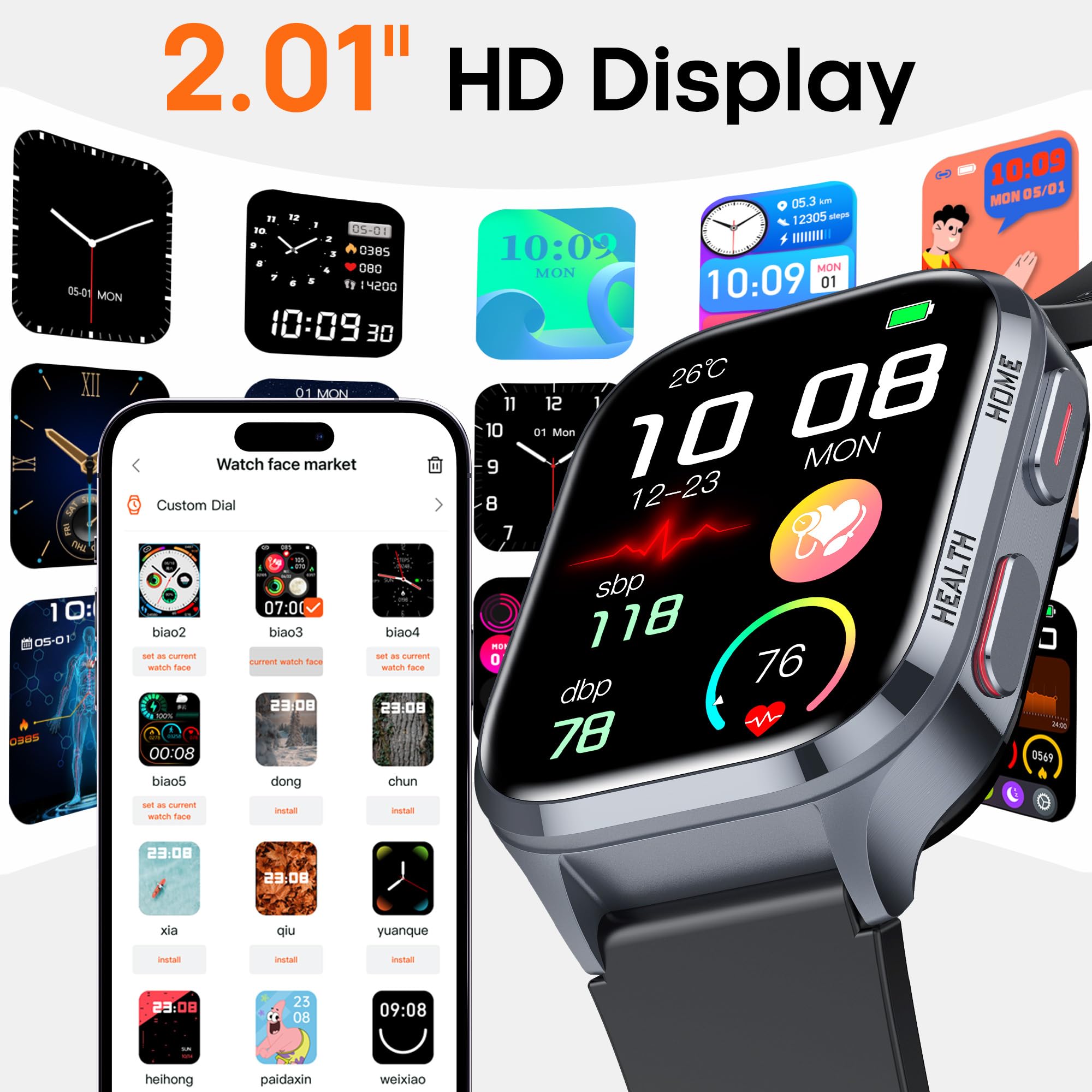 【2.01" HD Color Screen & Customizable Watch Faces】The blood pressure monitor watch features a 2.01" full-touch HD display with a 240×296 high-resolution screen, ensuring clear visibility in both bright and dark environments. With access to a built-in cloud dial market, you can choose from hundreds of personalized watch faces or create your own custom design—letting you showcase your unique style effortlessly.