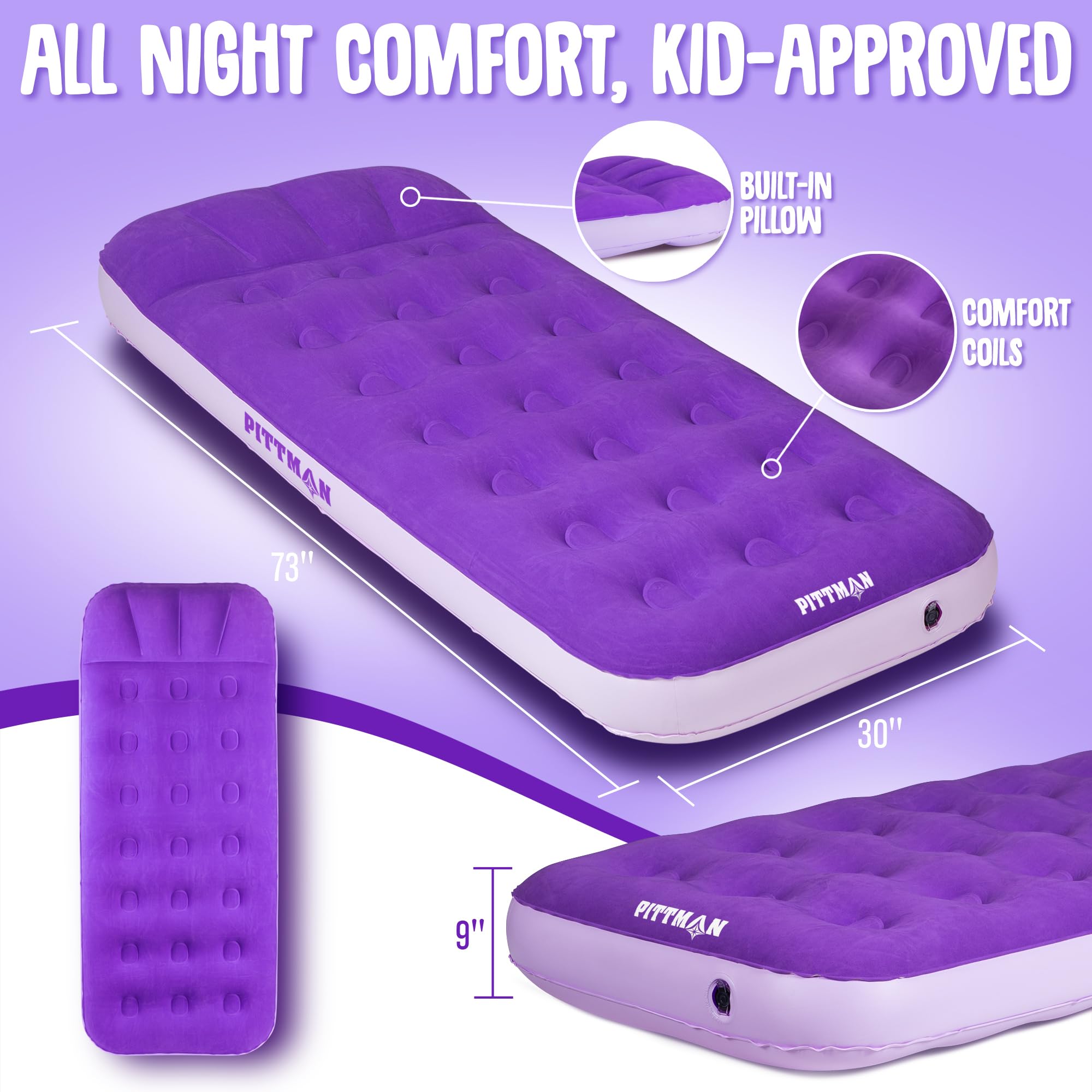 Ultimate Comfort Zone: Offer your child a dreamy night's sleep on our spacious Kidmat Air Mattress. Measuring 73" x 30" x 9", this plush mattress even comes with a built-in pillow for supreme comfort.