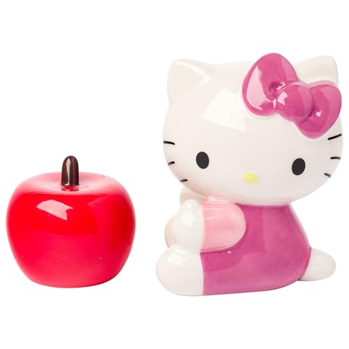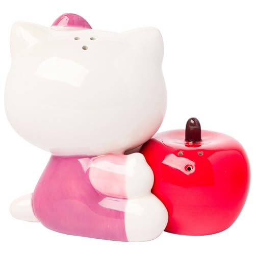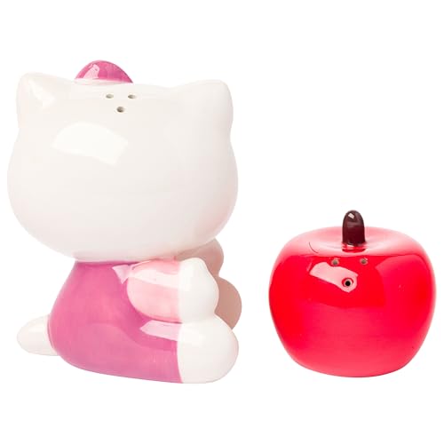 SANRIO HELLO KITTY: This adorable shaker set features Hello Kitty holding a red apple. Ceramic shaker set is 3D, showing the beloved cat from multiple angles.