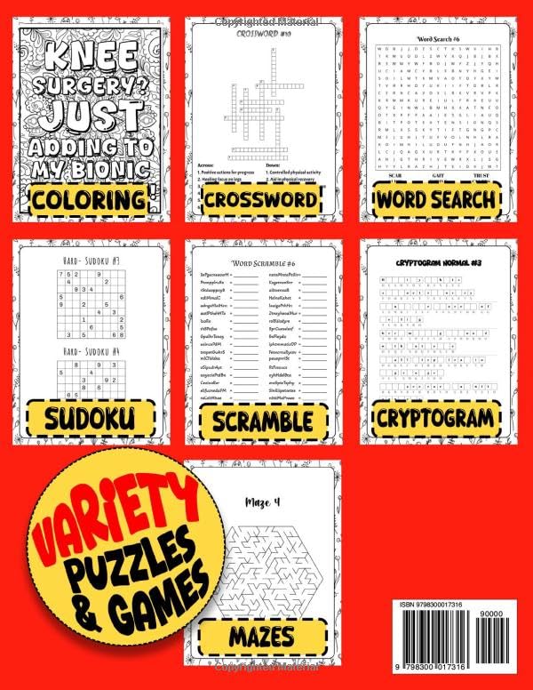 "This is My Knee Surgery Recovery Activity Book" – the perfect knee surgery recovery gift and knee replacement gift for anyone on the path to healing! With over 100 puzzles, games, and calming activities, this book is designed to make the recovery journey engaging, enjoyable, and productive. Whether you’re looking for a thoughtful gift for a loved one recovering from knee surgery or treating yourself, this book provides hours of mental stimulation and relaxation. Inside This Activity Book, You’ll Discover: Crossword Puzzles – Challenge your mind with crosswords covering a variety of fun topics. Sudoku Challenges – Exercise your logic skills with puzzles for every skill level, perfect for relaxing downtime. Word Scrambles and Word Searches – Boost vocabulary and keep your brain active with these classic word games. Coloring Pages – Unwind with intricate designs for stress relief and creative expression. Cryptograms – Decode inspirational quotes and hidden messages for a rewarding brain workout. Mazes and More – Focus on intricate mazes that provide mental stimulation and coordination practice. Why Choose This Book During Recovery? This activity book is designed to balance relaxation with mental engagement, making it the ideal knee surgery recovery gift or knee replacement gift. With activities suited for all energy levels, it’s crafted to provide comfort, entertainment, and a sense of accomplishment during recovery. A Thoughtful Gift for Every Step of the Journey 🎁 Whether it’s for yourself or a loved one, this book offers comforting activities to help pass the time, lift spirits, and promote healing. With over 100 puzzles, coloring pages, and games, this book is the ideal addition to any recovery process.