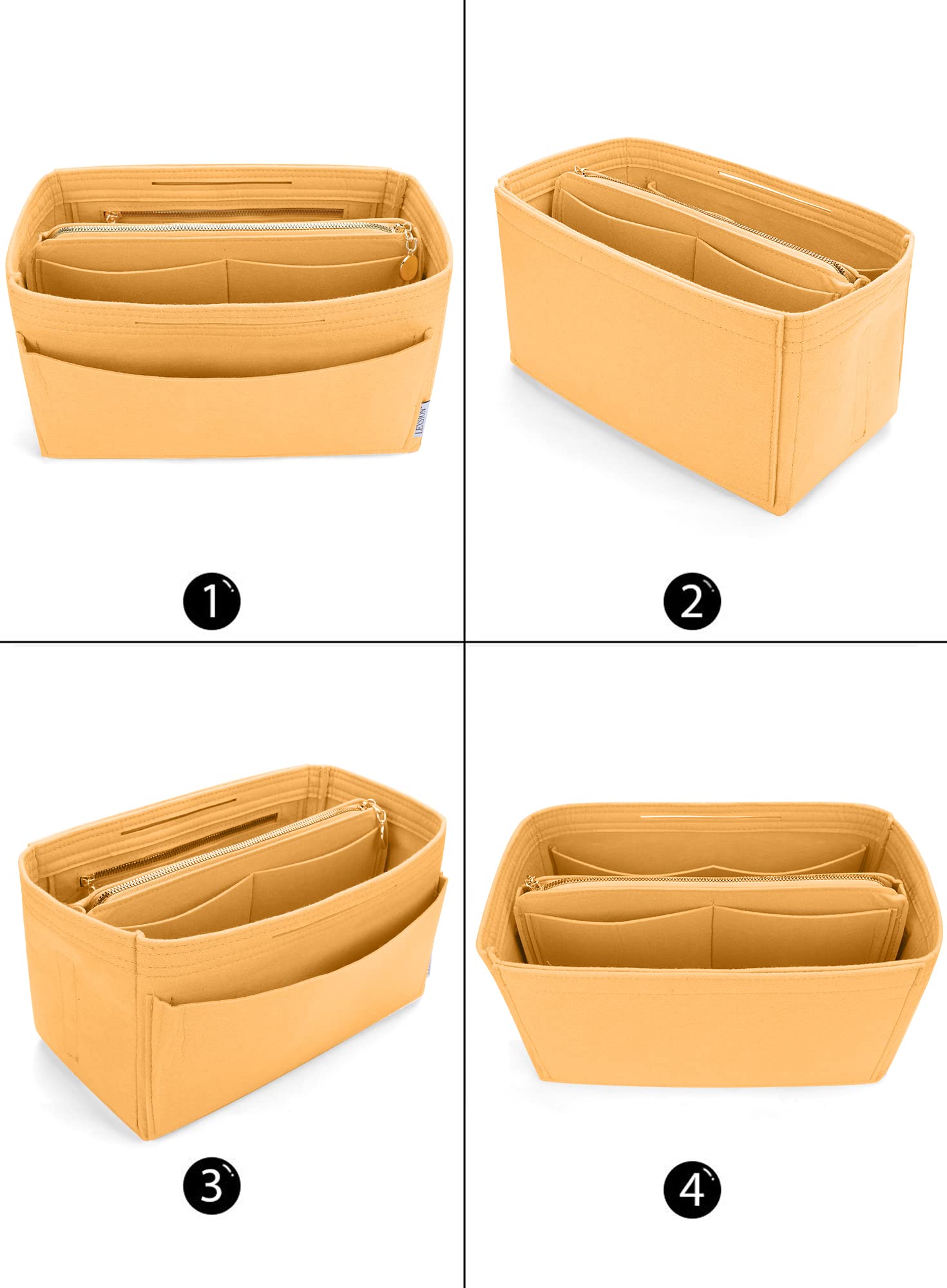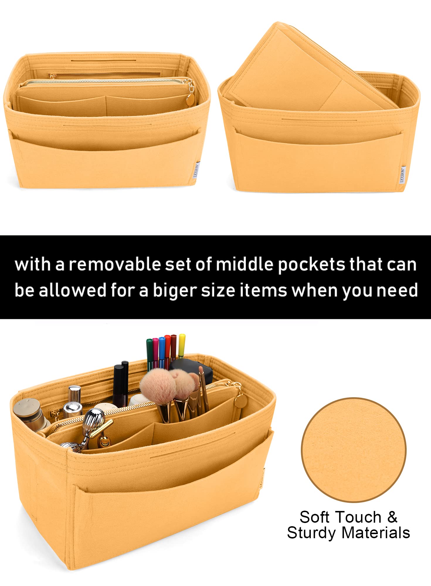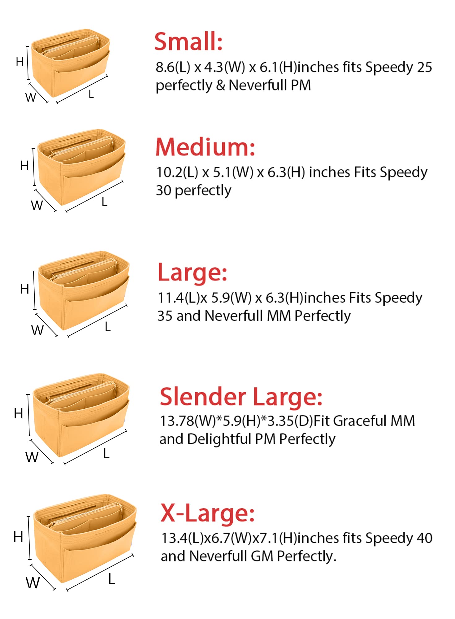 SIZE OF BAG ORGANIZER: Medium: 9.25(L)*5.9(H)*5.1(W) inch Fits Speedy 30 Perfectly. Slender Medium: 11.2(L)*6.5(H)*3.2(W)inch Fits Graceful PM. Large: 11.4(L)*7.1(H) *5.9(W)inch Fits Speedy 35 and Neverfull MM Perfectly. Slender Large: 13.78(L)*5.9(H)*3.35(W)Fit Graceful MM and Delightful PM Perfectly. X-Large:13.4(L)*7.1(H)*6.7(W)inch fits Speedy 40 and Neverfull GM Perfectly. Portable and Compact Purse Perfectly For any Brand.L*H*W means (Length*Height*Width)