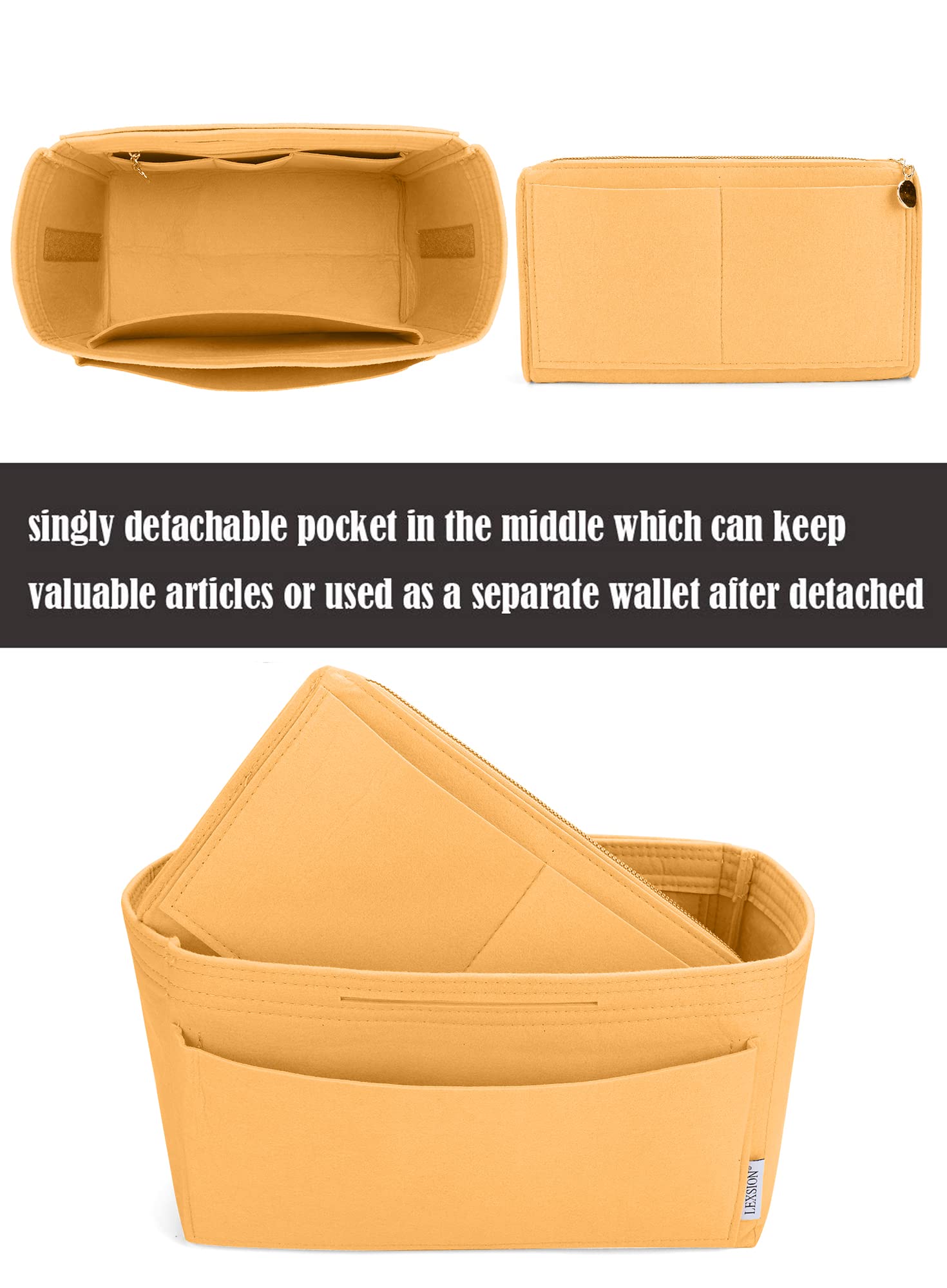 KEEP BAG CLEAN&SHIPSHAPE:13 Pockets Total Purse Organizer,3 exterior pockets, 10 interior pockets with singly detachable pocket in the middle which can keep valuable articles or used as a separate wallet after detached.It keeps everthing neat and well organized shaped.