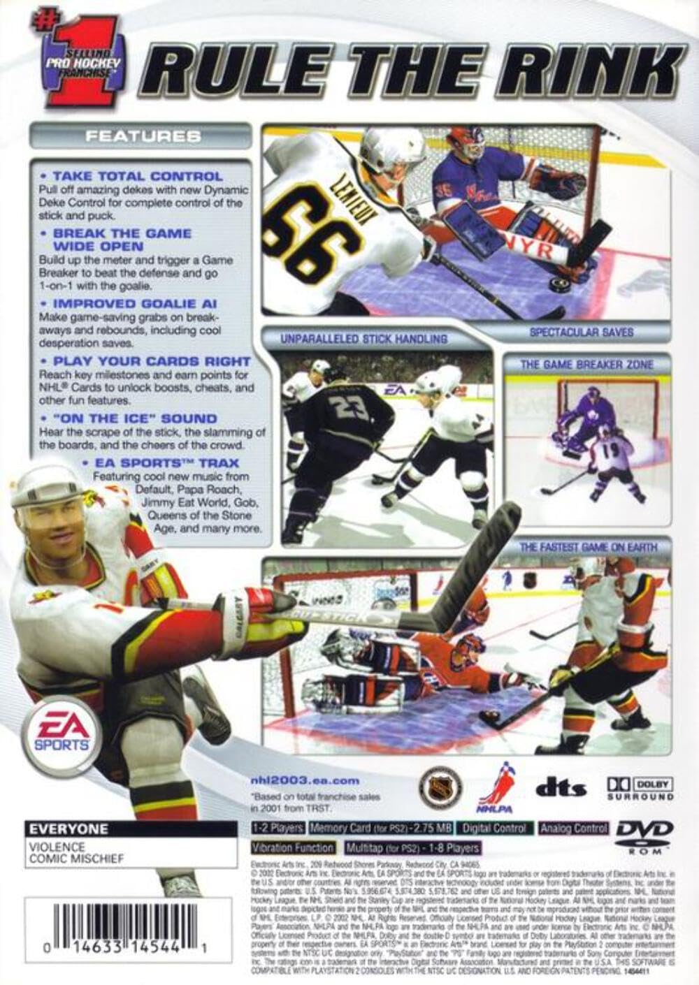 Product Description Take control of the definitive hockey experience, NHL 2003. Whether you're skating as a rookie or lacing 'em up as a pro, pull off 90 miles-per-hour slap shots and awesome moves with Dynamic Deke Control. Fun and easy user-activated dekes let you trigger one of 8 different moves with the touch of a button. And when you get really good, take complete control over the stick and puck and create your own dekes to blast past the opposition. Show off your superior skills and earn a Game Breaker to enter a zone where surroundings move in slow motion, intensity increases and you feel your heart pounding as you blast free for a goal. Amazon.com This hockey sim has a number of detailed control features. User-activated dekes give you full control of the puck, for example, and when you build enough momentum, the action slows in key moments. A new graphics and animation engine means NHL action comes to life as never before. There are also new puck physics and goalie AI, so the players and puck respond more accurately to your actions. There are four game modes, a create-a-player feature, real on-ice sounds, and dynamic camera work.