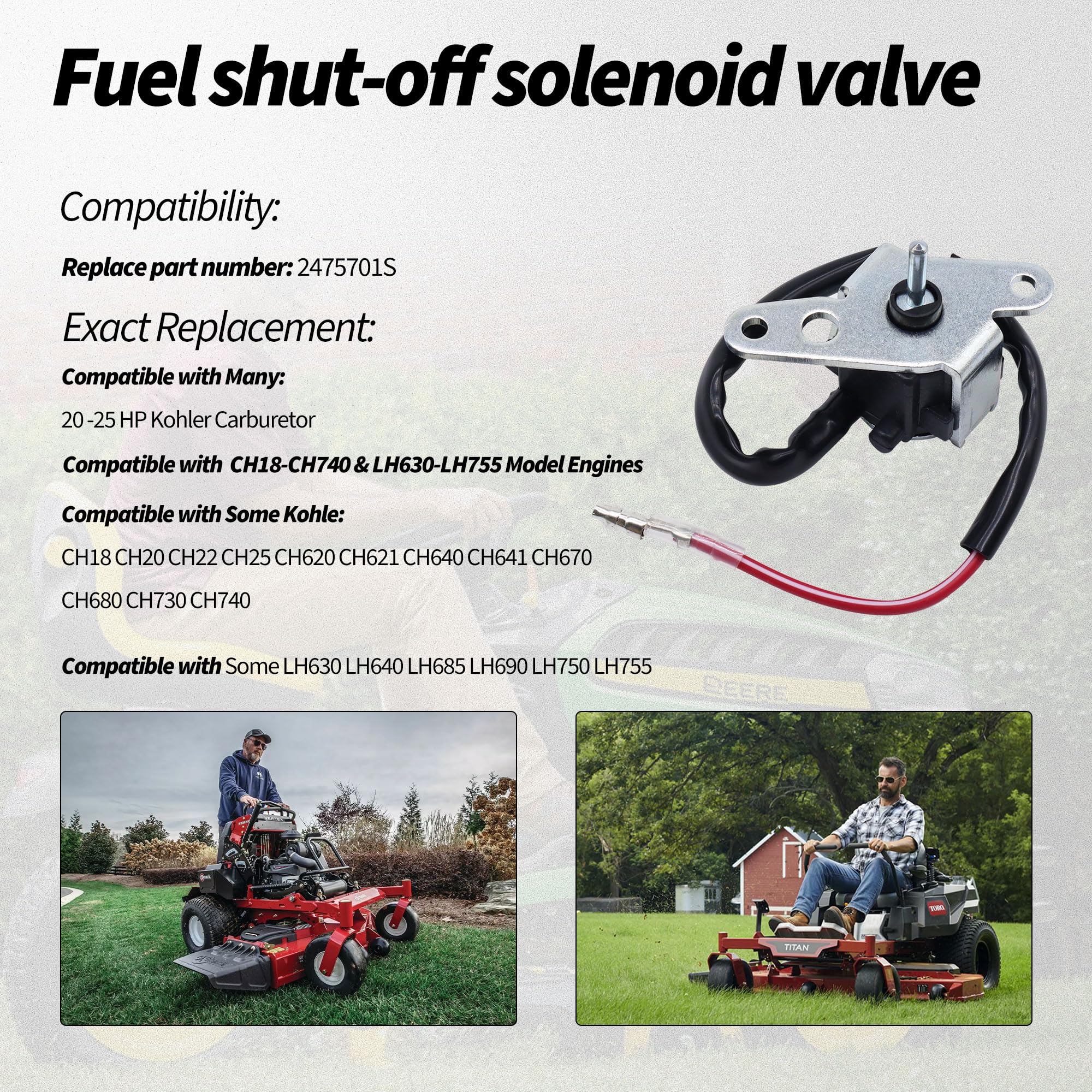 𝐅𝐢𝐭𝐦𝐞𝐧𝐭: Fuel Shut-Off Solenoid for various: Compatible with Exmark, Kohler, Toro. Compatible with Compatible with Some Kohler CH18 CH20 CH22 CH25 CH620 CH621 CH640 CH641 CH670 CH680 CH730 CH740, Compatible with Some LH630 LH640 LH685 LH690 LH750 LH755 Model Engines