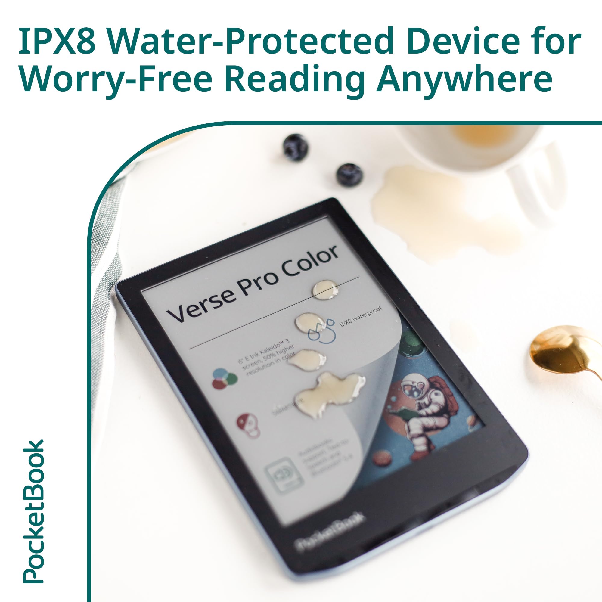 PocketBook Verse Pro Color - a 6-inch model with the latest E Ink Kaleido 3 color screen designed to provide an immersive reading and listening experience. Compact yet powerful, Verse Pro Color impresses with a set of advanced functions and characteristics, like IPX8 water protection, audiobook support with Bluetooth, Text-to-Speech function, adaptive SMARTlight feature and Quad Core processor. The new compact Verse Pro Color promises an exceptional experience in color reading for avid book enthusiasts who never put a book down.