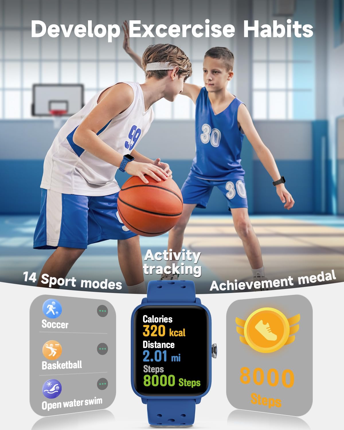 BIGGERFIVE BRAVE Smart Watch for Kids with All-Day Activity: Automatically counts steps, distance, calories burned, and active minutes. Supports 14 sports modes like walking, running, cycling, swimming, basketball, and more.
