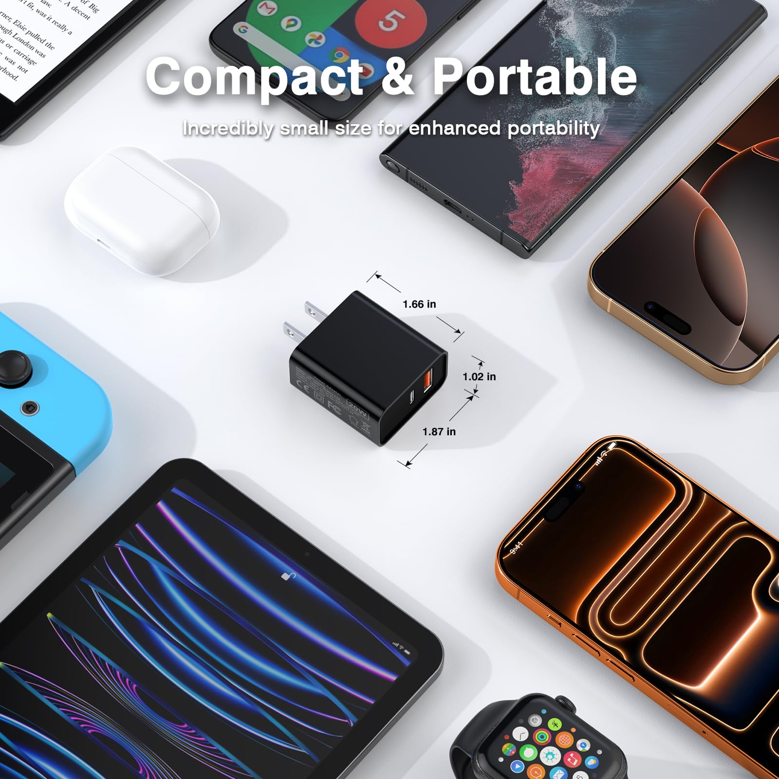 Universal Compatation: Designed for iPhone 11/12/13/14/15/16/17/Pro/Pro Max/Plus/iPhone 8 and later. The USB charging adapter is compatible for iPhone, iPad, iPod, smartphone, MP3 / MP4 players, play equipment, GPS devices, PC tablet, Google Nexus Tablet, Samsung Galaxy Tab and other digital devices compatible