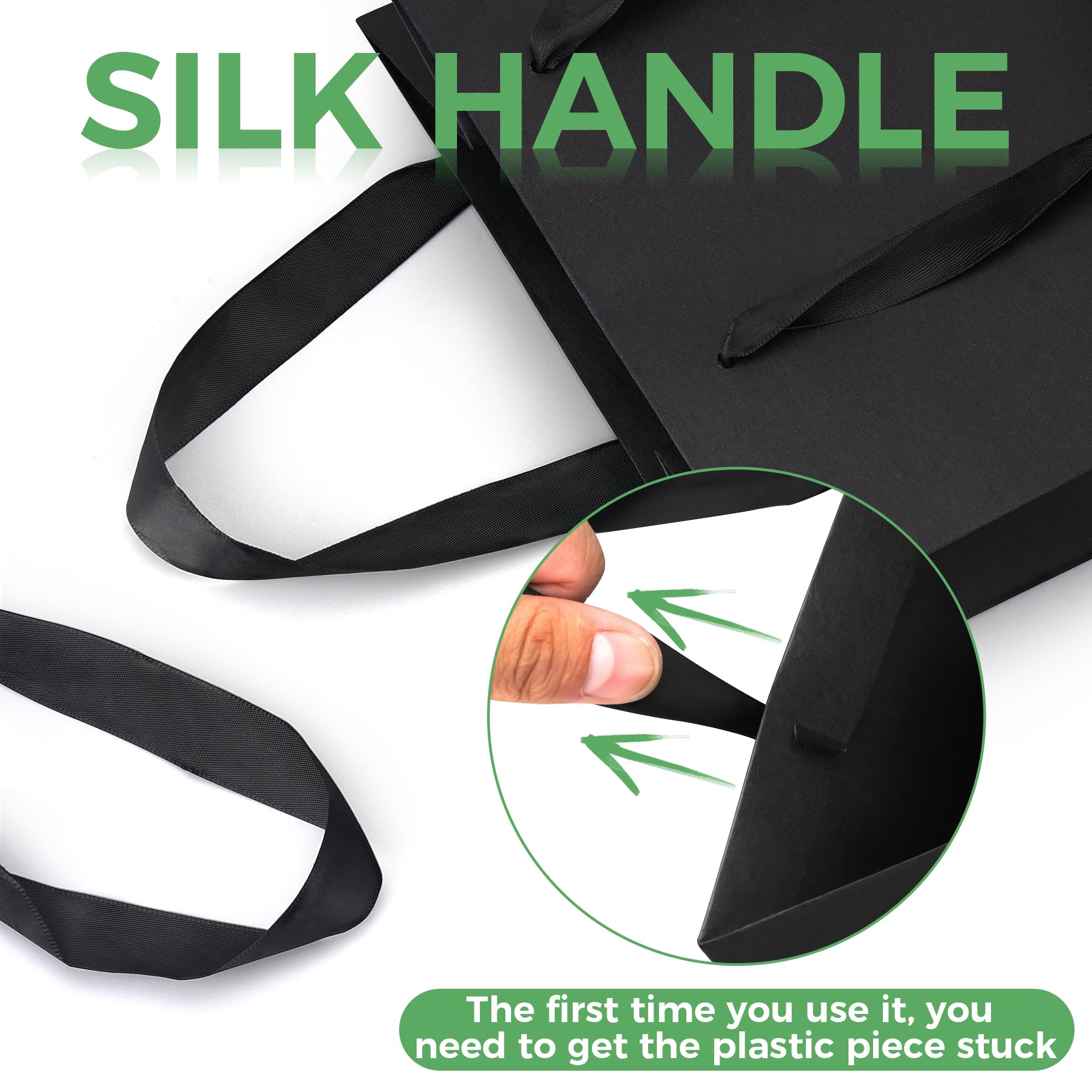 Comfortabl Silk Handles: The broad silk handles provide a comfortable grip, enhancing black kraft bags's luxurious feel. Black paper bags's elegant and chic appearance adds a special touch of sophistication to your gifts, making every occasion more memorable.