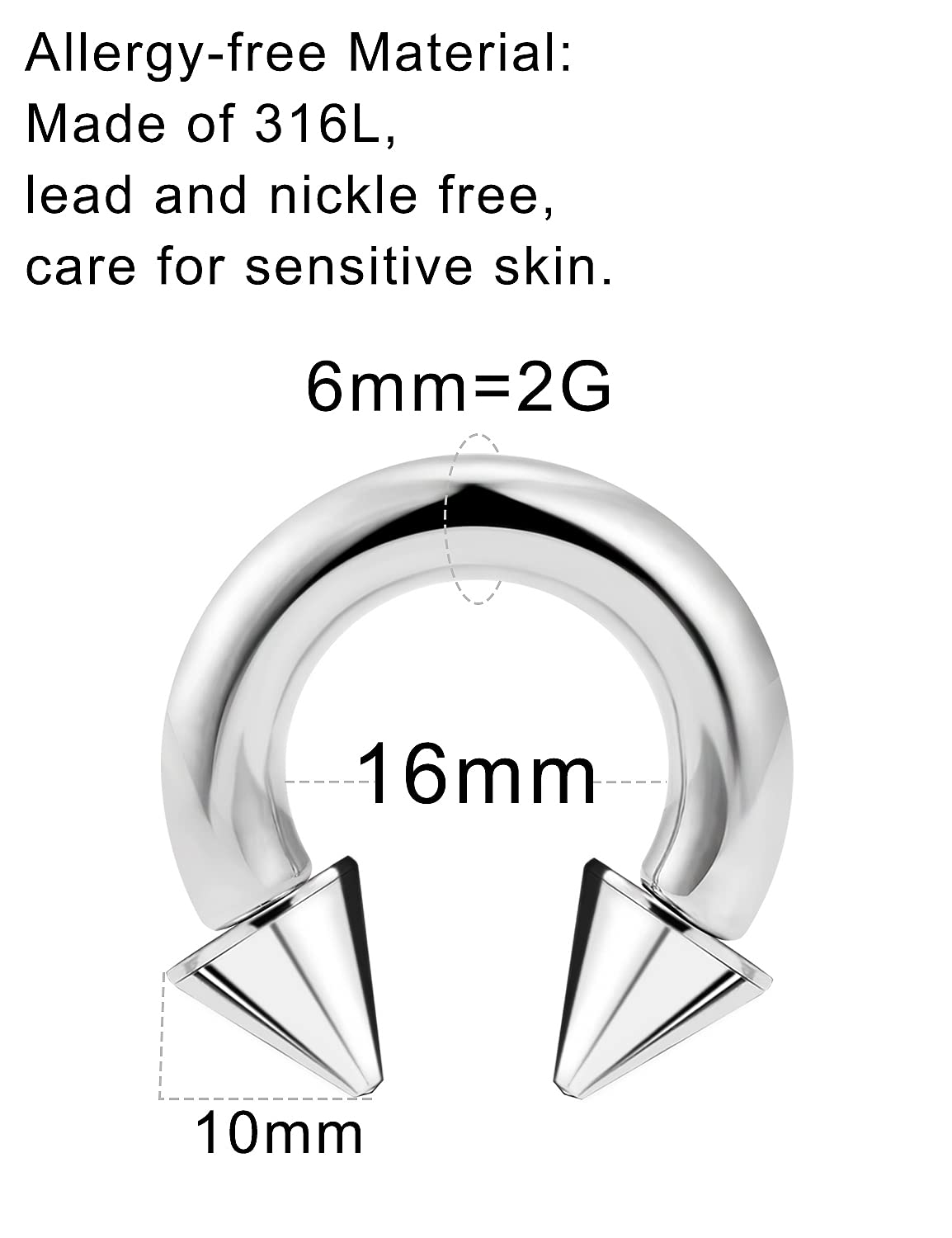 Thickness: 2G (6mm); Spike Diameter: 10mm; Inner Diameter: 16mm (5/8inch); Color: Silver-tone.