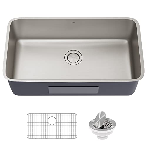 OUTER SINK DIMENSIONS: 32 7/8 in. L x 18 7/8 in. W x 9 1/4 in. D; INNER DIMENSIONS: 31 1/8 in. L x 17 1/8 in. W x 9 in. D; Minimum Cabinet Size: 36 in. – SINK KIT INCLUDES: Large single bowl undermount sink, protective bottom grid with soft rubber bumpers, VersiDrain assembly with removable strainer and FlipCap