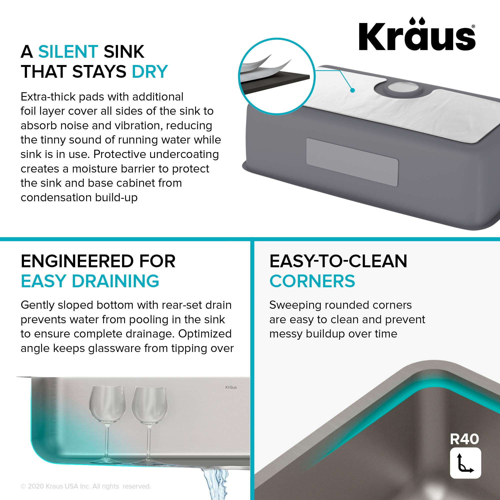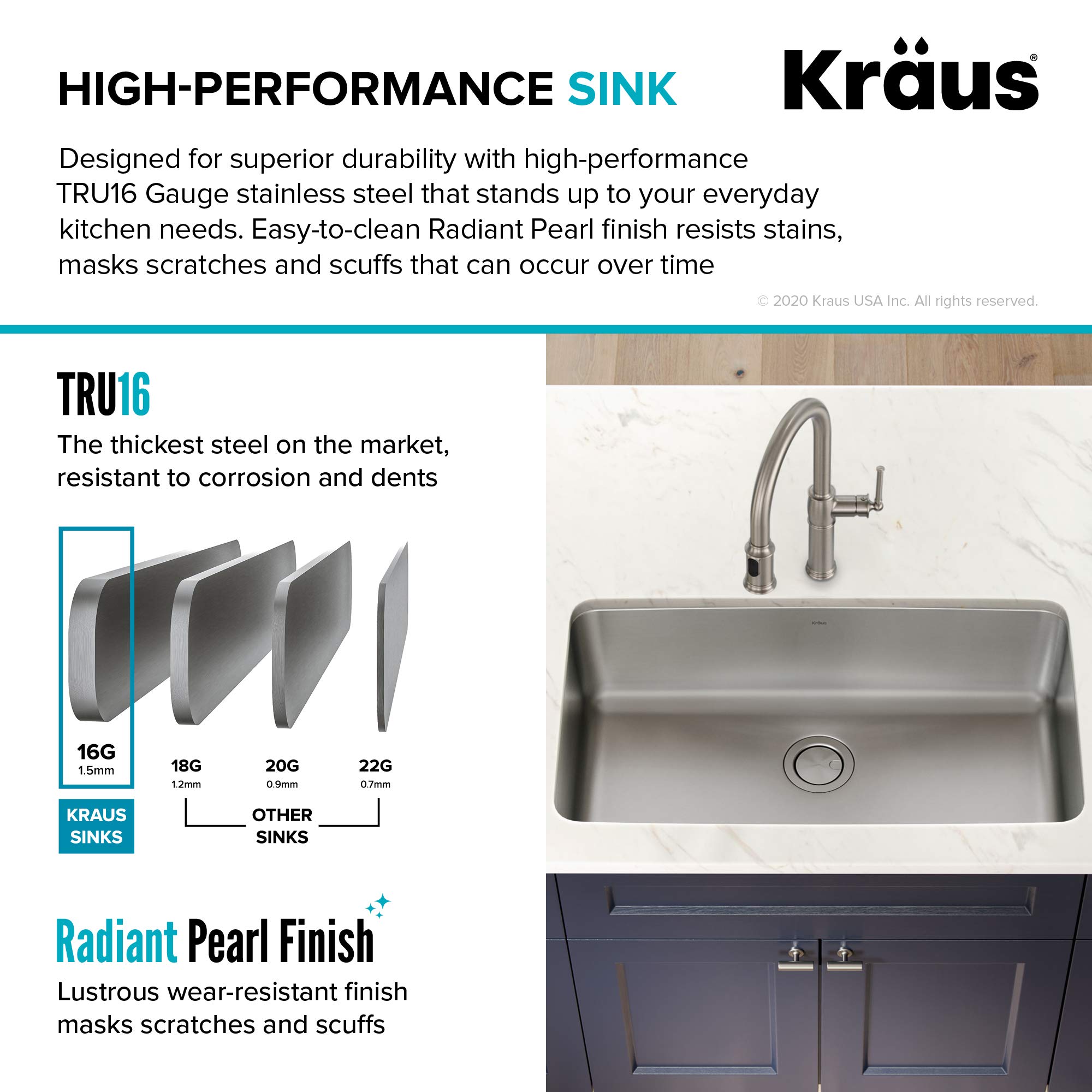 HEAVY-DUTY CONSTRUCTION with high-performance TRU16 Gauge stainless steel that stands up to your everyday kitchen needs – RADIANT PEARL FINISH: Easy-to-clean and wear-resistant, masks scratches and scuffs that can occur over time – SUPERIOR SOUNDPROOFING: Ultra-quiet NoiseDefend pads with innovative foil layer absorb noise and vibration while sink is in use – Anti-condensation undercoating helps prevent moisture build-up to reduce the risk of water damage in the base cabinet
