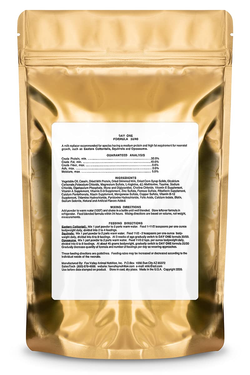 The best formula for Eastern cottontails, possums and baby squirrels from 2 weeks to 4 weeks of age*. Fox Valley Formula 32/40 is a rehabber-approved powdered milk formula that produces better weight gain, fewer digestive problems, and better acceptance than other formulas. Fox Valley Formula 32/40 mixes easily, smells wonderful, and there is no need to supplement the formula with any added cream, yogurt, or probiotics.