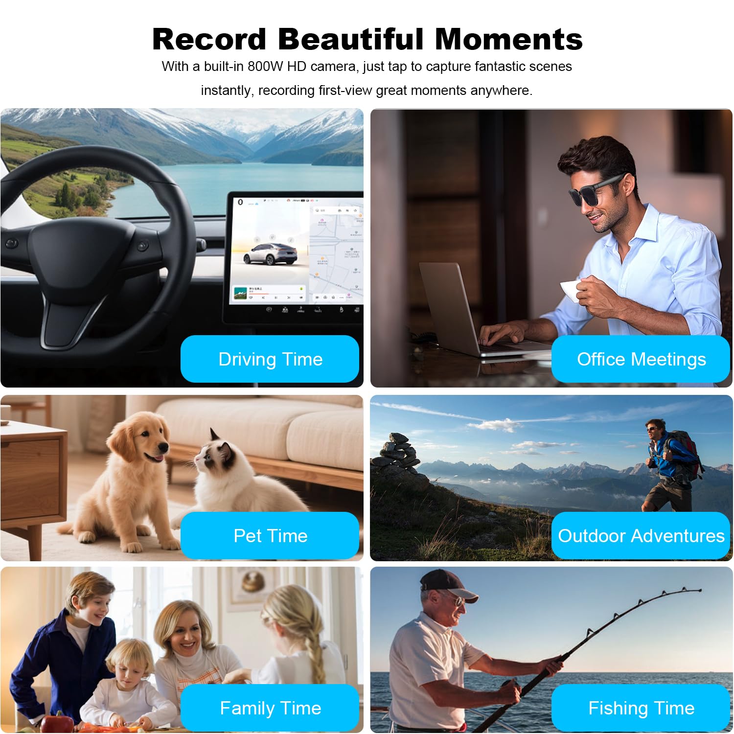 📸 【4K HD Imaging & 1080P Video Stabilization】 Featuring an 8MP HD camera, these smart glasses capture smooth 30fps videos and support 32MP high-resolution photos. Upgraded with multi-frame noise reduction and an advanced video stabilization algorithm, they deliver clear and stable footage – ideal for vlogging, travel recording, cycling, outdoor sports, fishing, and family moments.