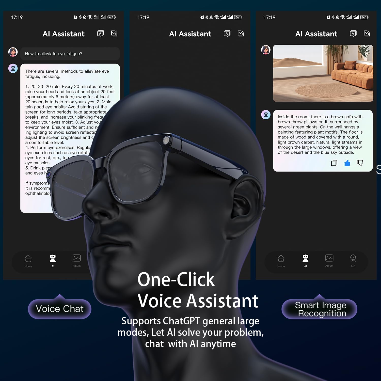 🗣️ 【AI Voice Assistant】 Activate via voice command for hands-free object recognition, smart conversations, Q&A, and instant information access. Control your glasses effortlessly while on the move.