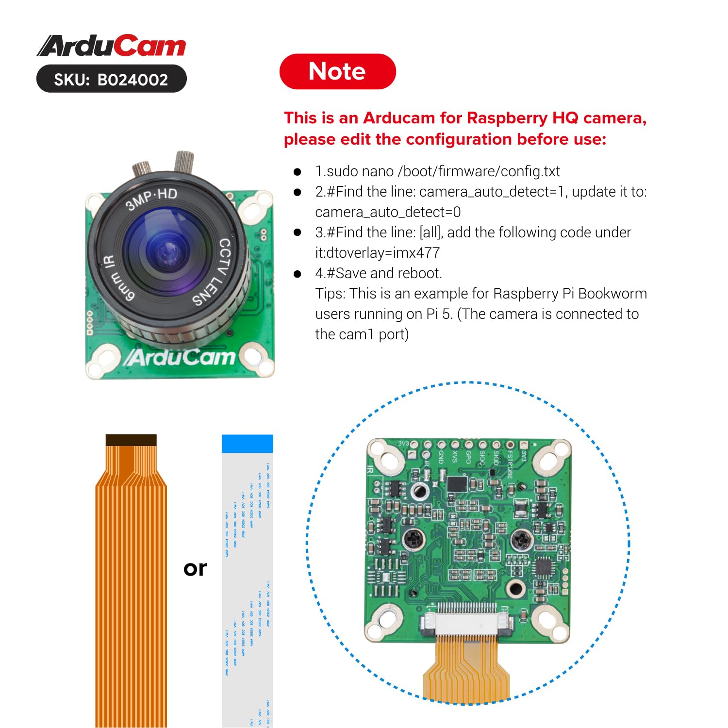 Note for customers who use a Raspberry Pi 5: Since there are 2 camera ports on Raspberry Pi 5, please remember cam1 is the default one, while you connect the camera to cam0, please use the dtoverlay code: dtoverlay=imx477, cam0
