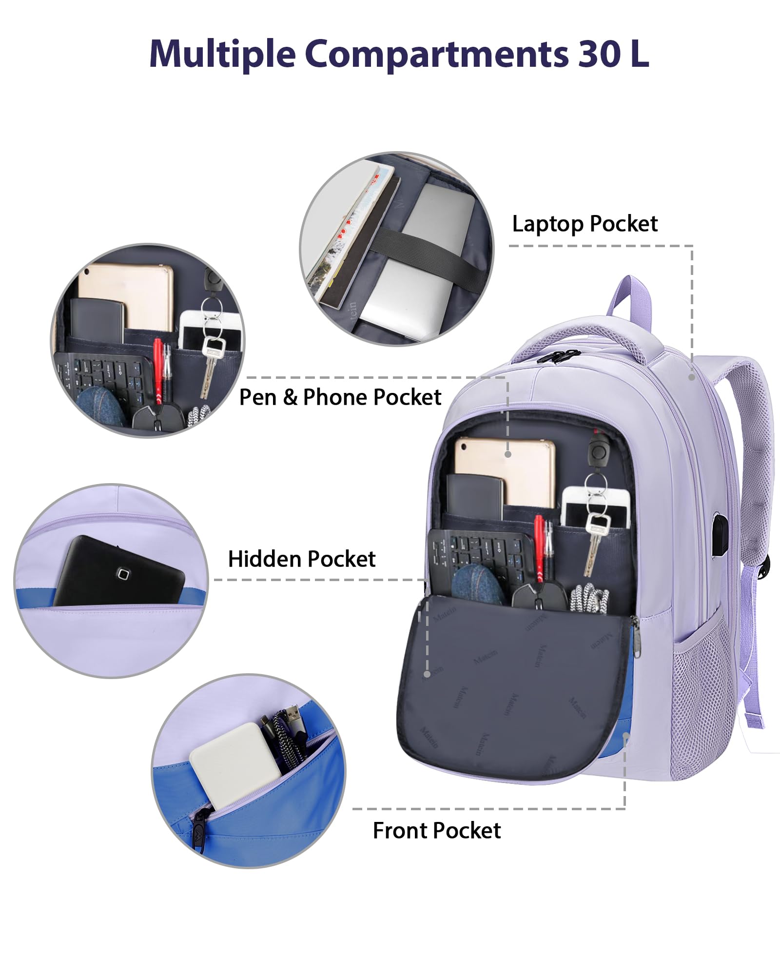 Multiple Pockets: Lightweight backpack for women has a separated tsa laptop compartment fits 15.6, 16, 17 inch notebook and tablet. Main compartment is roomy for travel clothes, business files. Front compartment storage daily tech accessories. Side mesh pockets hold water bottle or umbrellas. Back anti theft pocket protect your wallets, passport. Ensuring the zipper is fully down with the puller at the bottom. This keeps your belongings safe from unexpected openings when you're walking