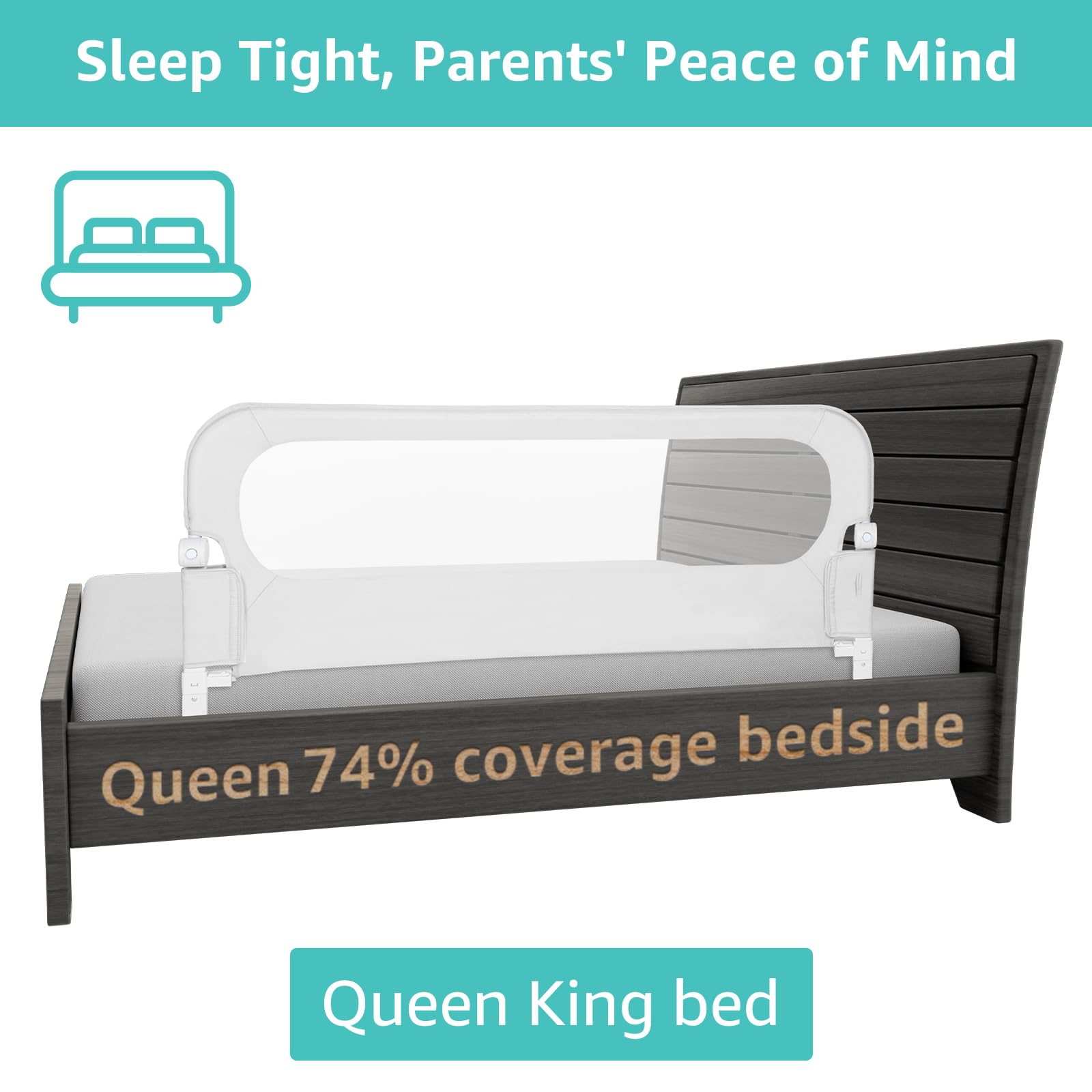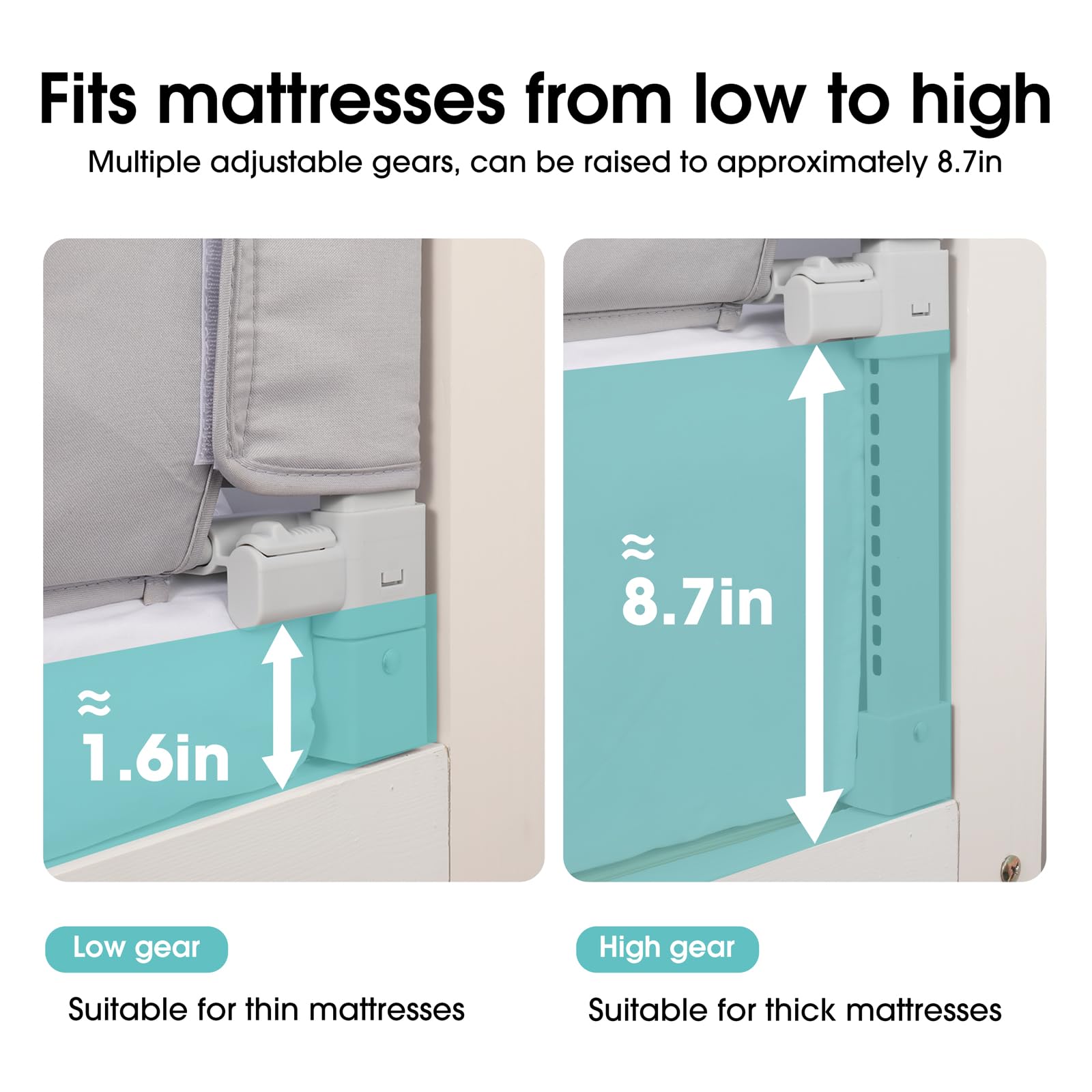 Adjustable Heights Bed Gate:The 58.7” length almost covers the twin-to-queen size length of the bed and the adjustbable height is plenty to accommodate most any mattress thickness.OVERALL SIZE:58.7“(L)X26~34.7"(H)X12"(W). The bed rail is USPTO Patent Approved