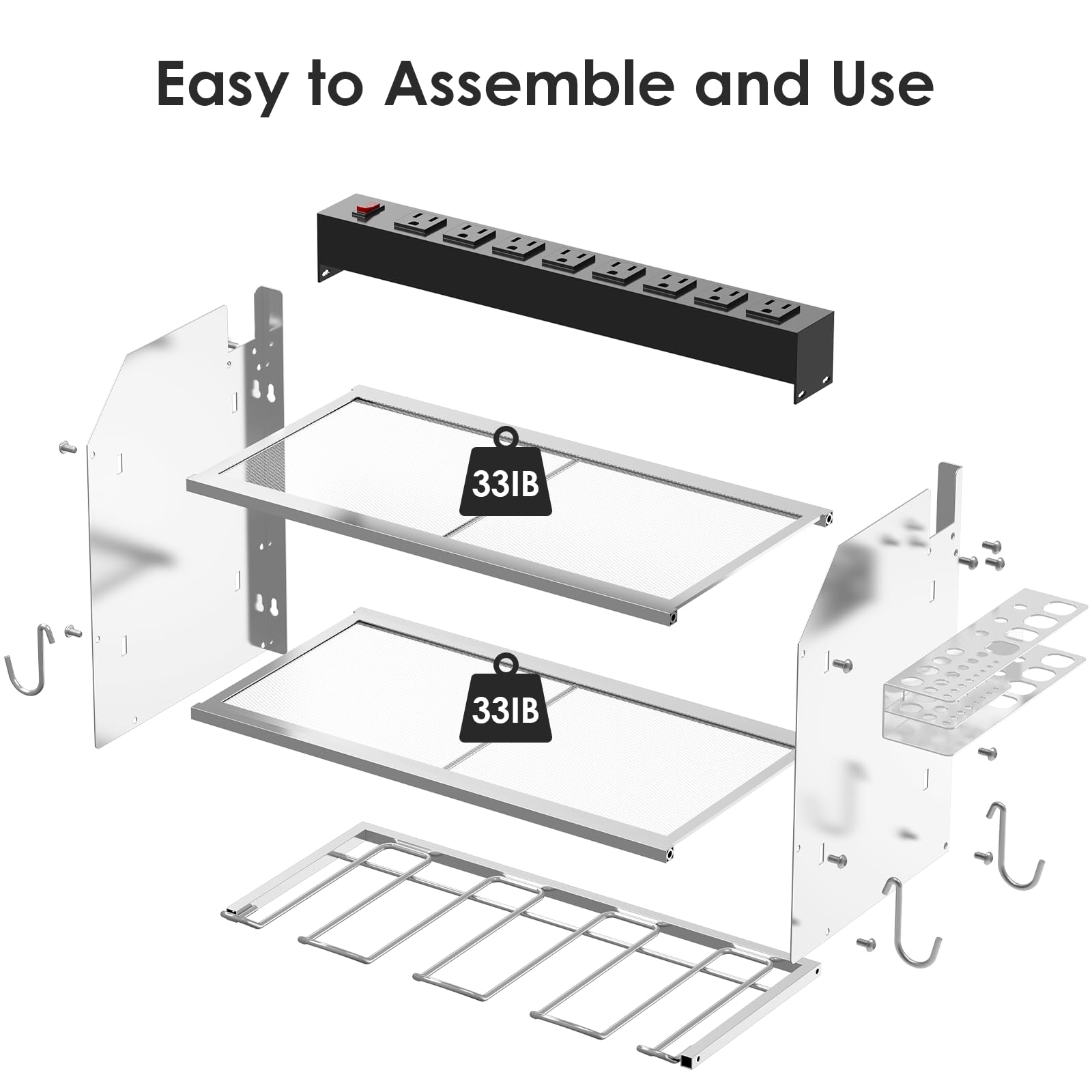 Easy to assemble and mount on a peg board, If you need more storage space, you can connect the two shelves (or more) by screws. Each layer of the grid can support a maximum weight of 33IB. Made from heavy gauge steel. Amazing christmas or father's day gift for men.