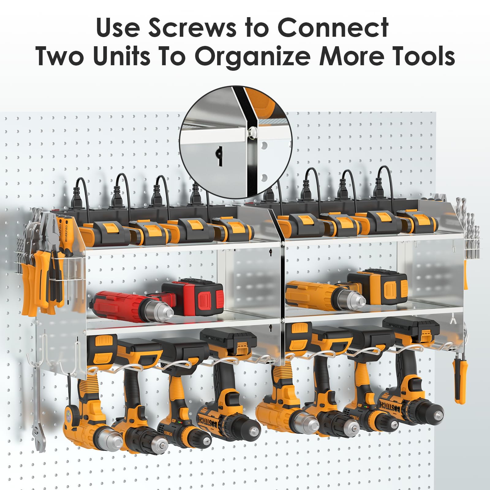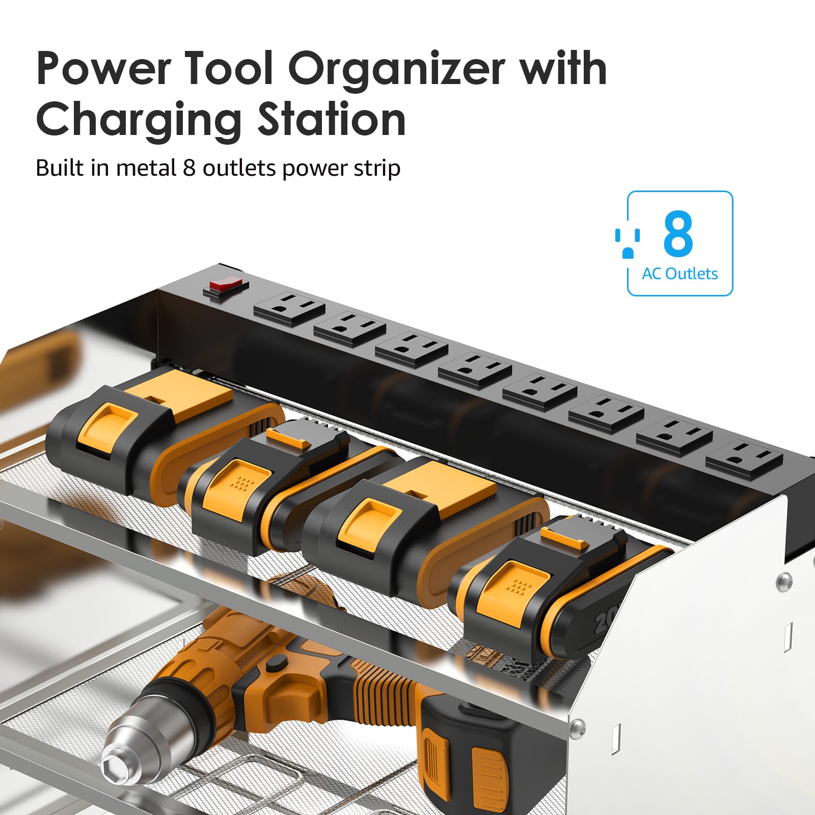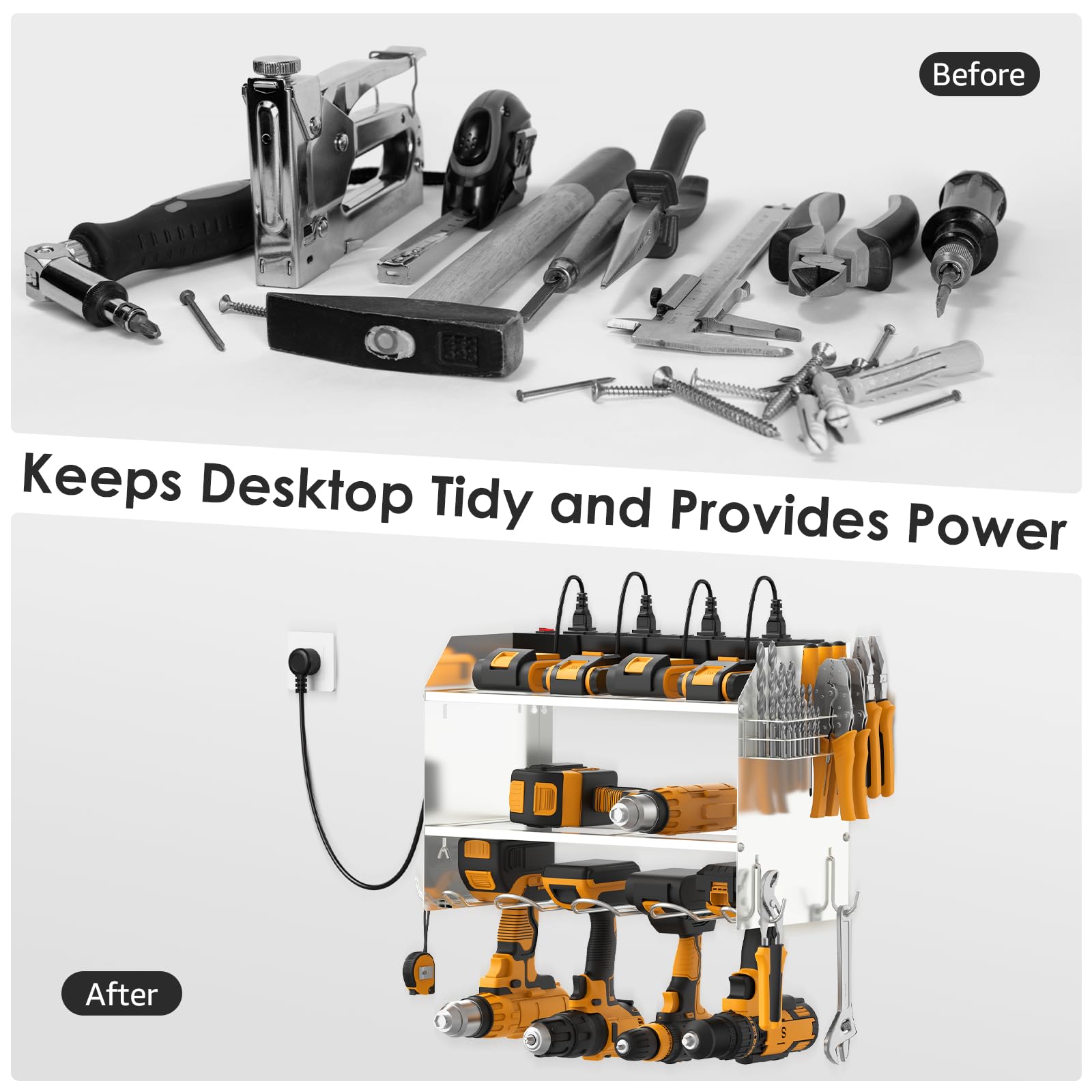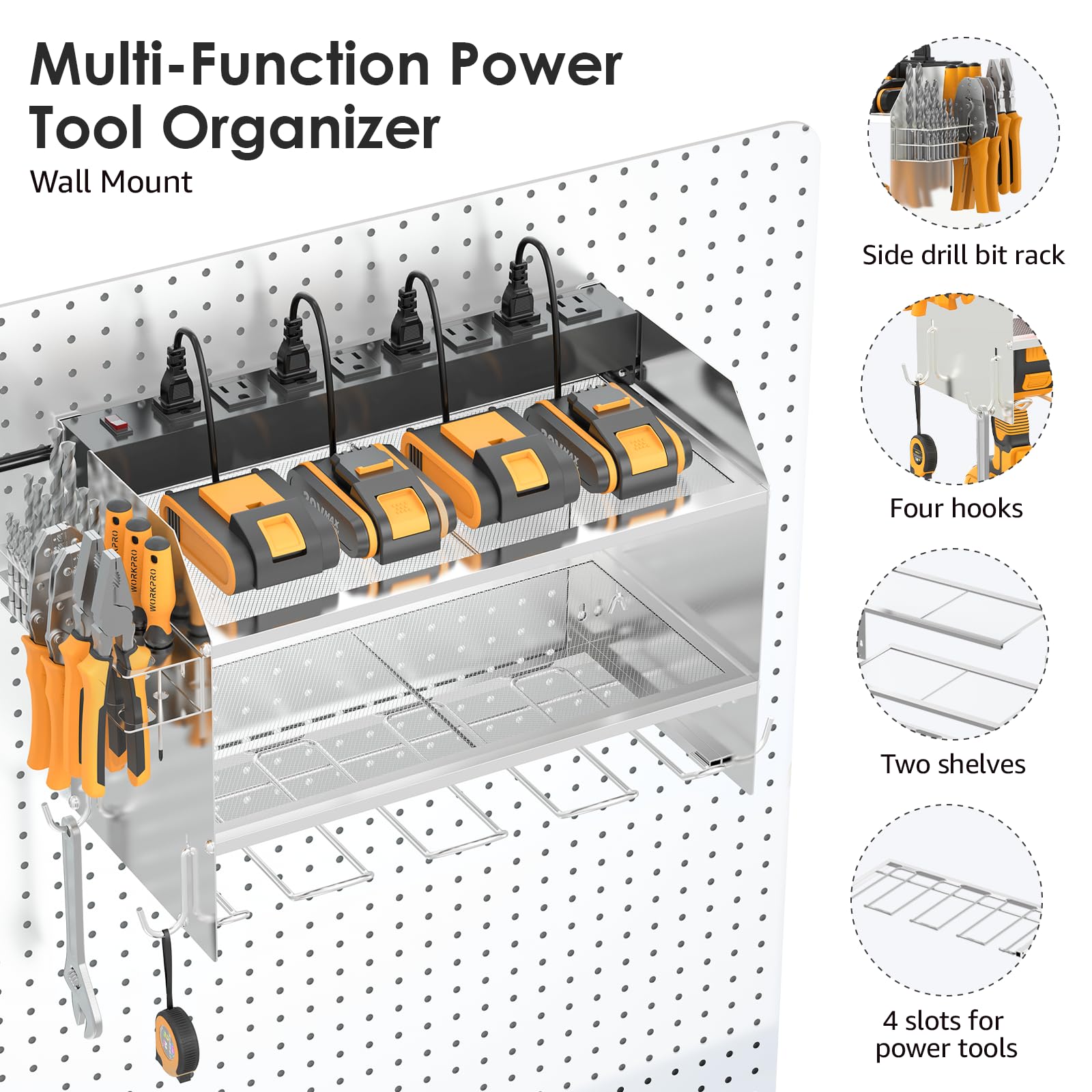 Wall mount power tools organizer come with 4 slots, 4 hooks and drill bit rack, built-in power strip, double layer structure can keep rechargeable tools organized in the work area and save your bench space. The tools in the picture are for demonstration purposes only and are not included.