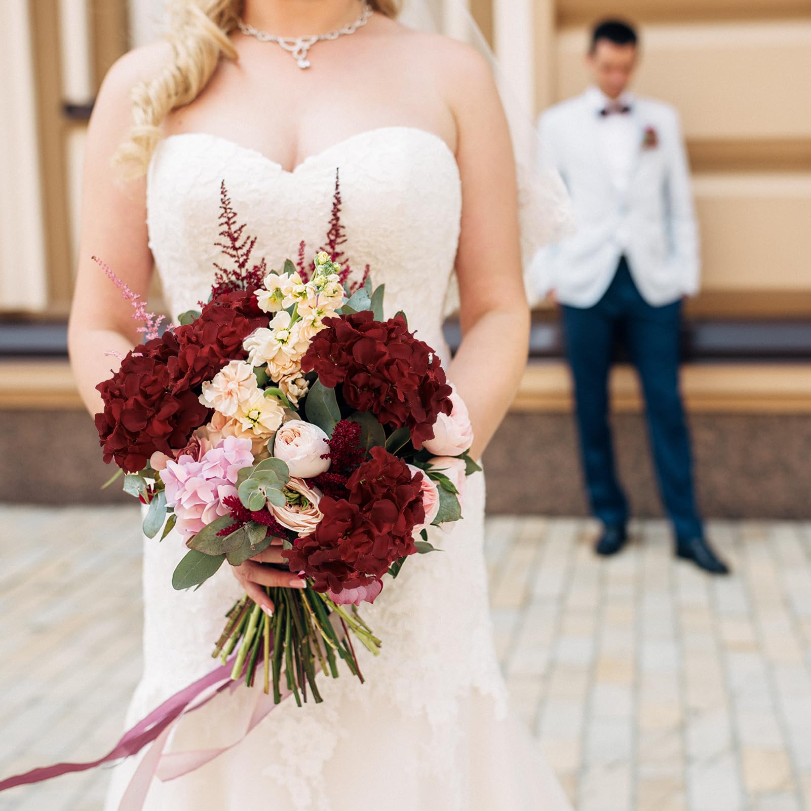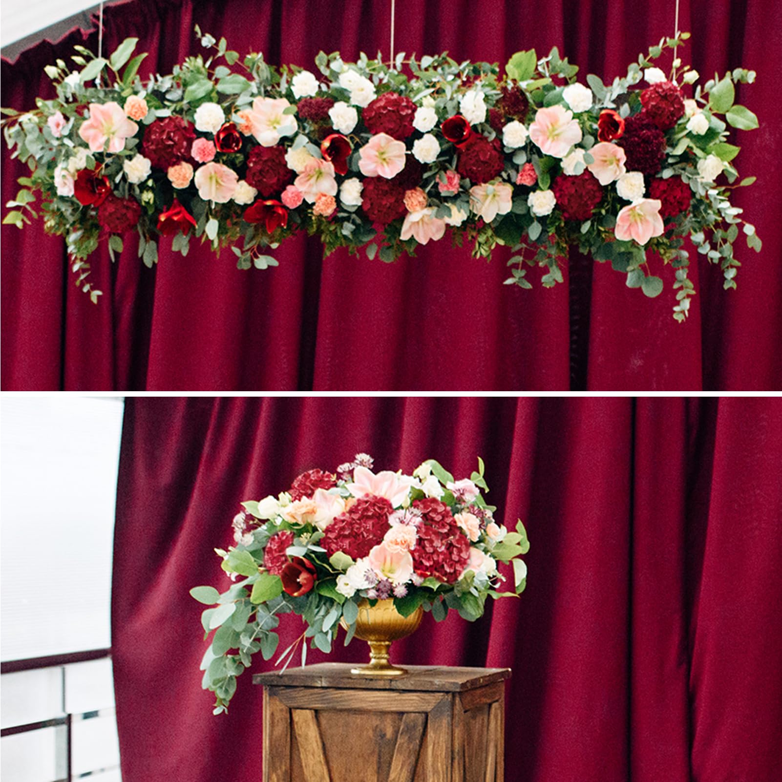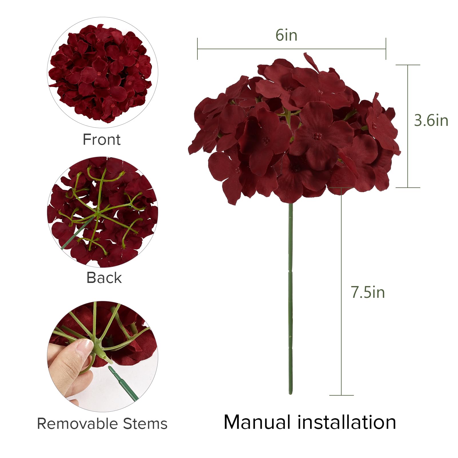 Size and Material: Burgundy hydrangea head diameter is about 6 inches, height is about 3.6 inches, made from silk cloth and plastic; Independent stem length is about 8 inches, made of plastic with iron wire inside, can be bent or cut freely to meet any decor style or occasion