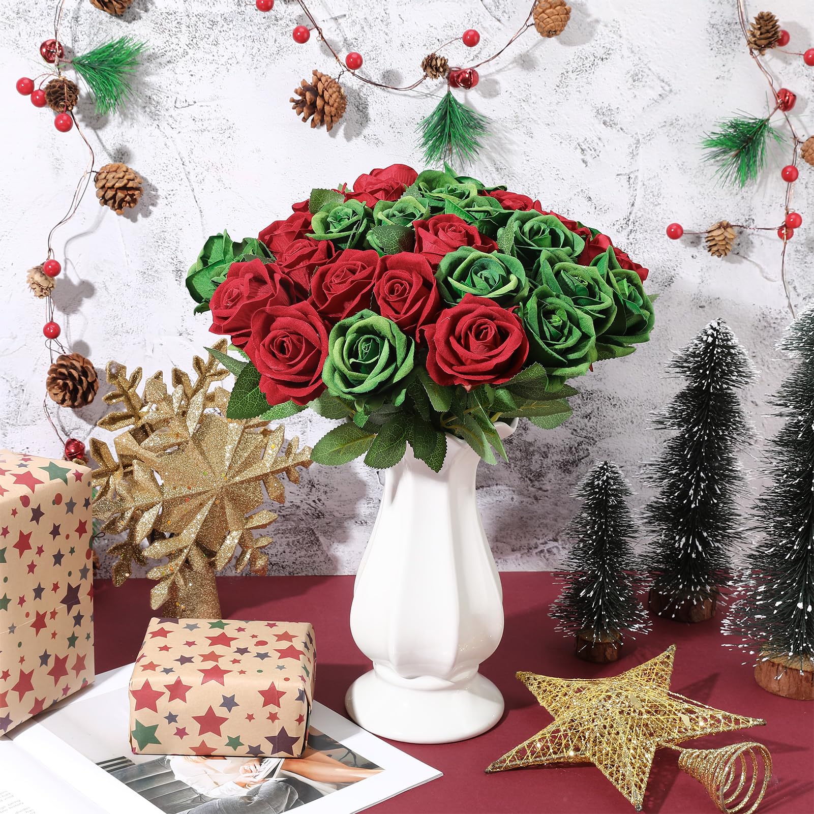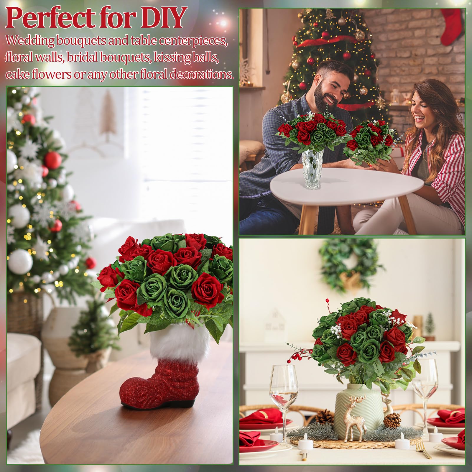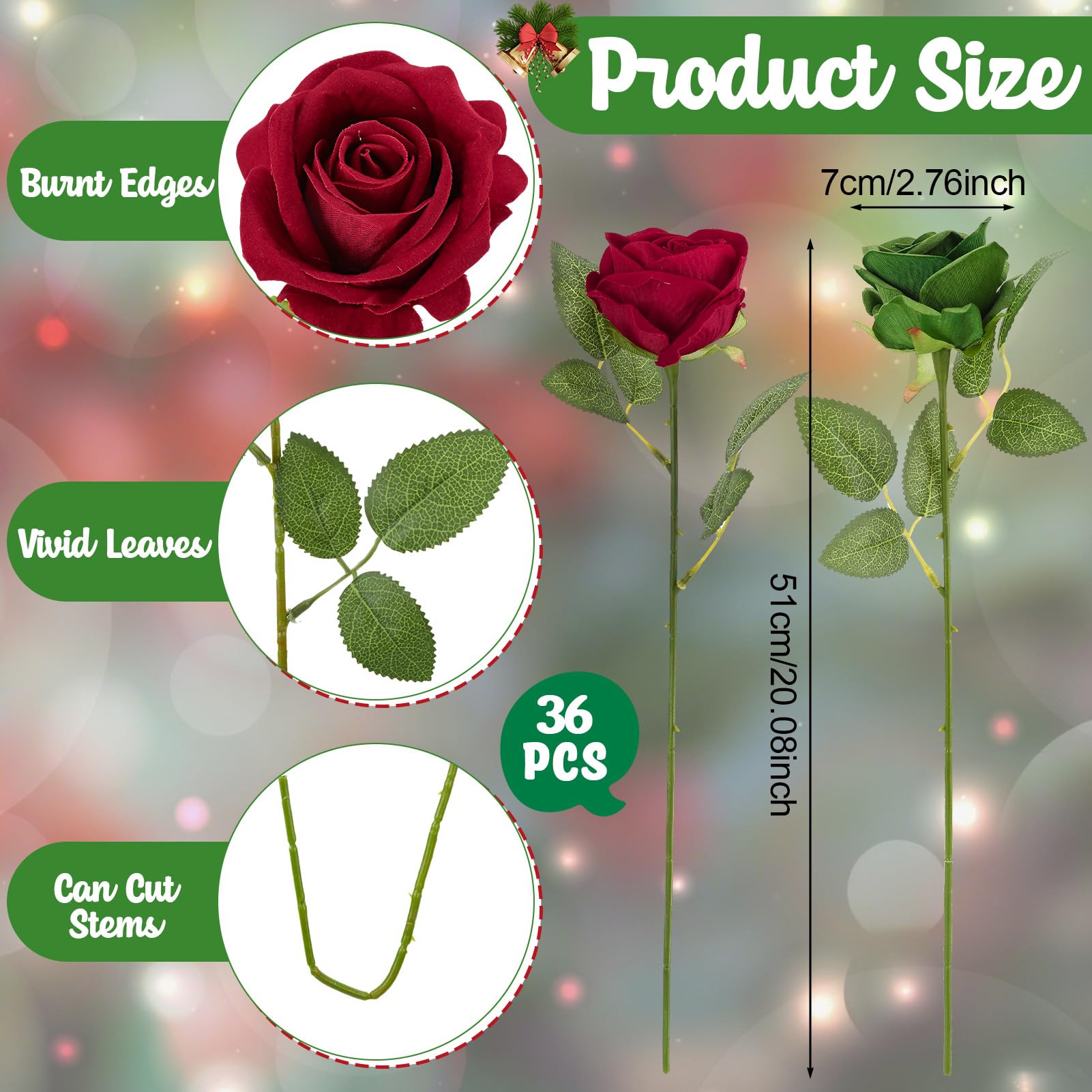 Natural Appeal: Receive 36 green red artificial roses with stems, each intricately crafted with lifelike details and gentle textures. Vivid green red green hues and realistic petal designs infuse a sense of elegance and beauty into any environment