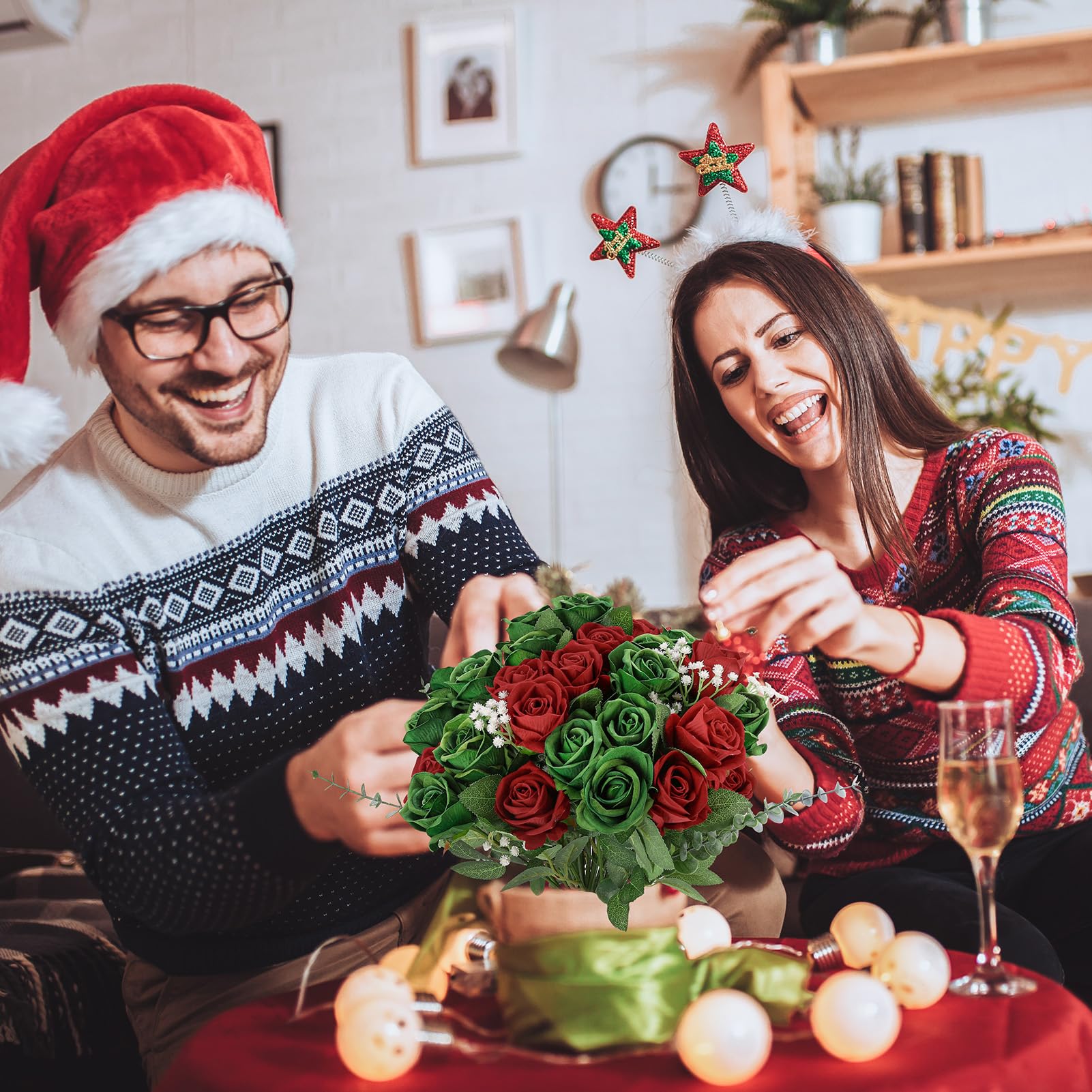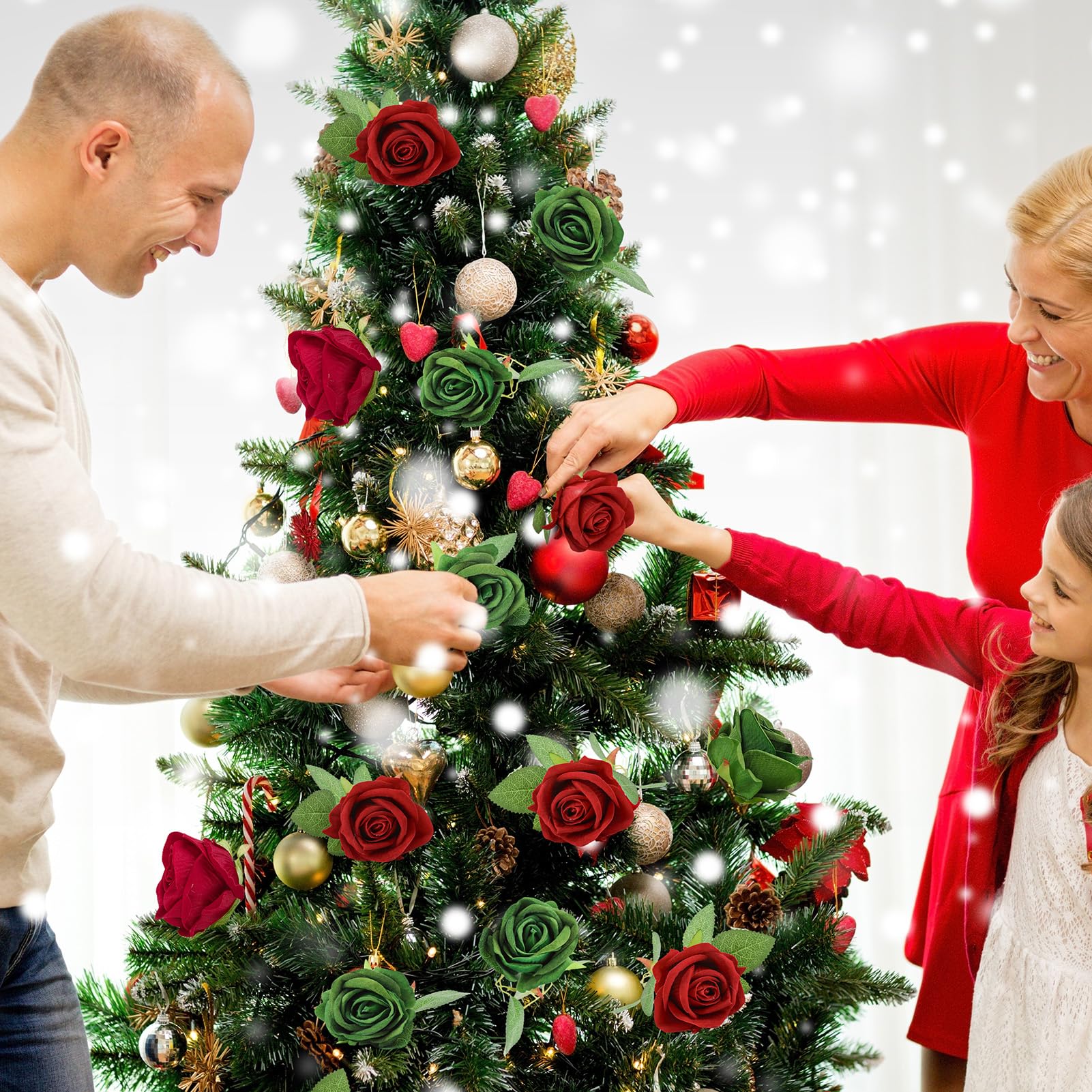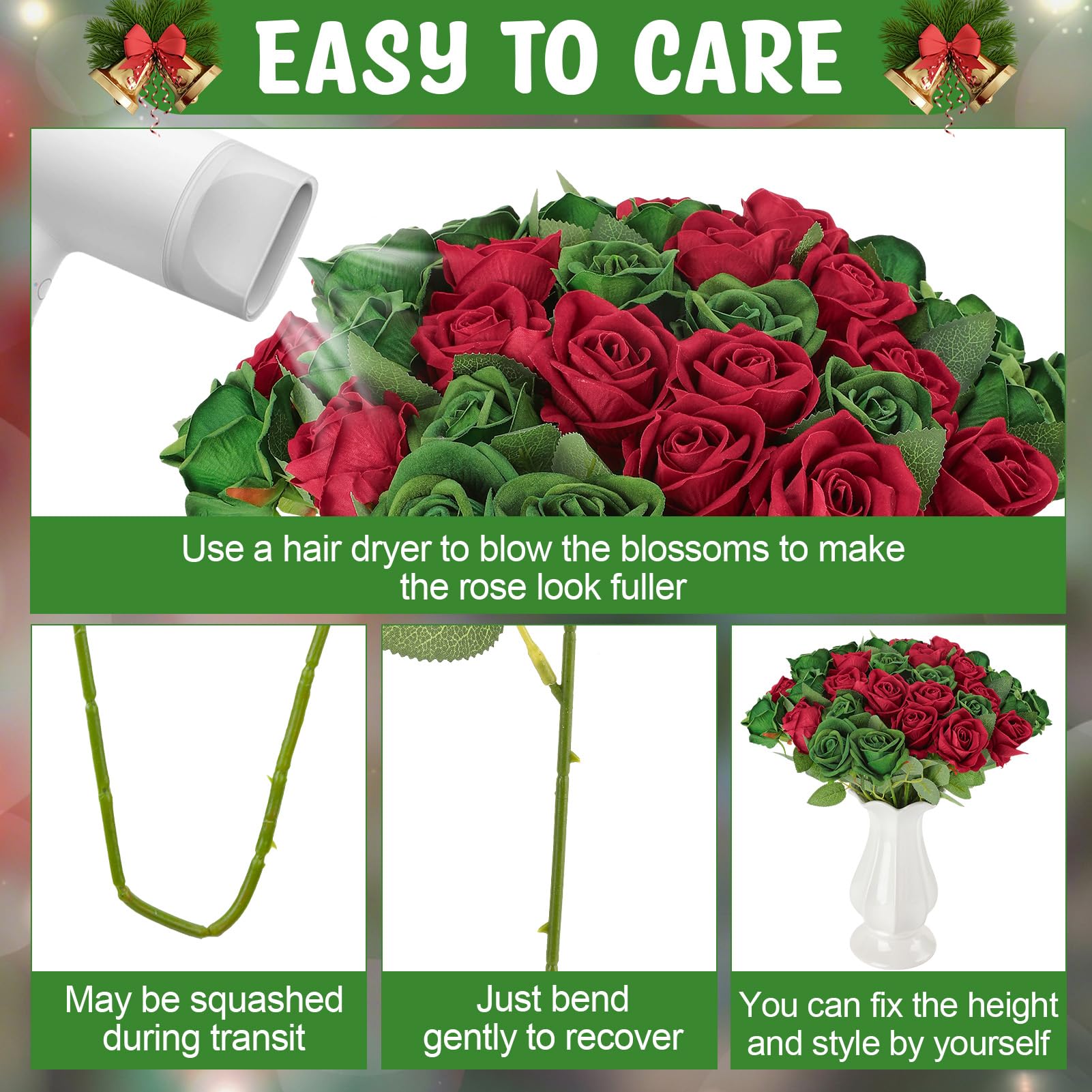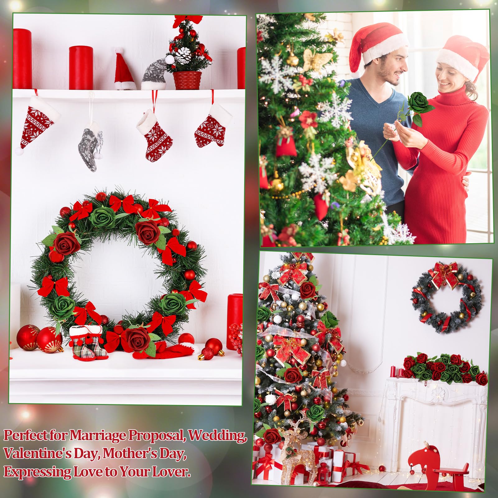Natural Appeal: Receive 36 green red artificial roses with stems, each intricately crafted with lifelike details and gentle textures. Vivid green red green hues and realistic petal designs infuse a sense of elegance and beauty into any environment