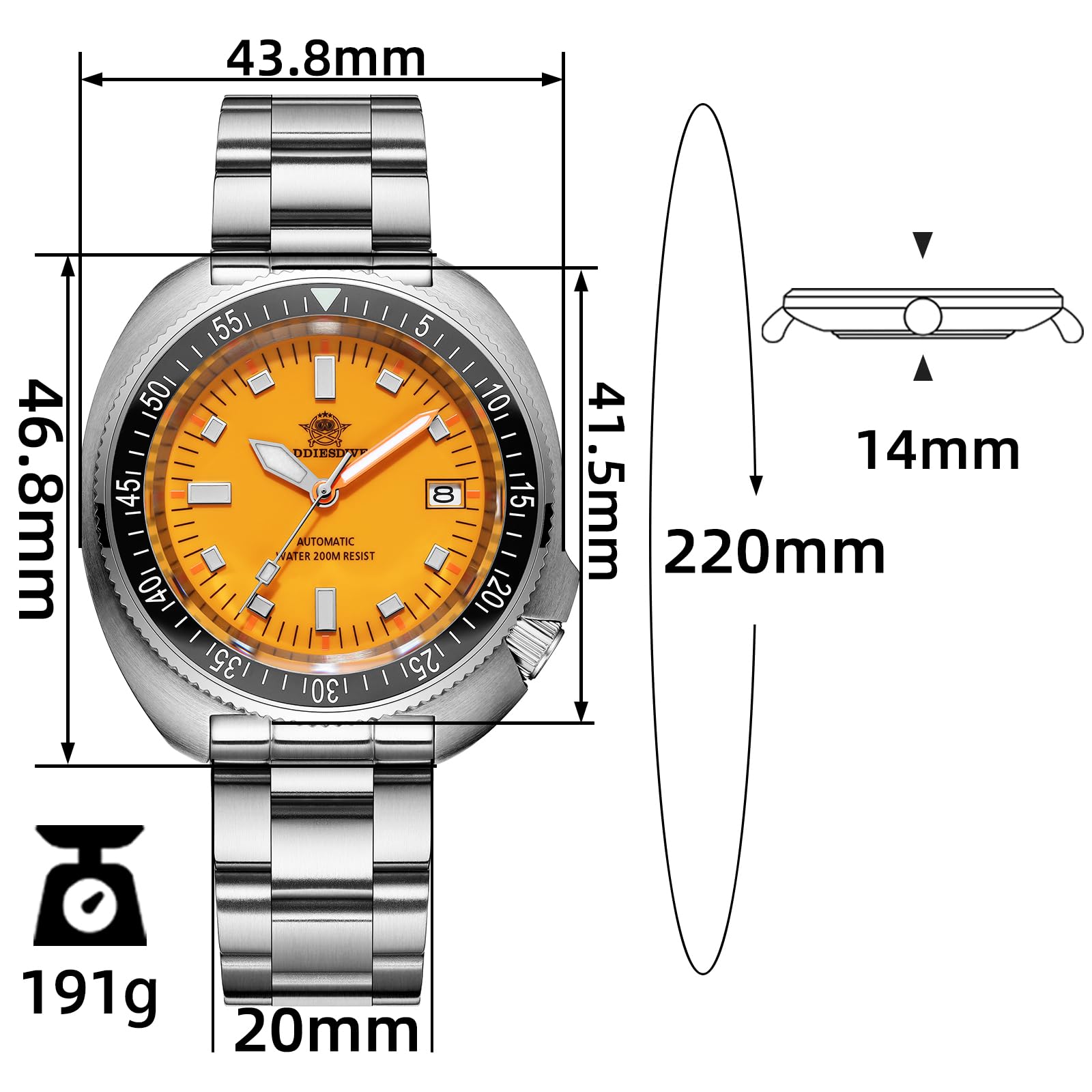 Dimensions: Case diameter 43.8 mm, bezel diameter 41.5 mm, lug to lug length 46.8 mm, case thickness 14 mm, crown diameter 7 mm, weight 191 g,lugs width 20 mm