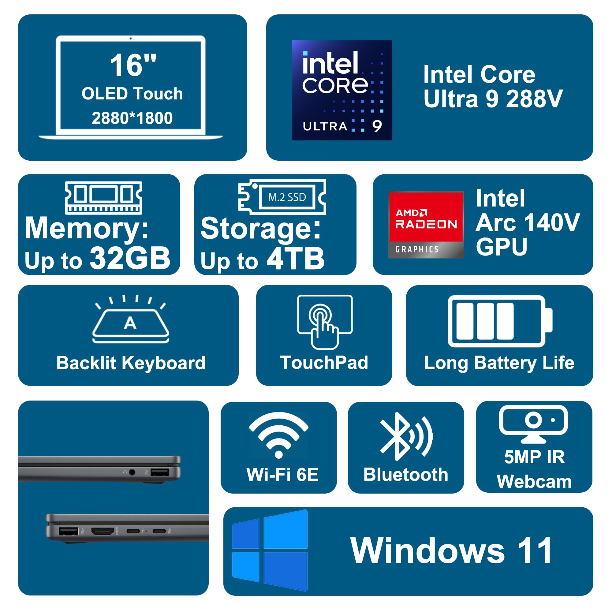 16" 3K (2880x1800) OLED Touchscreen (500nits HDR, 100% DCI-P3, 120Hz), Integrated Intel Arc 140V GPU