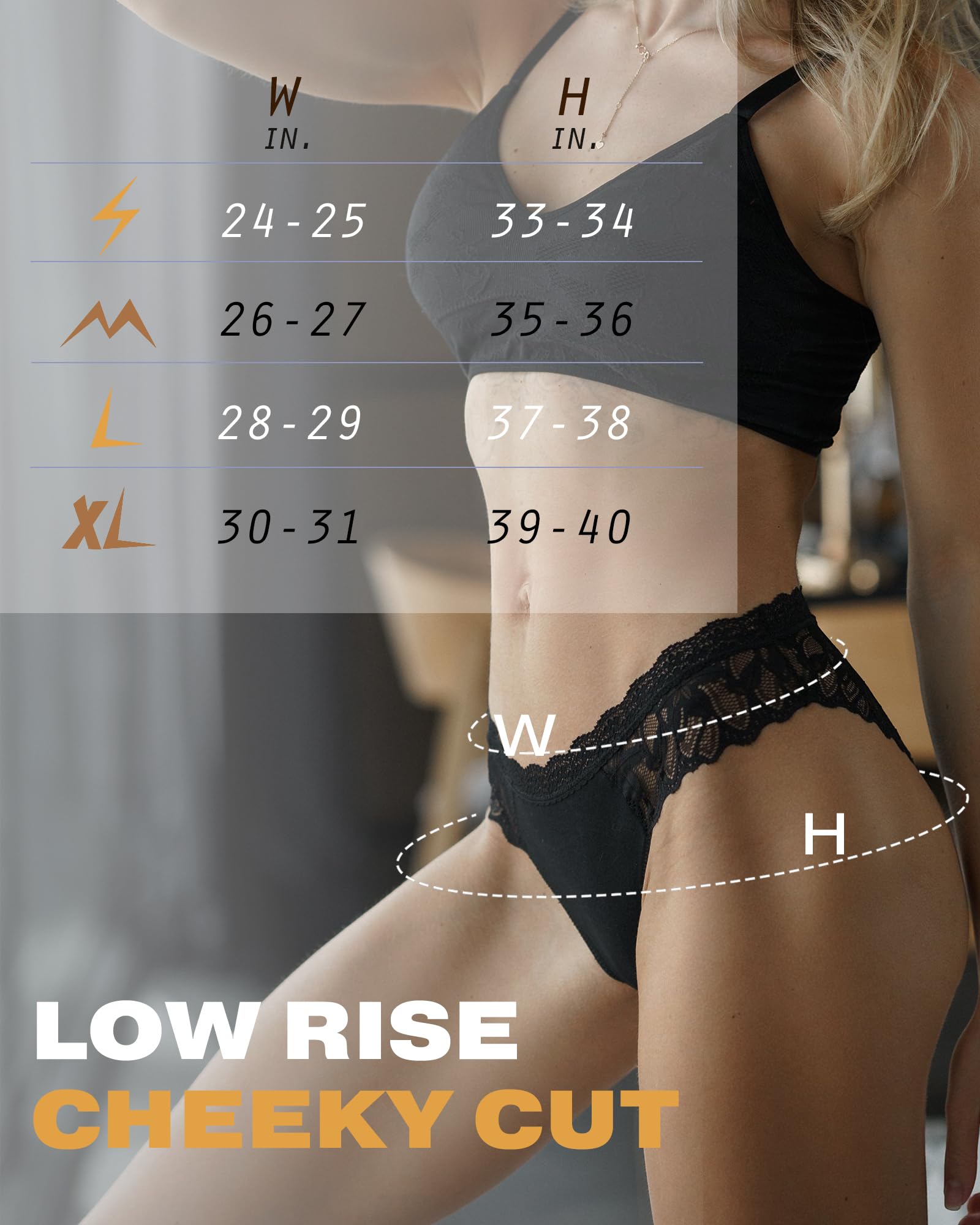 Lace Bikini Panties: [Waist Fit] S=24-25" M=26-27" L=28-29" XL=30-31". [Hip Fit] S=33-34" M=35-36" L=37-38" XL=39-40". Engineered to be your go-to sexy underwear, these lace panties fit like a "second skin". The low-rise waistband and sexy cheeky cut accentuate your natural silhouette without digging in.