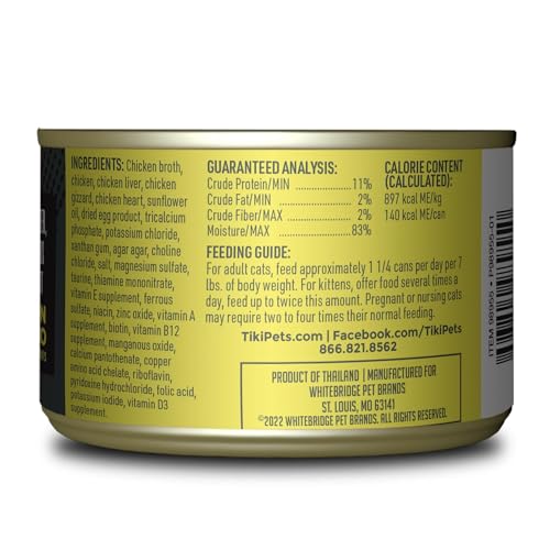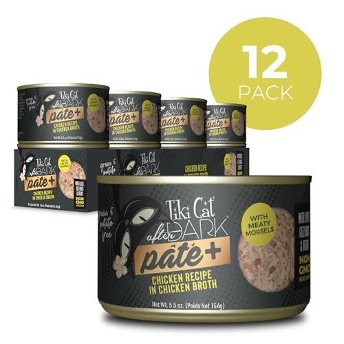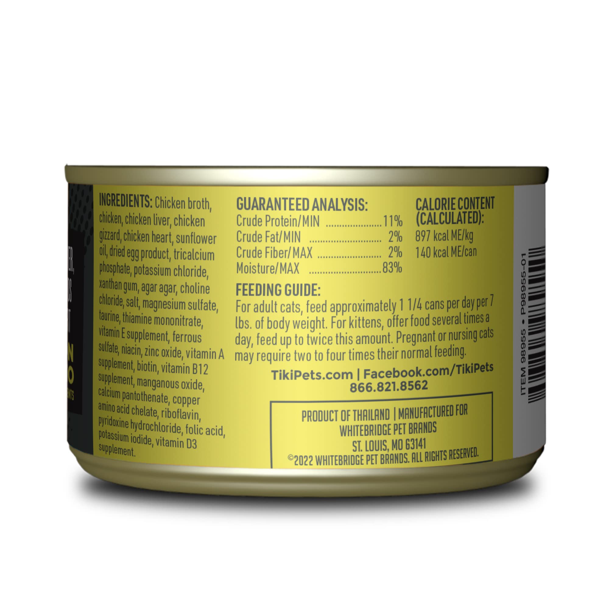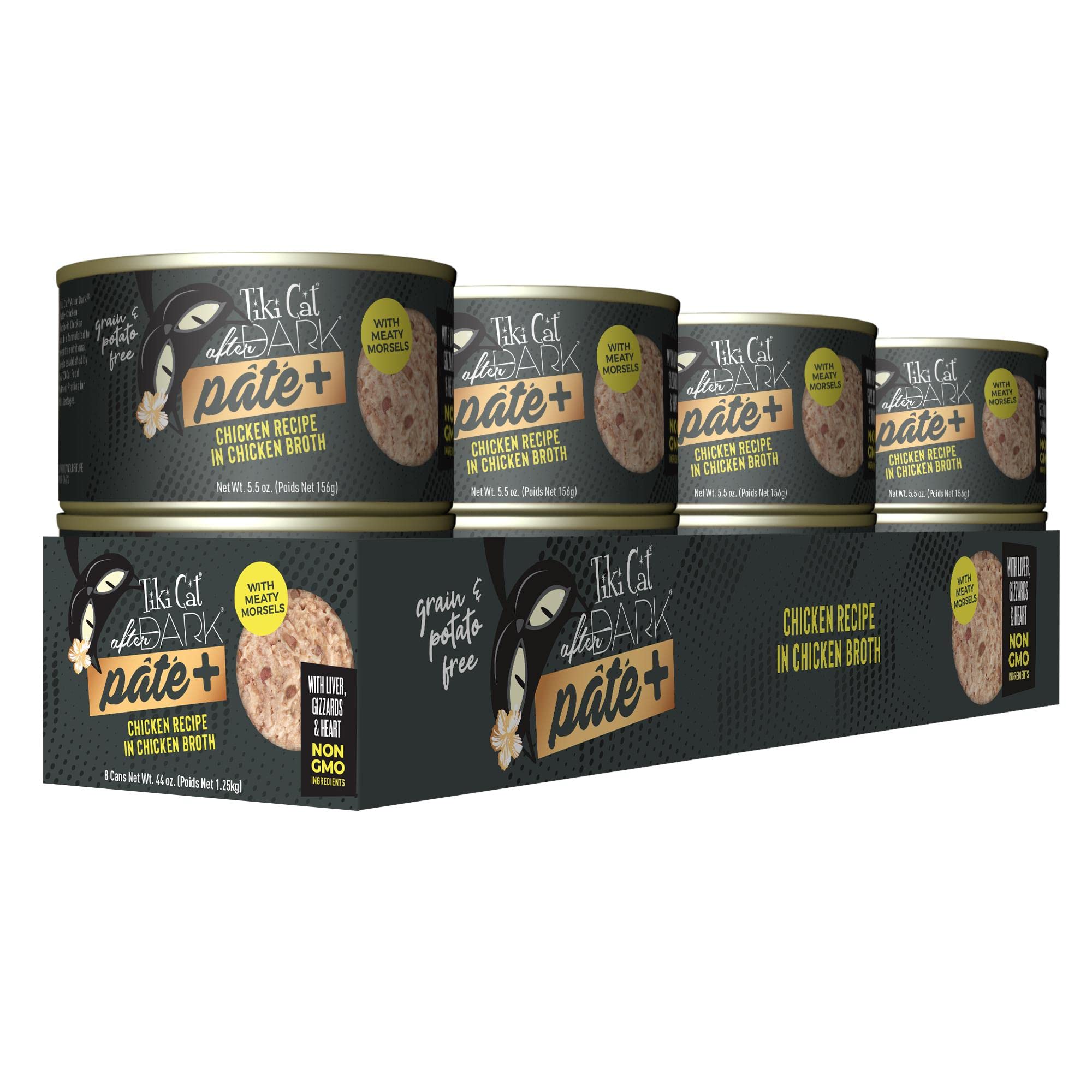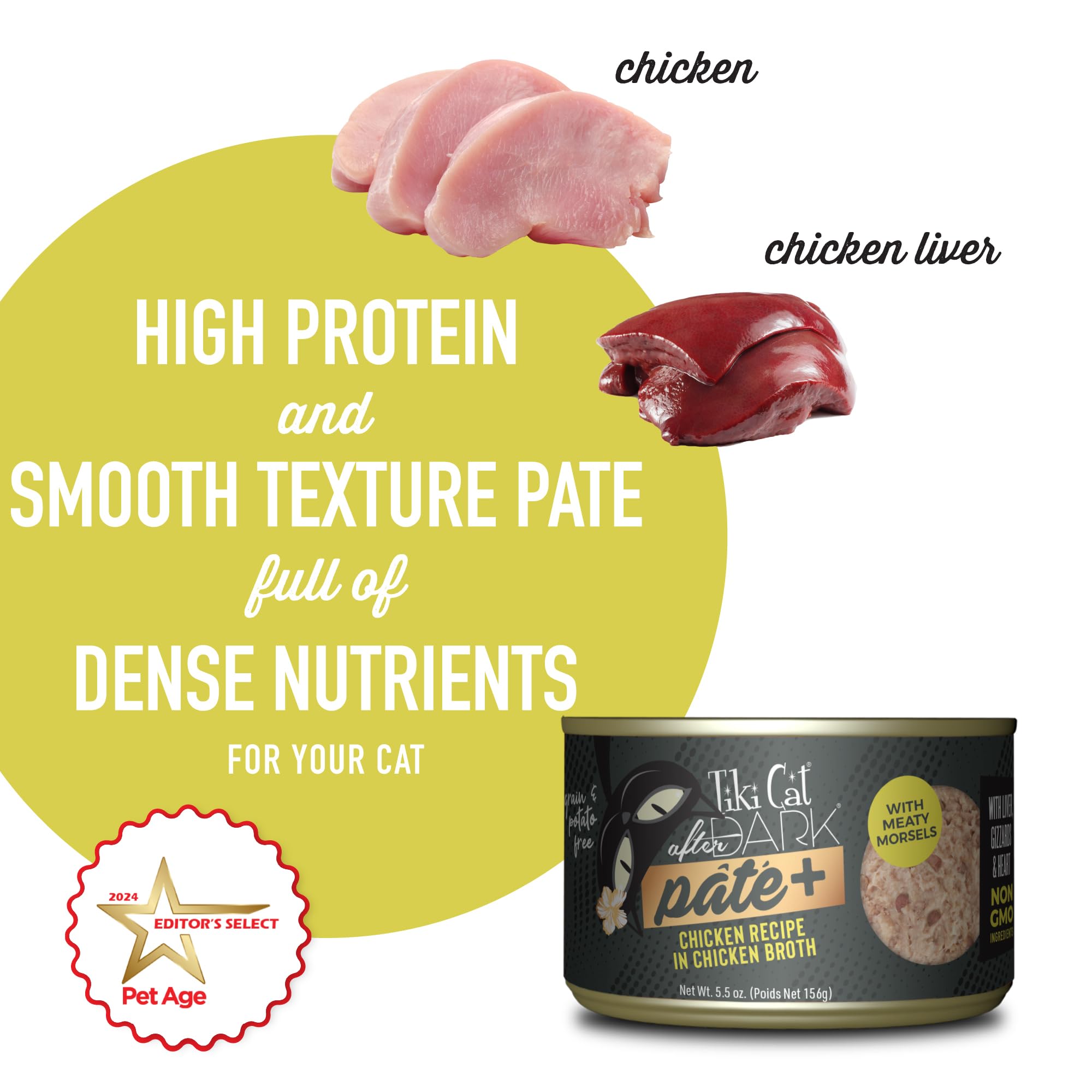 As obligate carnivores, cats have a natural instinct to hunt after dark and a nutritional need to eat meat. Tiki Cat® After Dark® Pâté+ is a meat-lover’s dream, closely mimicking cats’ natural prey diets. Real, finely minced chicken and meaty morsels of organ meat are combined with savory broth for the soft texture cats love. Give your carnivore cat the meat they crave in this tasty, easy-to-eat meal!