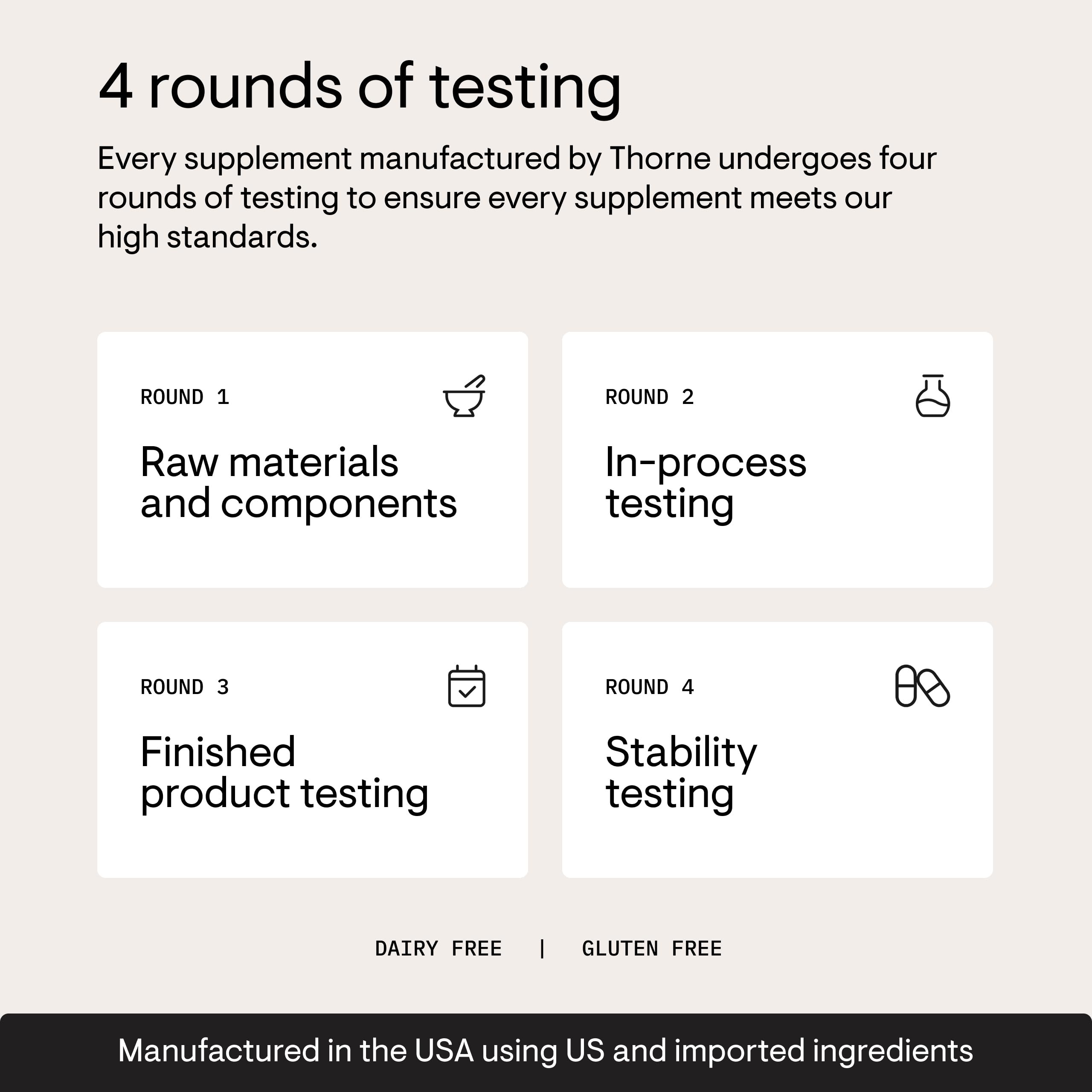 4 Rounds of Testing: Our state-of-the-art laboratories enable us to conduct 4 rounds of testing on every product, from analyzing the purity of raw materials to confirming the shelf life of finished formulas