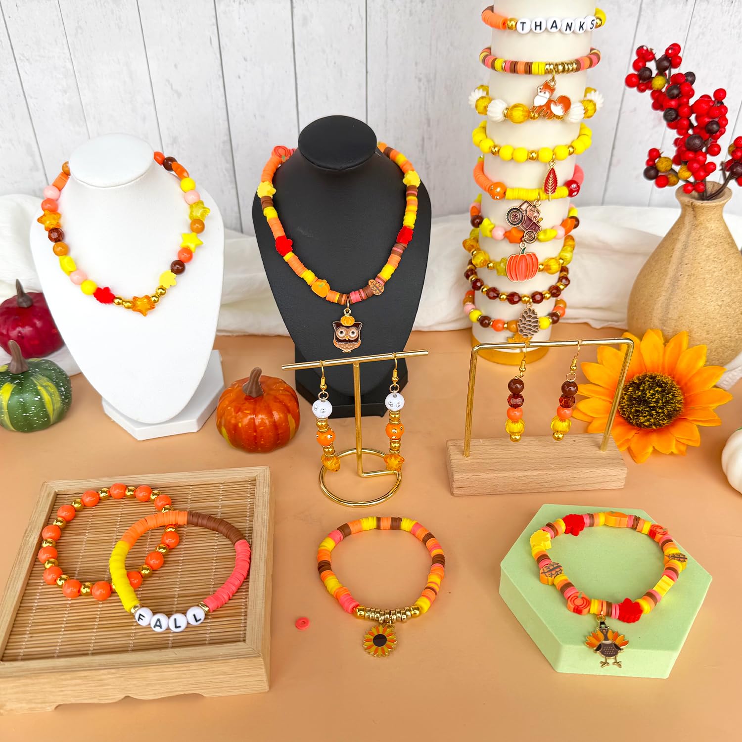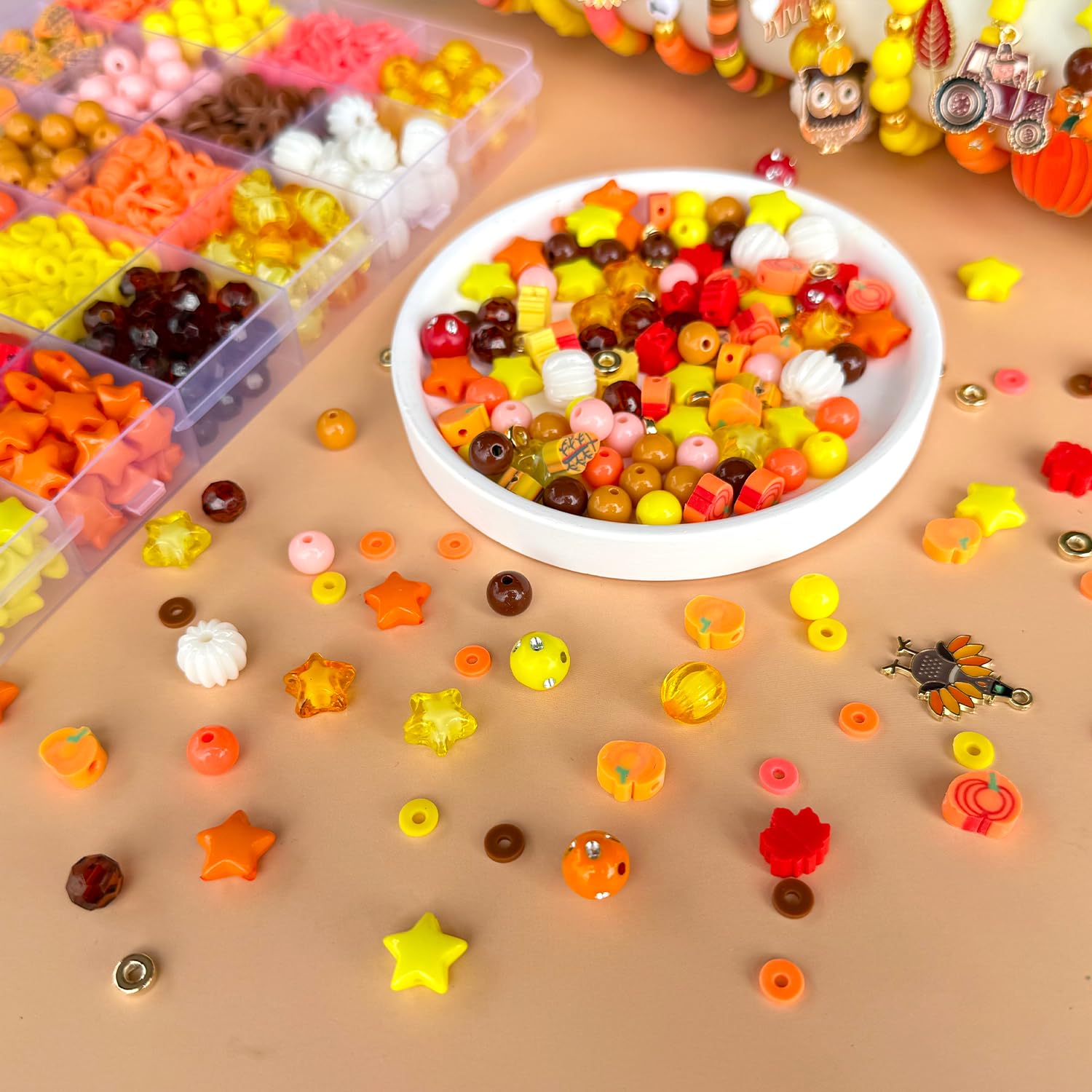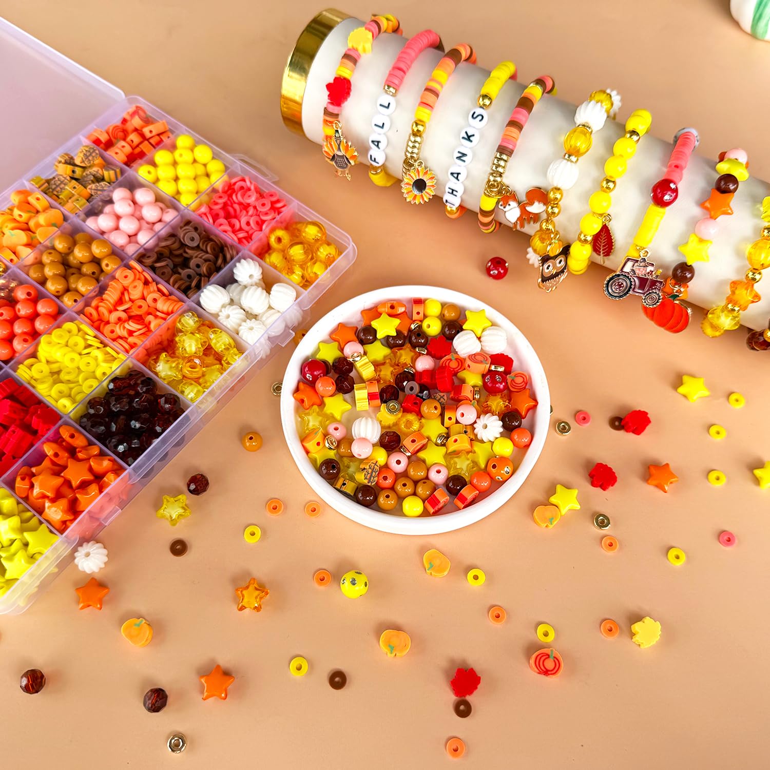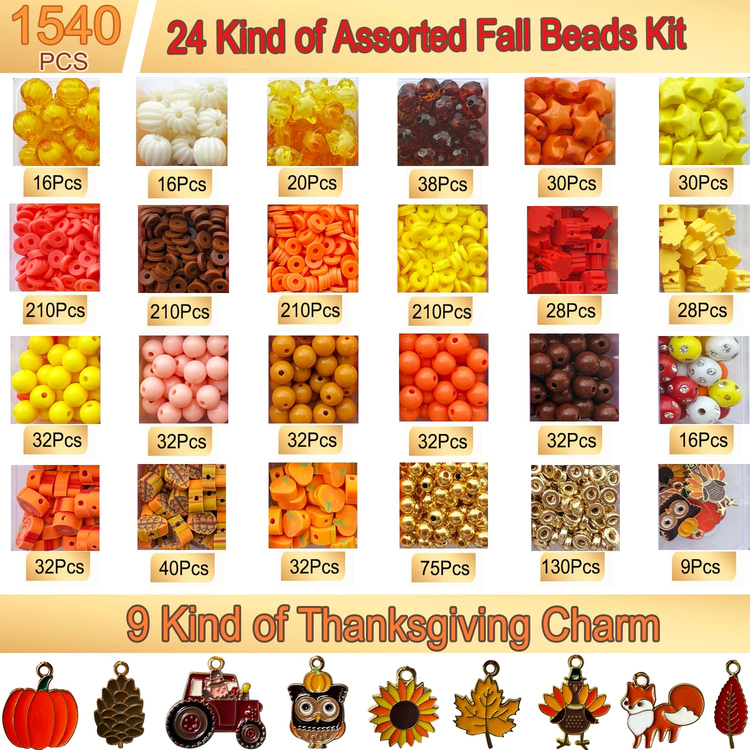 【Fall Bracelets Beads Kit】You will receive everything you need for Fall jewelry making with our fall beads charms kit. Including more than 1540pcs orange brown thanksgiving beads in 24 style, contains 840pcs+ polymer clay beads in 4 colors, 160pcs pumpkin maple leaf cly beads in 5 style, 160pcs 8mm round beads in 5 color, 80pcs star beads, 32pcs pumpkin beads, 38pcs crystal beads, 16pcs Rhinestone Beads, 205pcs gold spacer beads; 9pcs fall charms contains pumpkin, maple leaf, turkey, squirrel, acorn, sunflower, truck, owl etc.